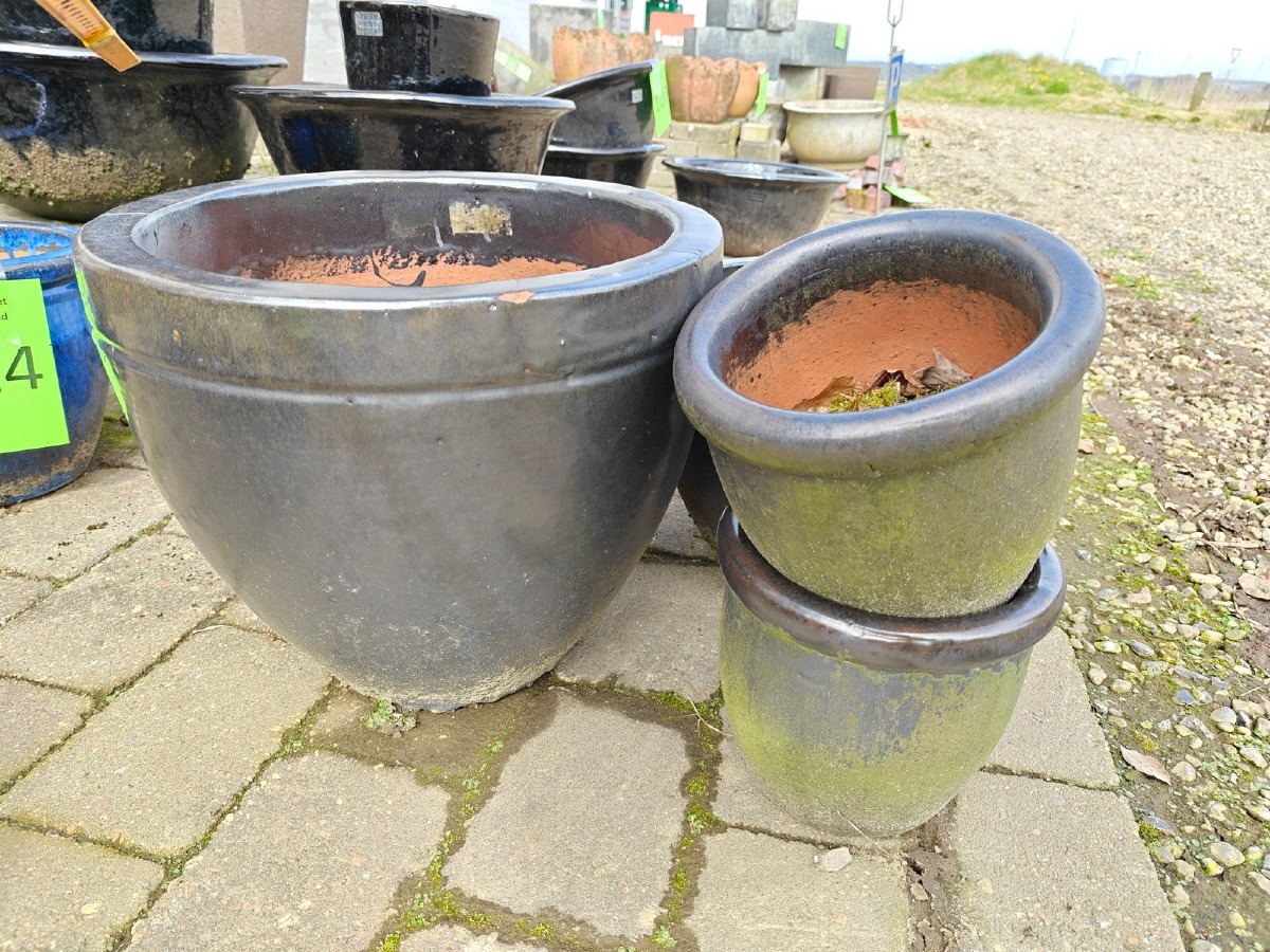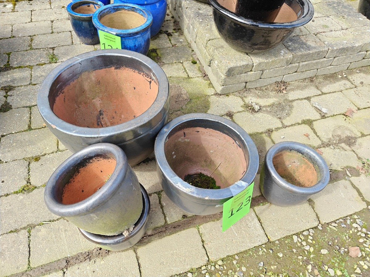5 krukker med matgrå glasur. Største:  30 x 37 cm. Varen stammer fra en nedlagt brugskunst-butik. Eventuelle brugsspor kan forekomme.