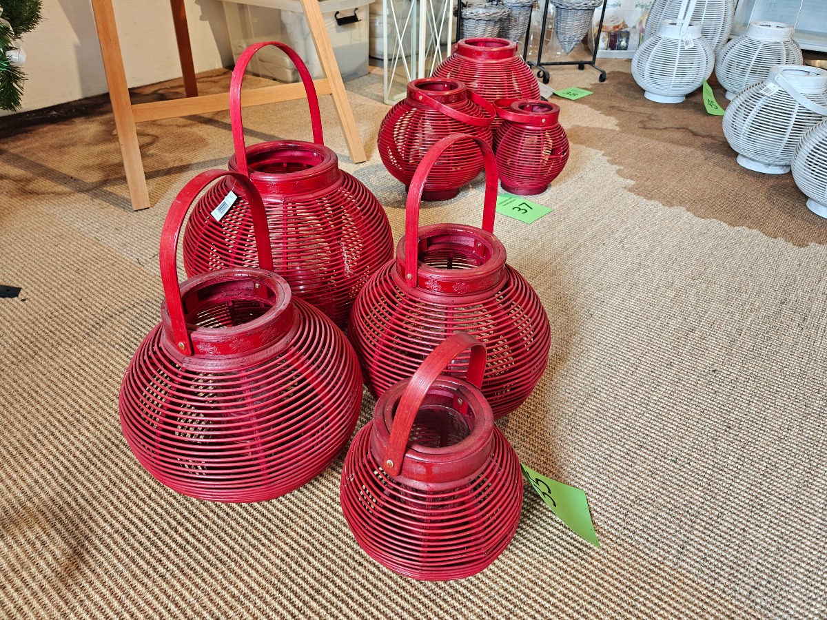 3 røde lanterner af rattan. Ene med skade. Varen stammer fra en nedlagt brugskunst-butik. Eventuelle brugsspor kan forekomme.