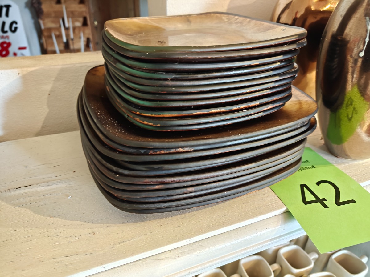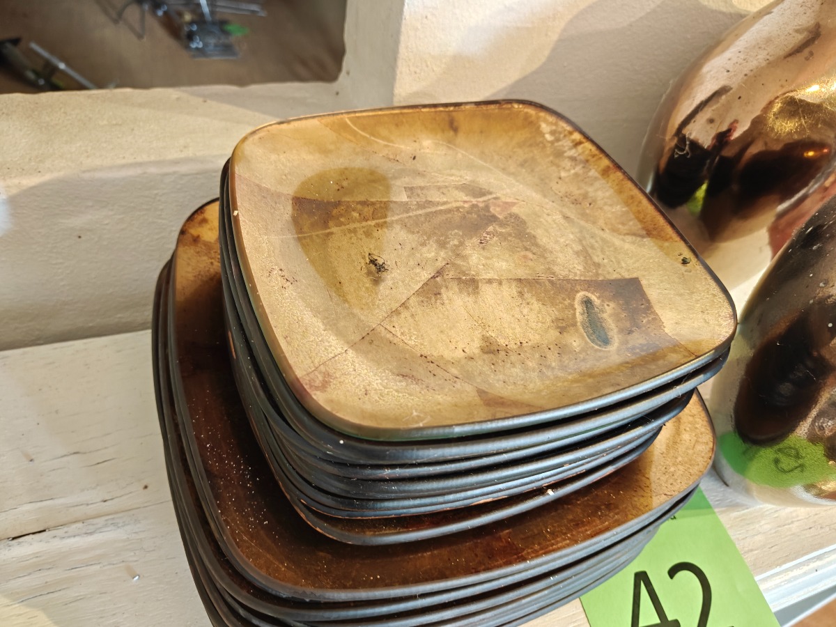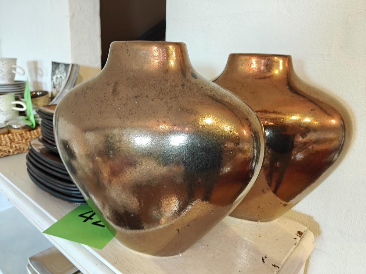 Gyldne glastallerkner og vaser Varen stammer fra en nedlagt brugskunst-butik. Eventuelle brugsspor kan forekomme.