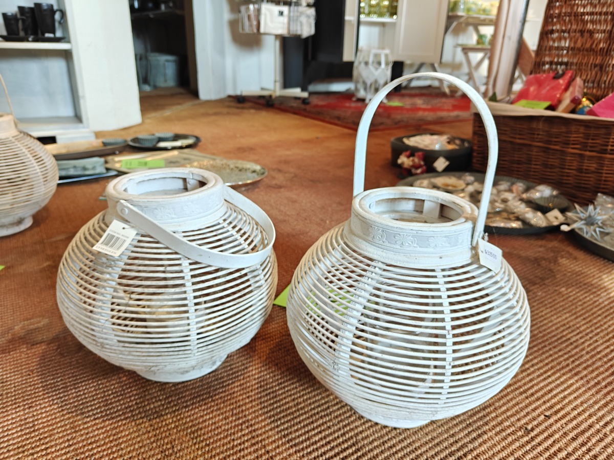 2 lanterner af hvidmalet rattan. Varen stammer fra en nedlagt brugskunst-butik. Eventuelle brugsspor kan forekomme.