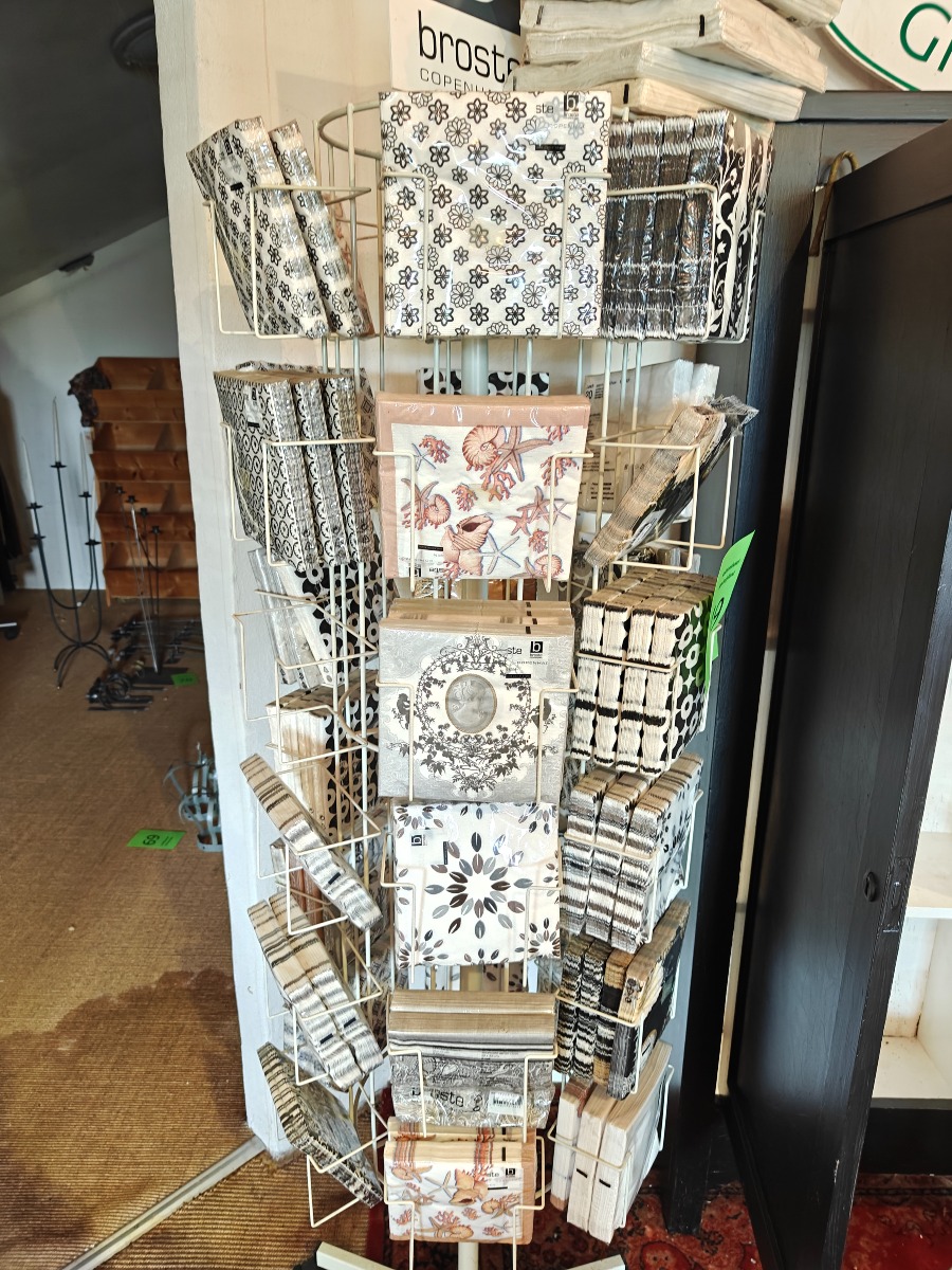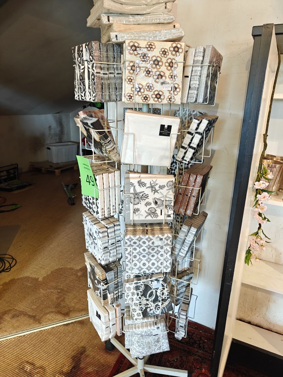 Servietter inkl. stativ. Varen stammer fra en nedlagt brugskunst-butik. Eventuelle brugsspor kan forekomme.