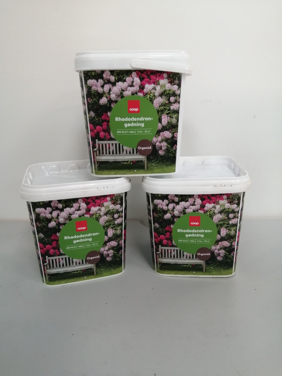 3 x 5 liter Rhododendron-gødning fra Coop. Organisk NPK 10-2-7 + mikronæring. Hver spand = 50m2. Gødningen kan også anvendes til andre surbundsplanter. Spandene er uåbent.