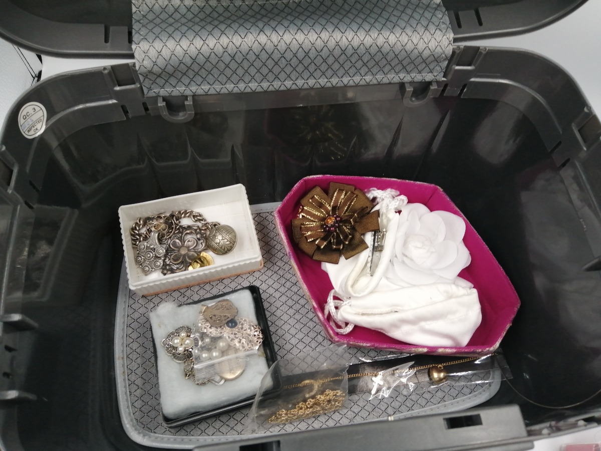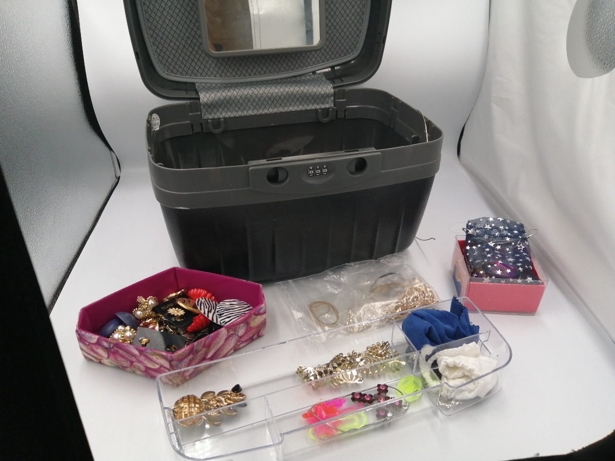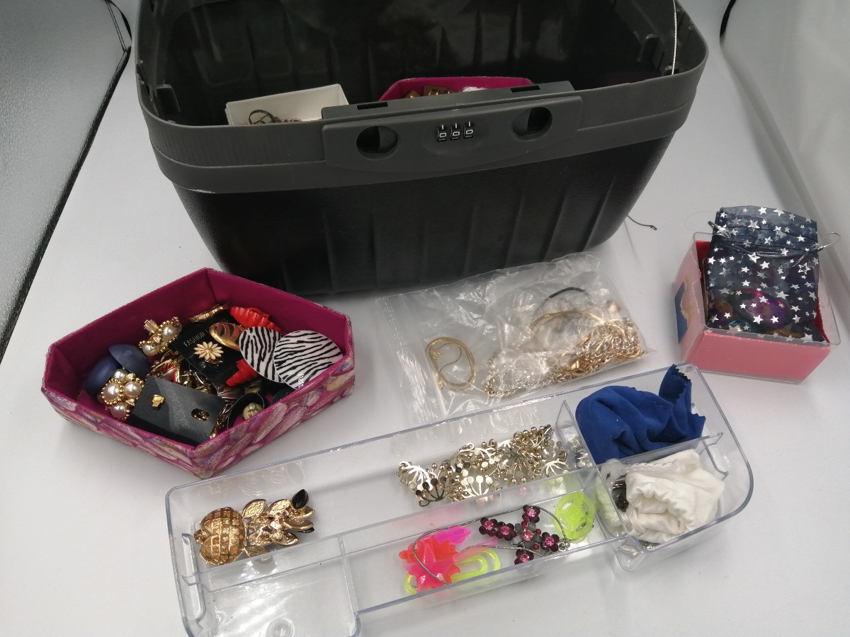 Fin beautybox med diverse bijouteri og souvenir smykker. Kæder - nogle nye, armbånd, brocher øreclips m.m