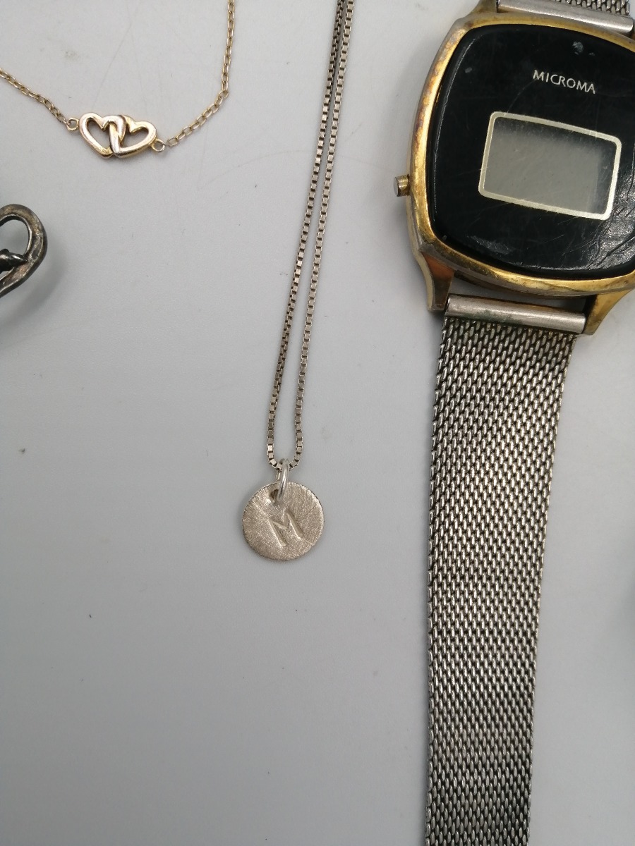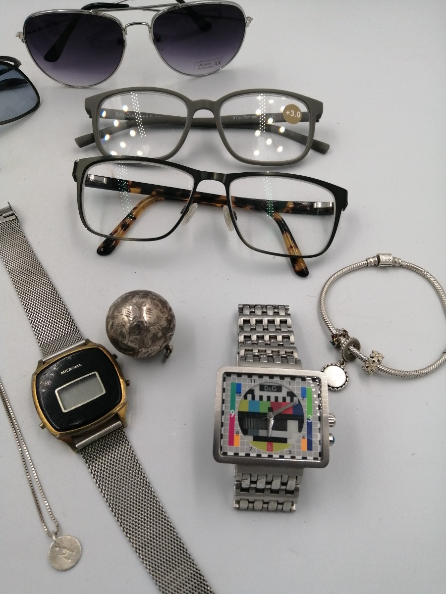 Diverse bitjorie smykker og briller - solbriller, læsebriller, 3 stk. ure med en del brugsspor, halskæde med M, hjertearmbånd, pandora armbånd mm. Brugt.