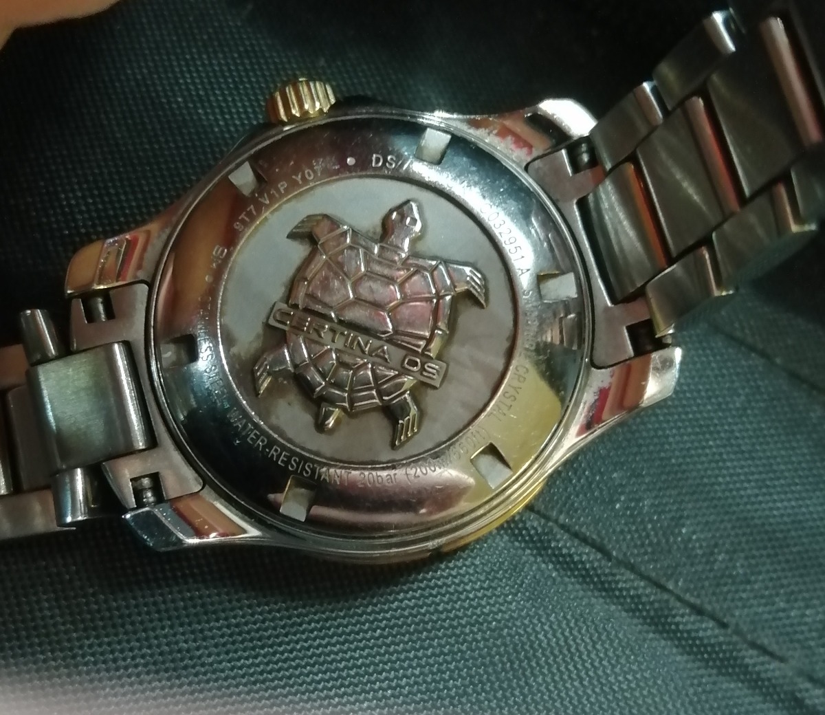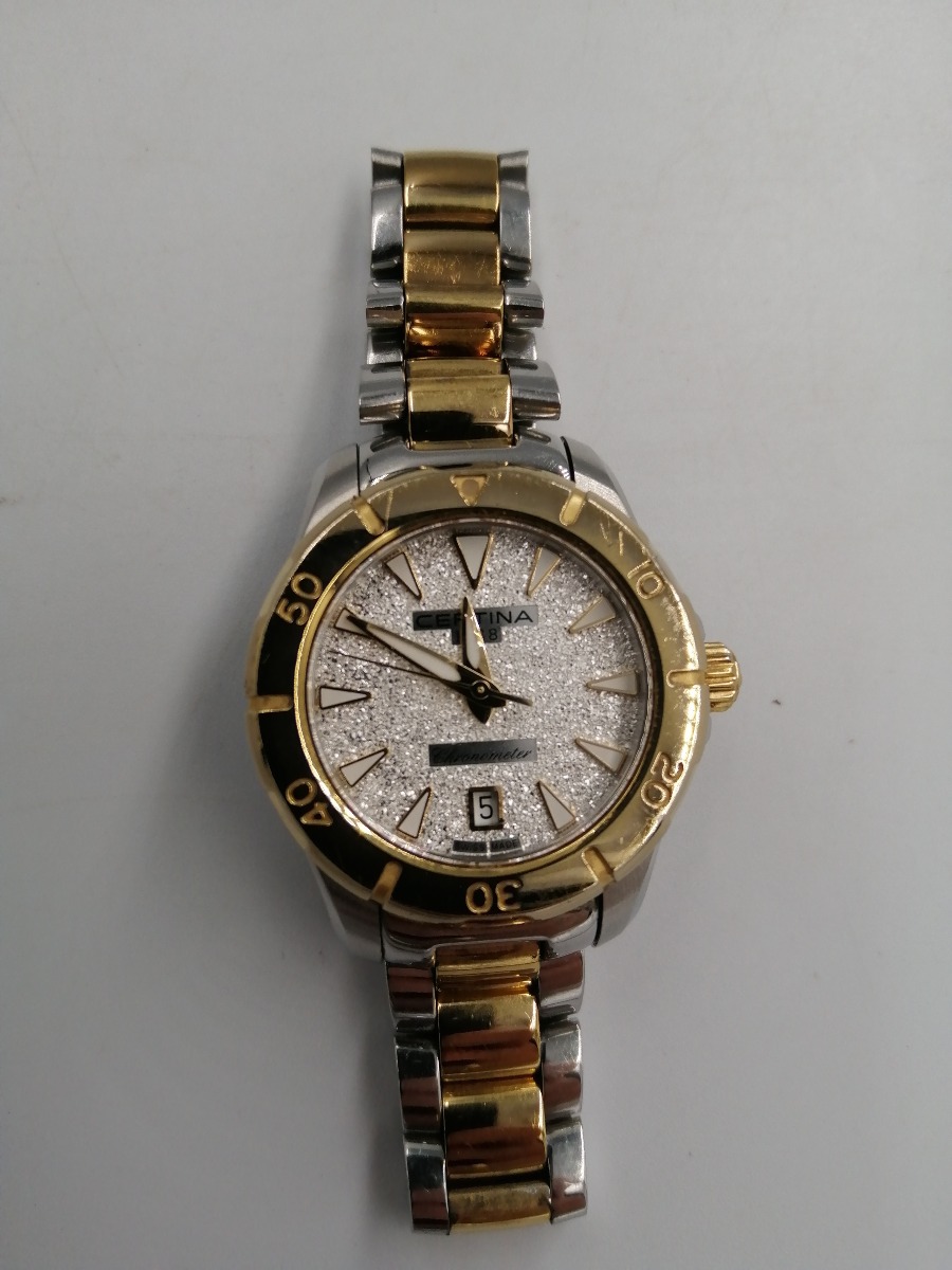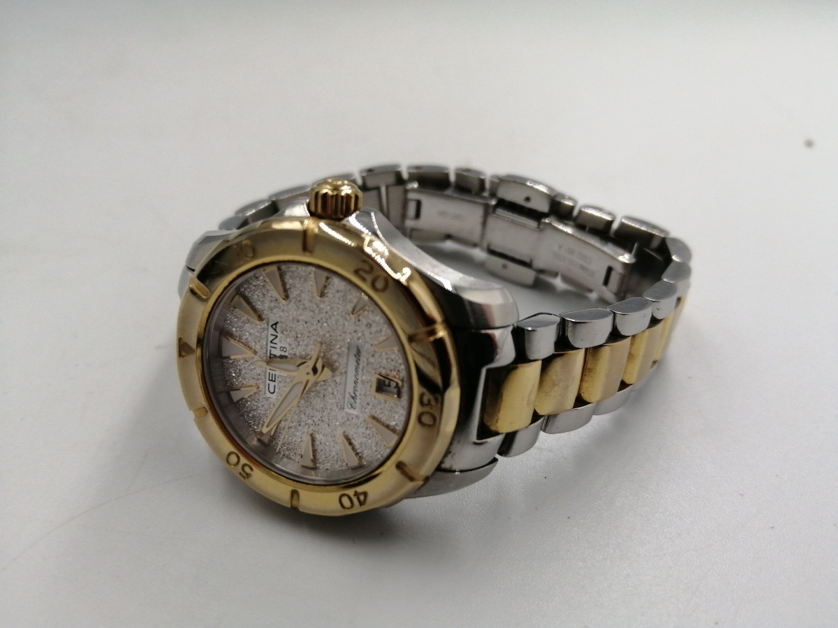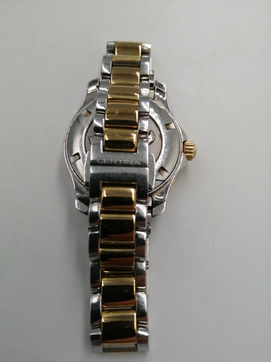 Certina 1888 dameur (ikke ægte guld) med safirglas. Det er vandtæt ned til 200 meter. Med diverse brugsspor. Hittegods