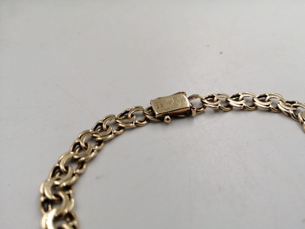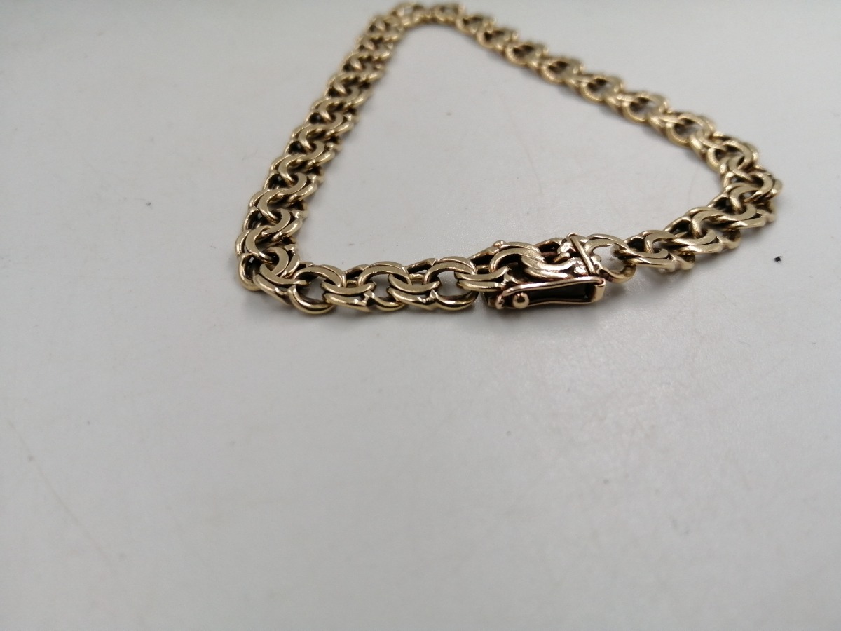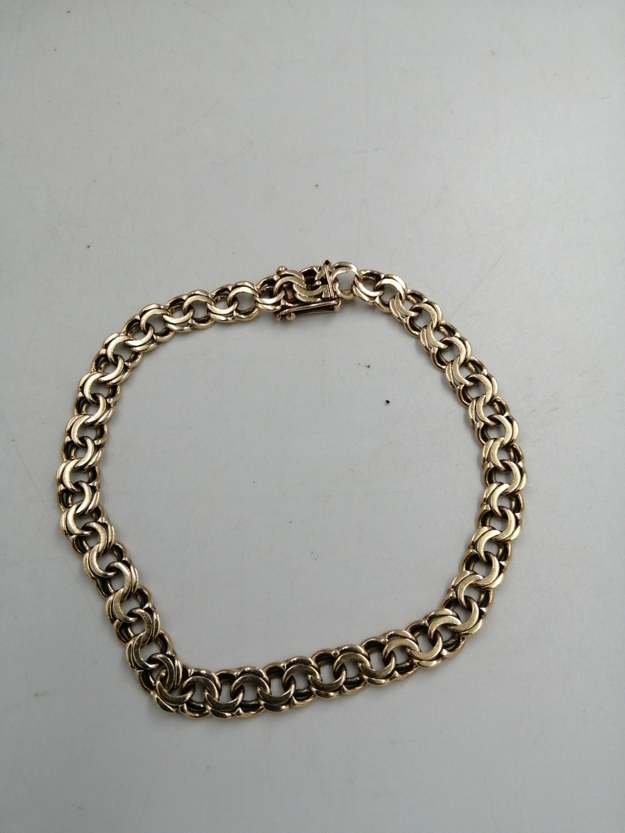 Bismark kæde / armbånd, 8 karat. Den er en smule slidt og låsen mangler sikkerhedslås på den ene side. Vægt: 11 gram. Er 21 cm langt og 7 mm. i bredden. Med brugsspor. Hittegods.