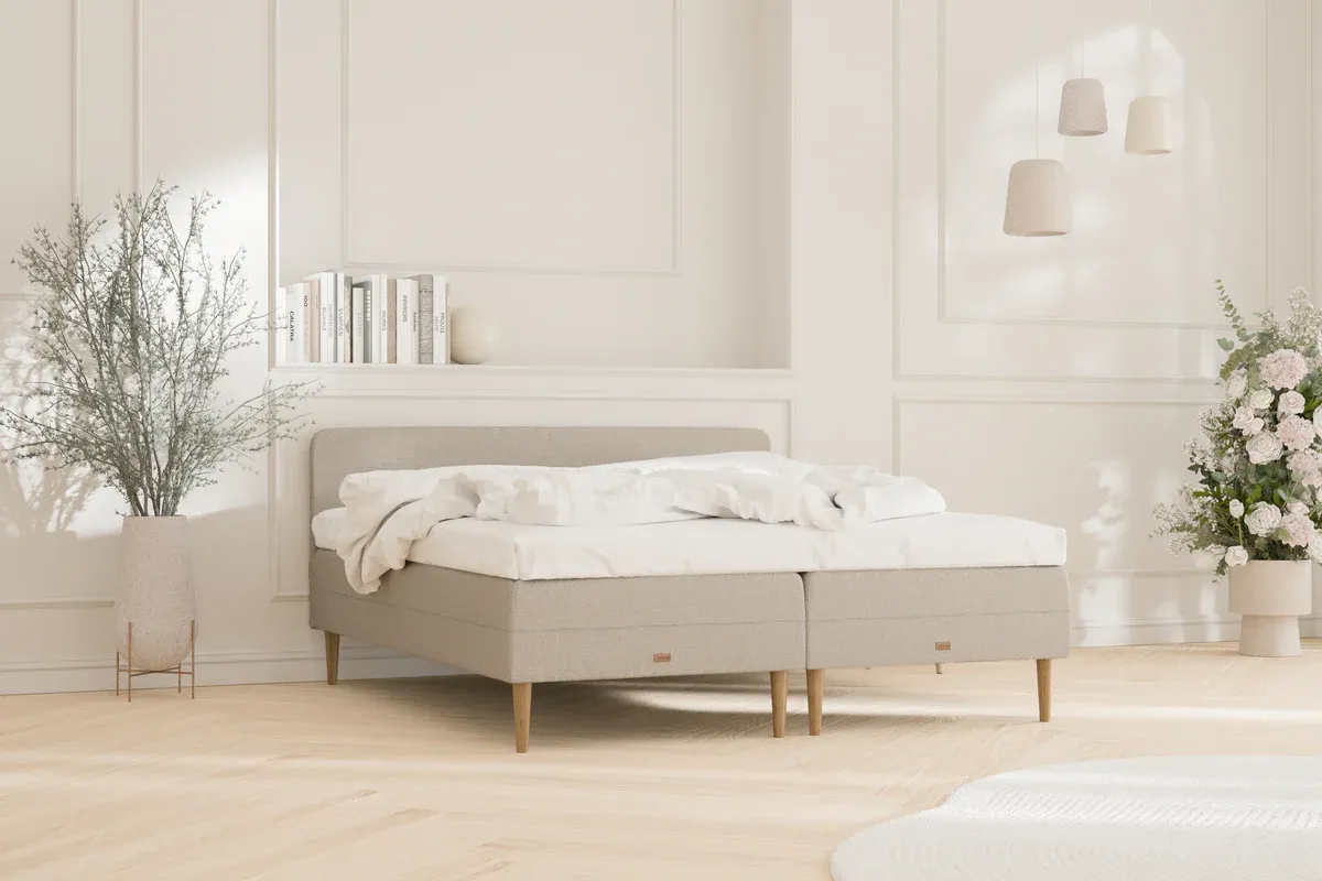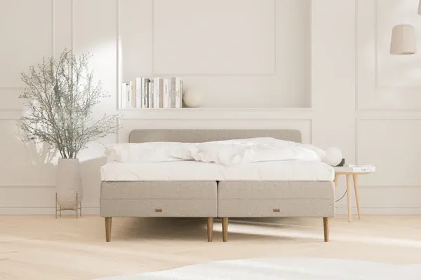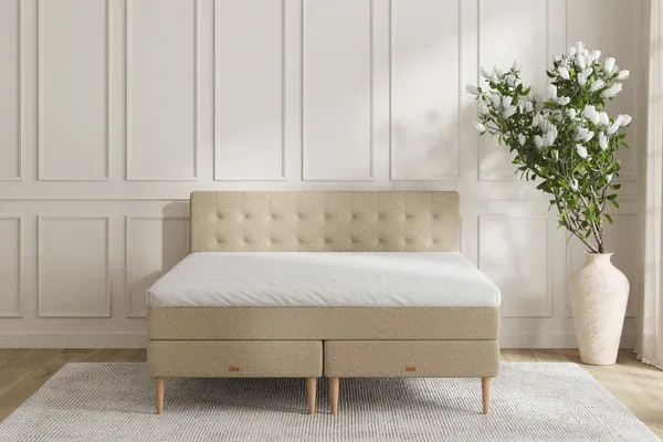 Boxmadras 180x200. Bestående af to stk 90x200 madrasser. - 270 lommefjedre pr. m² for individuel tilpasning og støtte. 7 komfortzoner for ergonomisk aflastning. 15 cm høje lommefjedre med 1,8 mm trådtykkelse. 2,5 cm T-2535 komfortskum med medium-fast følelse. Total højde på 44 cm for et eksklusivt look og høj liggekomfort. Fasthed: Højre og venstre side: medium, anbefalet op til 95 kg. Topmadras: Deluxe to i én – 10 cm topmadras af memory- og koldskum. Fremragende trykaflastning, der giver optimal støtte og komfort, og hjælper med at lindre muskel- og ledsmerter. Gavl: SÖVNN Soho Sengegavl - Sand - 180x107.