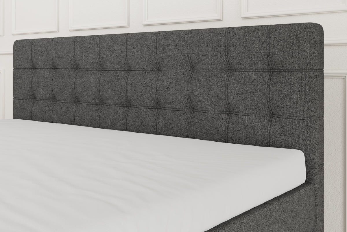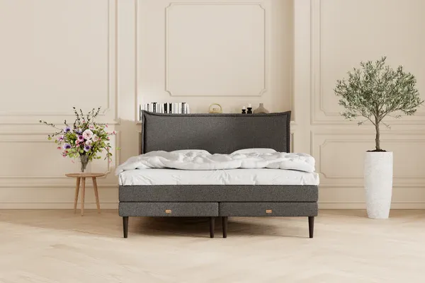 180x200 kontinentalseng. Boxmadras: 12x3 cm massiv træramme, 4 cm RG-skum og quiltet top med 100 g fiberfyld (18 cm høj). Springmadras: 13 cm ommefjedre (1,8 mm), 5 cm T-2535 komfortskum, 7 komfortzoner (21 cm høj) for ergonomisk støtte,. 280 lommefjedre pr. m² for rolig og stabil liggekomfort. Dansk design med et minimalistisk udtryk. Nem montering – kræver ikke værktøj. Fasthed: Højre og venstre side: medium, anbefalet op til 95 kg. Topmadras: Mosi. 6 cm topmadras af koldskum. Medium fasthed, der sikrer optimal støtte og komfort, samtidig med at den former sig efter kroppen og beskytter din madras for længere levetid. Topmadrassen er fremstillet af punktelastisk koldskum (HR-3532), der giver en god, fast støtte og forbedrer din liggekomfort. Gavl: SÖVNN Soho Sengegavl - Grå - 180x107