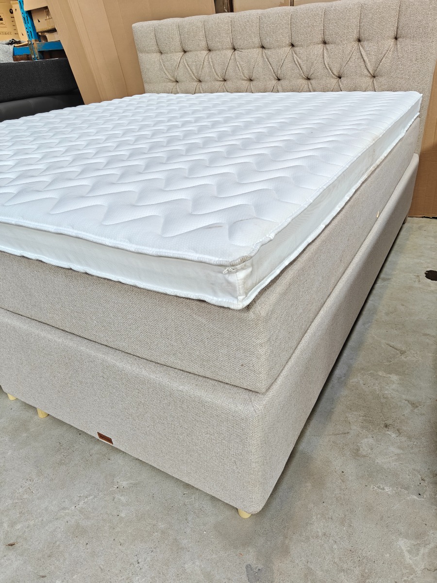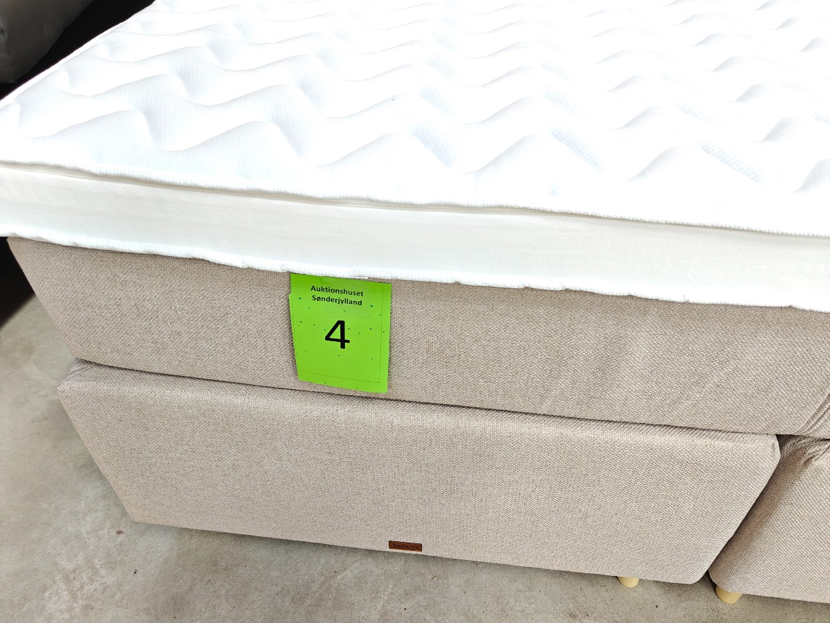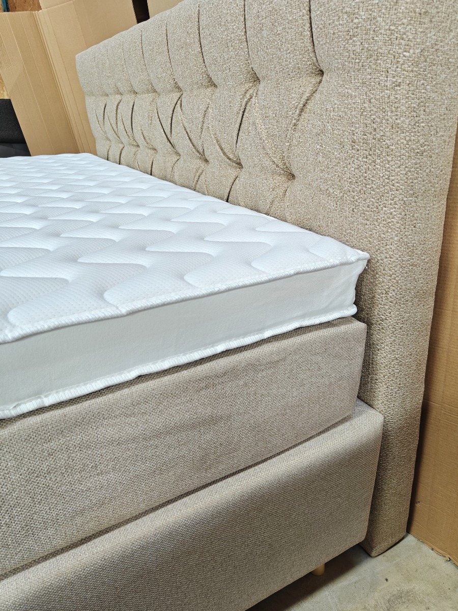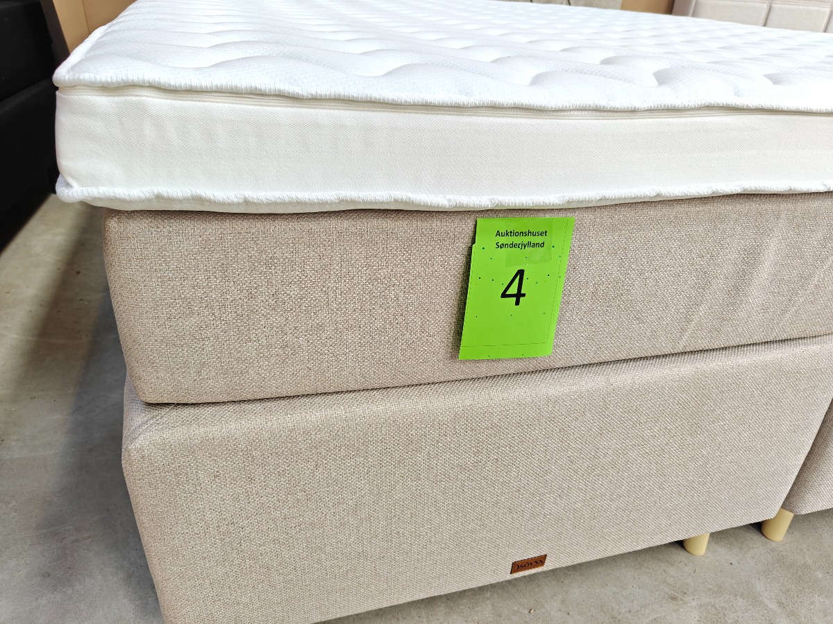 SÖVNN Kontinentalseng - 180x200 - Lys beige - med gavl og topmadras, ekstra tyk. Udgået model og været brugt som udstillings model. Der må forventes små skrammer og at de kan være beskidte og skal rengøres. Stået på ekstern lager i et stykke tid. Vi anbefaler at komme til eftersyn. Salg for virksomhed.