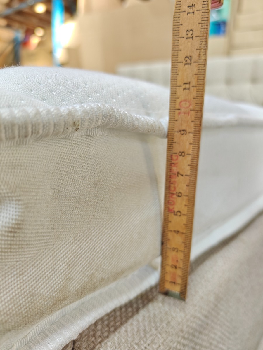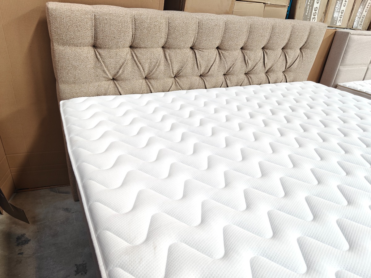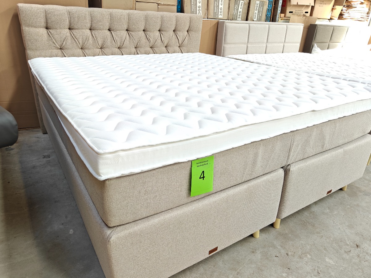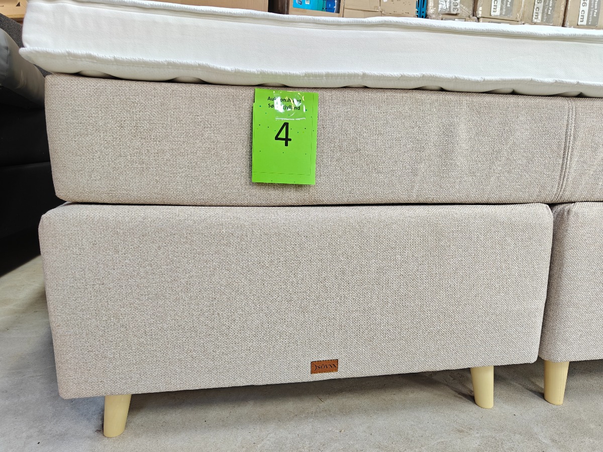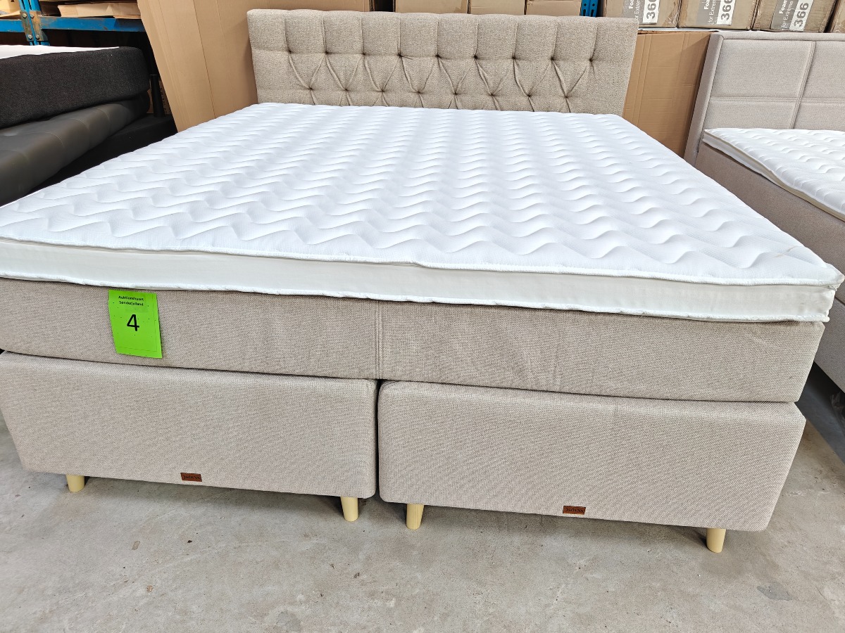 SÖVNN Kontinentalseng - 180x200 - Lys beige - med gavl og topmadras, ekstra tyk. Udgået model og været brugt som udstillings model. Der må forventes små skrammer og at de kan være beskidte og skal rengøres. Stået på ekstern lager i et stykke tid. Vi anbefaler at komme til eftersyn. Salg for virksomhed.