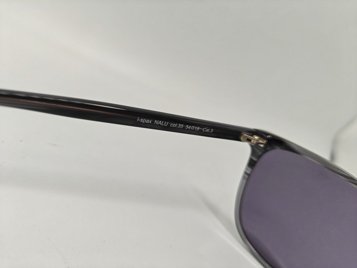 I-Spax Nalu solbrille med stel i grå toner og violette glas. Brillerne er nye og ubrugte.