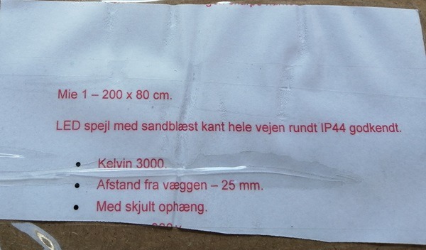 Mie 1 spejl med super flot LED lys ramme, som giver et godt lys. Mål: 200 x 80 cm. IP44 godkendt. Lyset kommer fra en LED strip, som sidder på rammen på bagsiden af spejlet. Skjult ophæng og afstand til væg er 25 mm. Det lyser ud til siden, ind på væggen og ud igennem den yderste kant af spejlt, som er frostet. Spejl tykkelse: 4 mm. Med polerede kanter, så ingen skarpe kanter. Spejlet tilkobles en ekstern kontakt - 230 v. Kelvin 3000. Ubrugt, oprydning fra køkken/bad butik. Original emballage. +MOMS