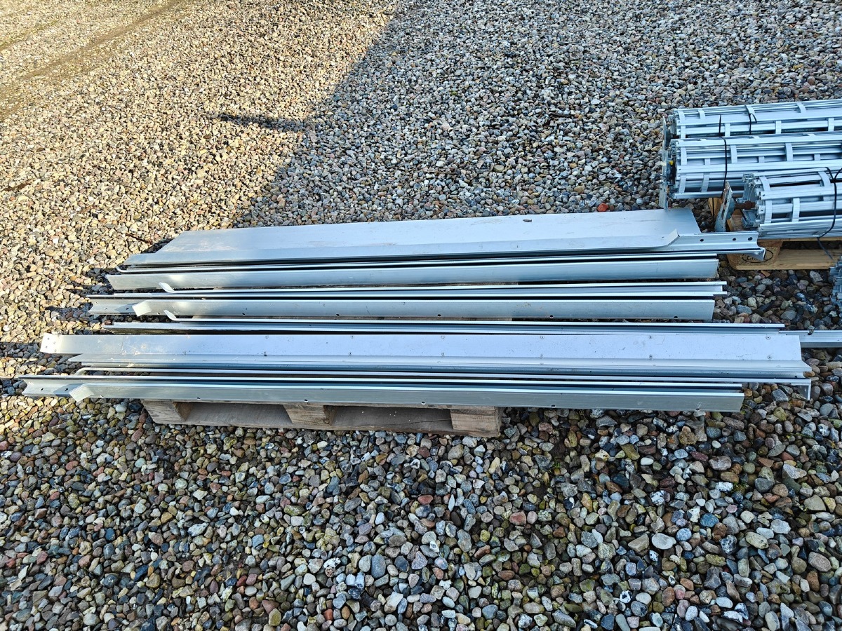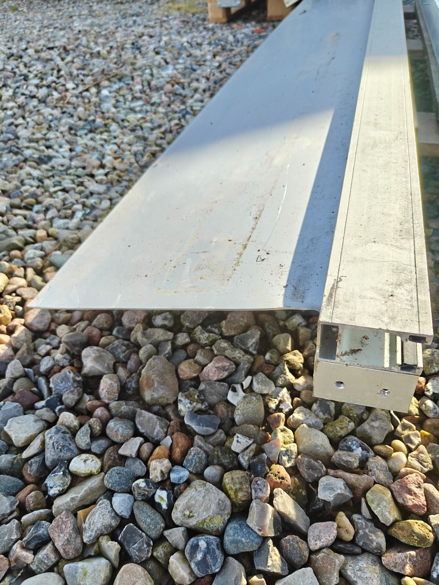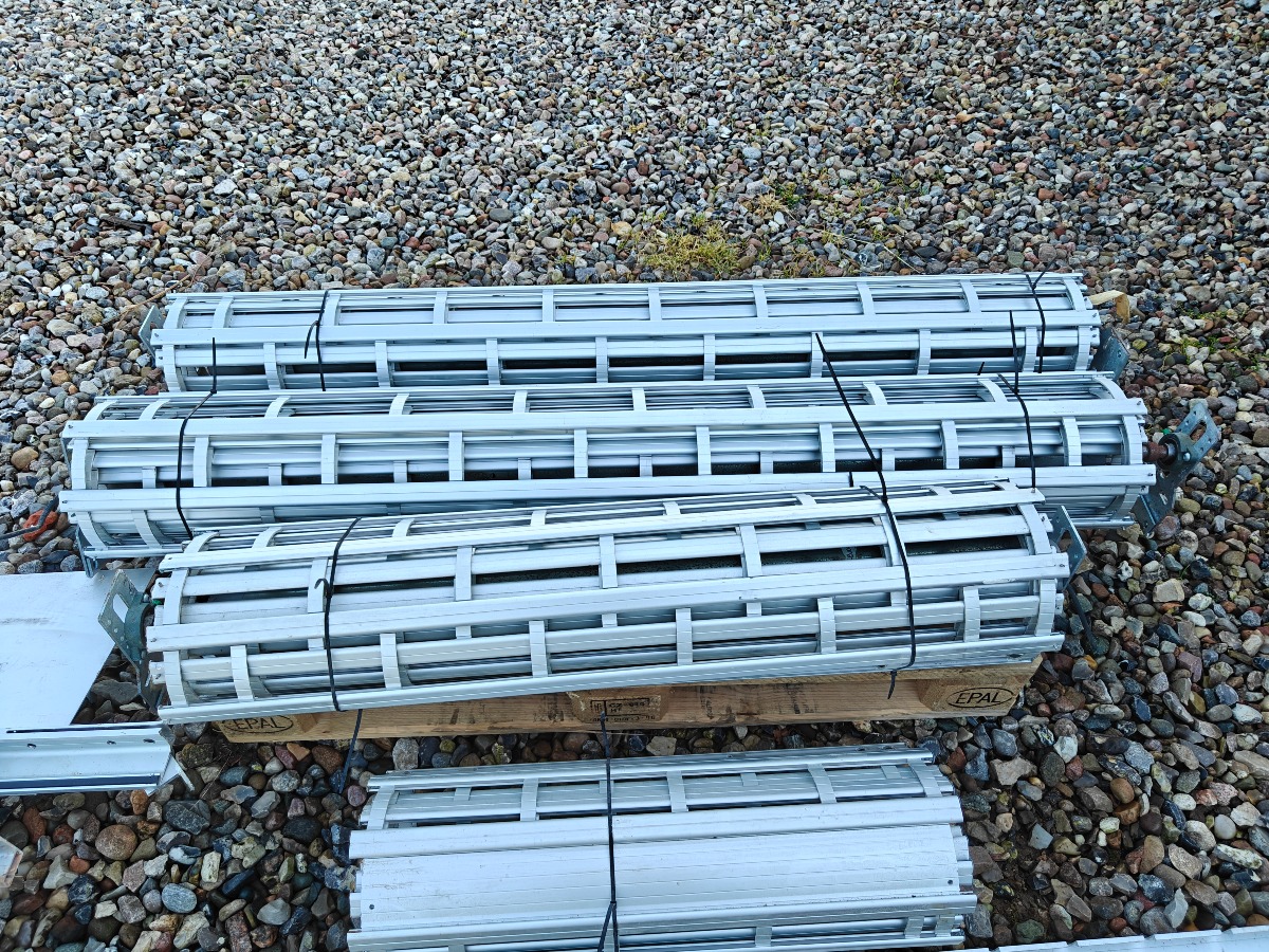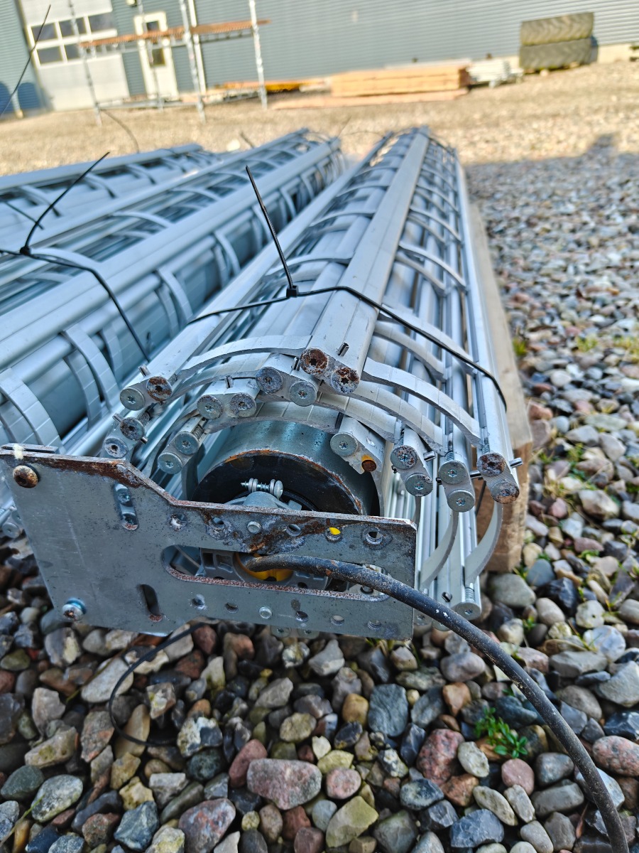 Rullegittersikring fra kronborg sikring 2 stk ruller a` 160 cm i breden  montage bredde er 175 cm 1 rulle a` 125 cm i bredden montage bredde er 140 cm. Div styreskinner ca. 127 cm lange, pæn stand.  Salg fra virksomhed