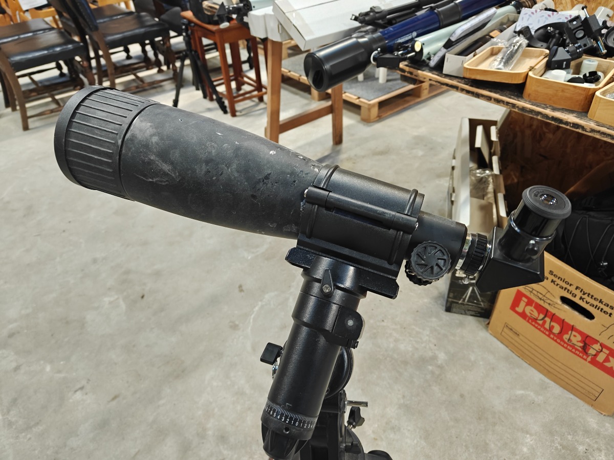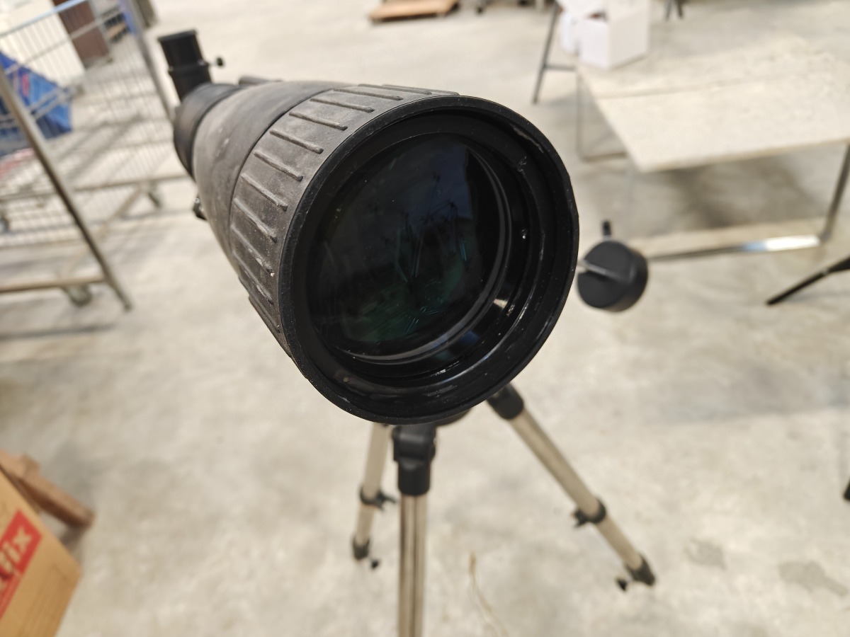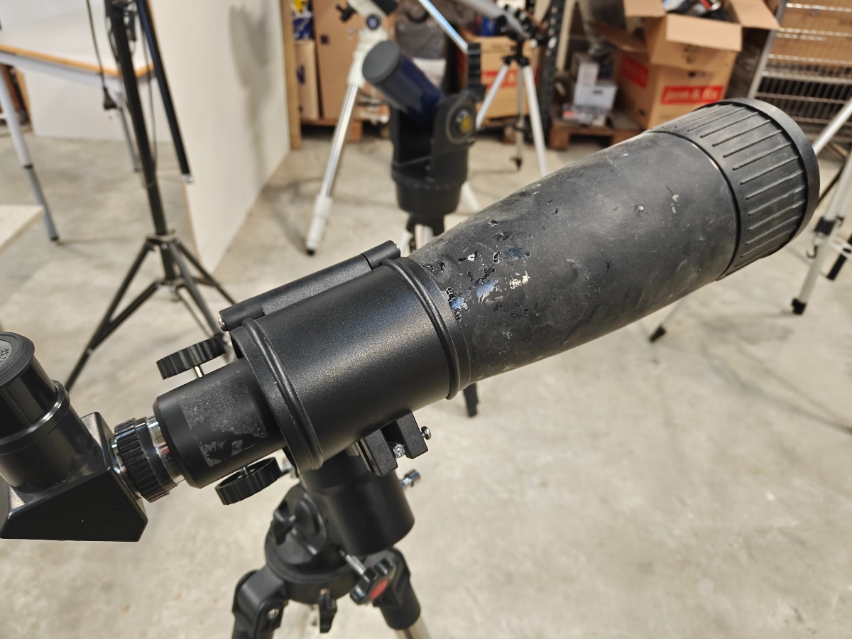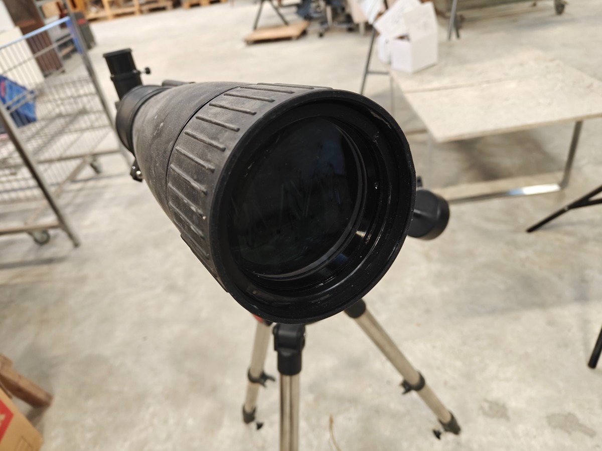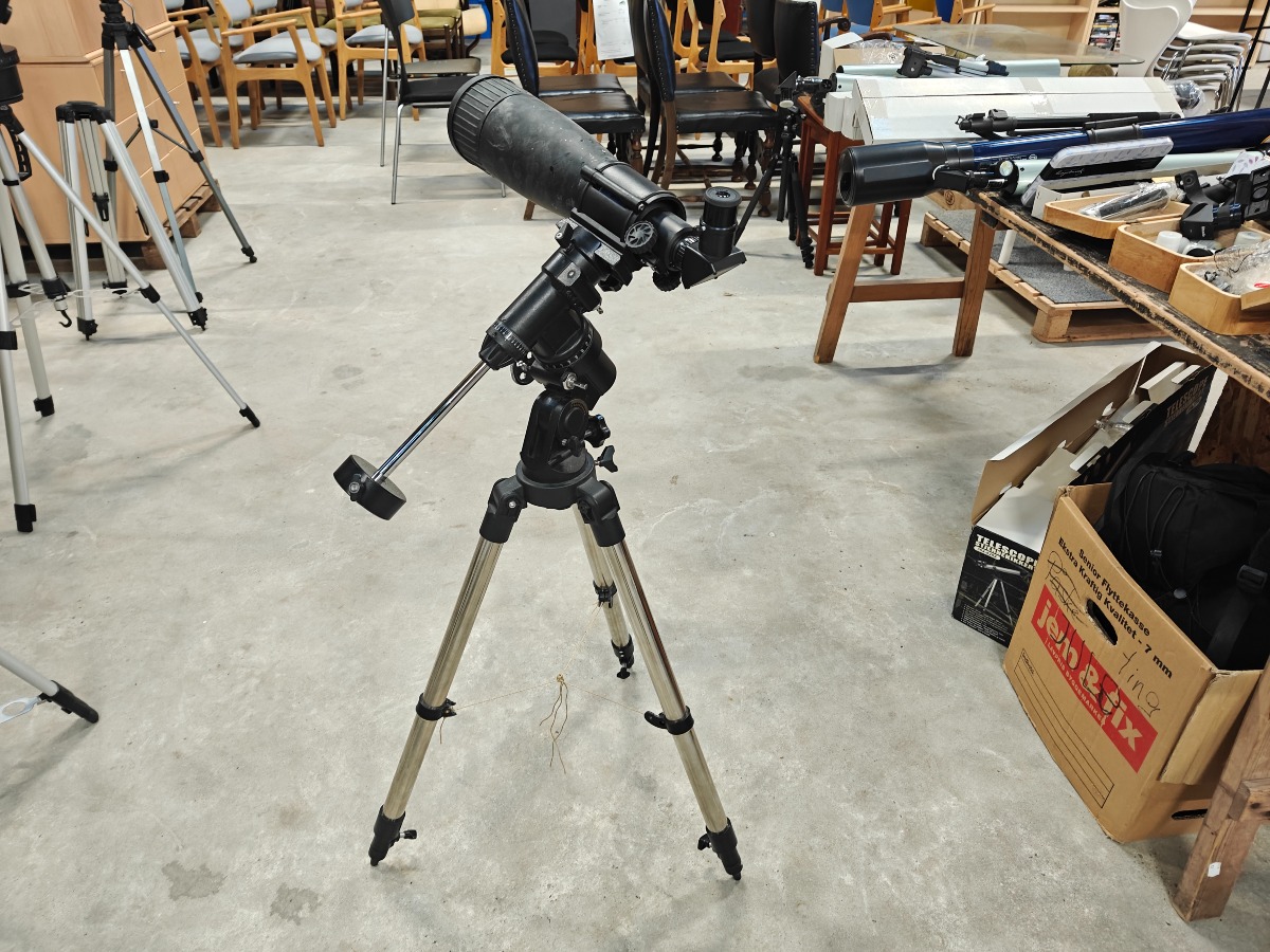 Ubk. fabrikat, teleskop med stativ. Silikonebelægning på teleskop slidt. Trefod med defekt.