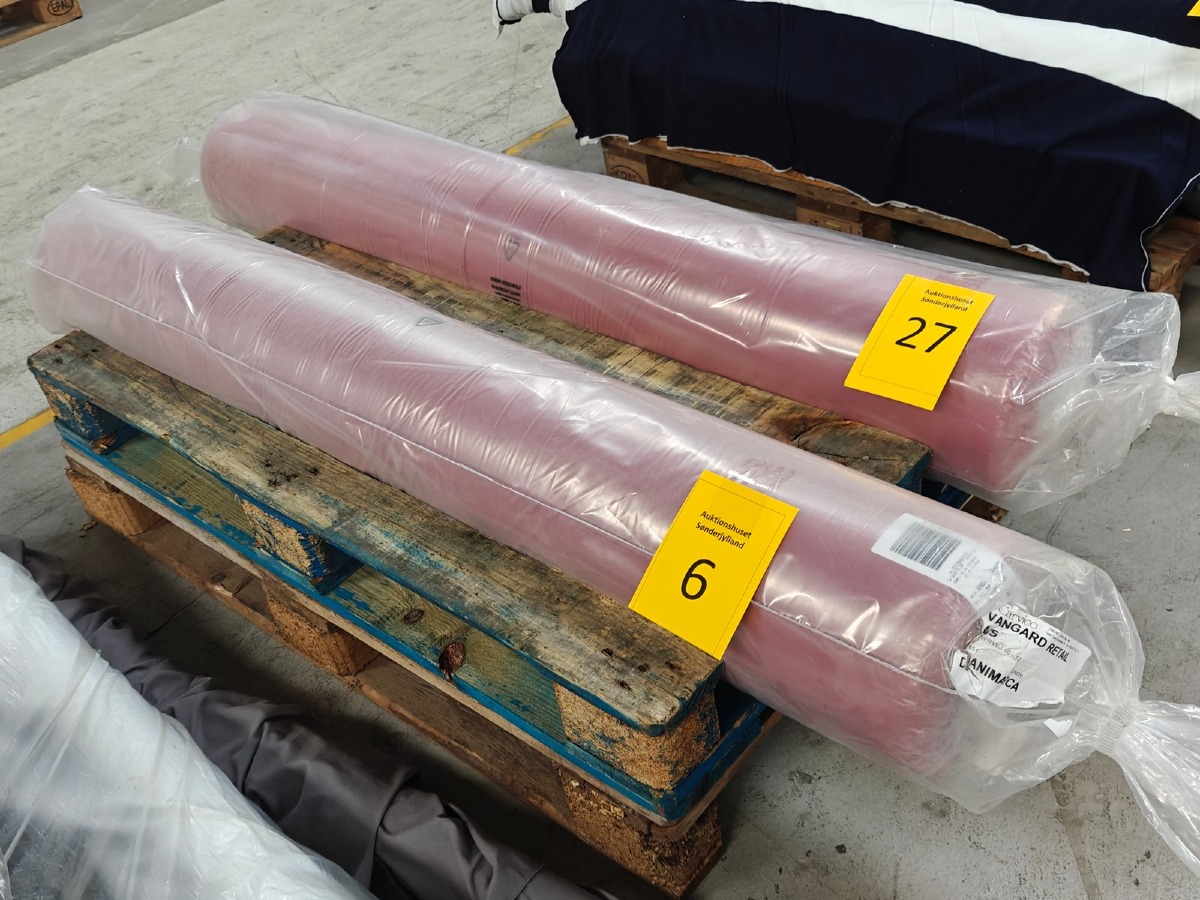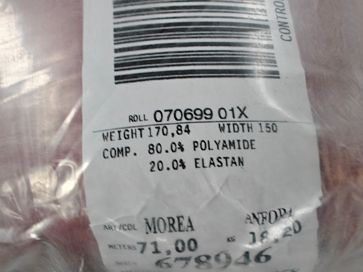 1 rl. Stof: Materiale: 80% Polyamide. 20% Elastan. Farve: Morea Anfora/koral. Mål: L: ca 71 m. B: ca 150 cm. Ubrugt og i org emballage.