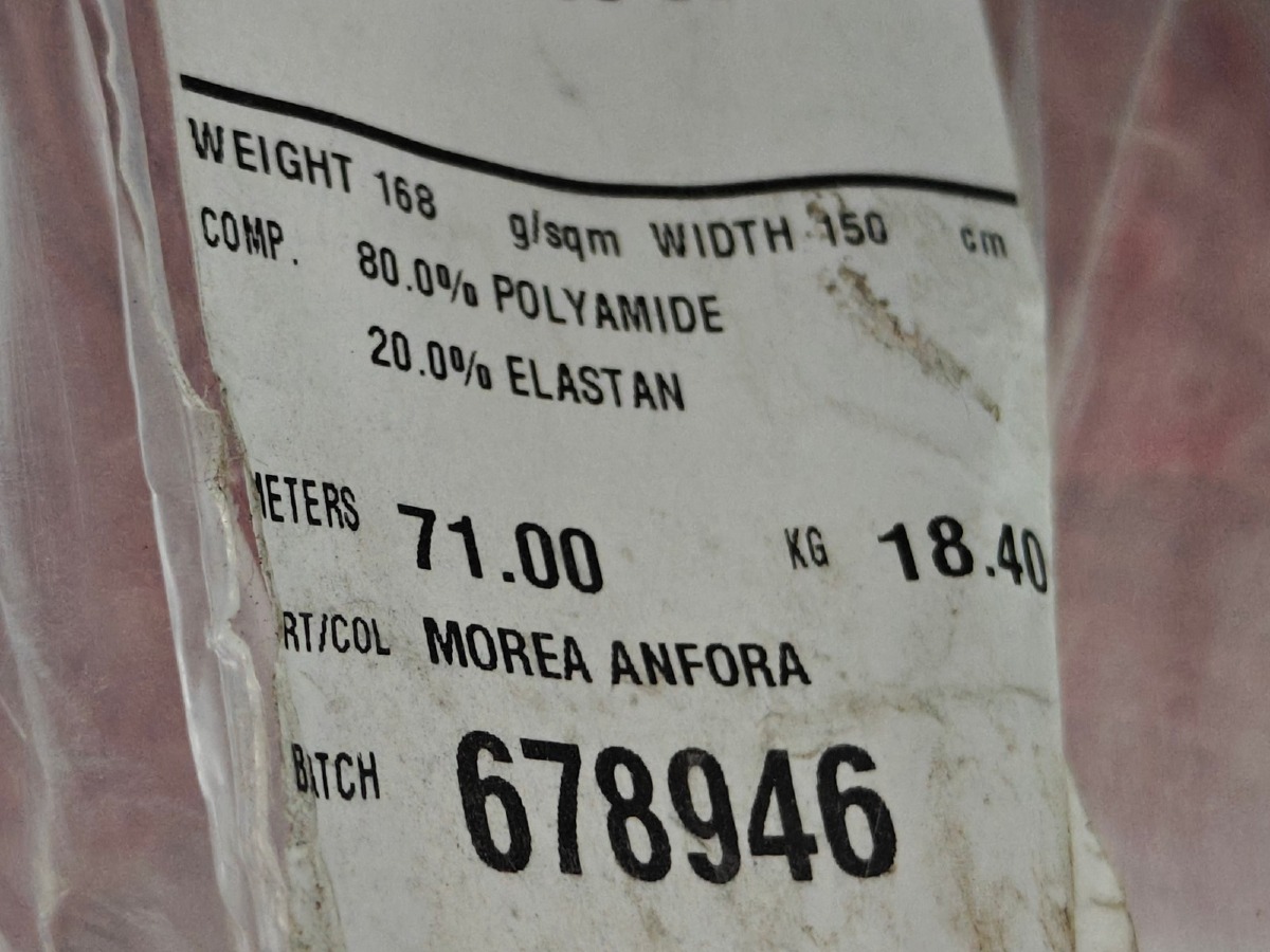 1 rl. Stof: Materiale: 80% Polyamide. 20% Elastan. Farve: Morea Anfora/koral. Mål: L: ca 71 m. B: ca 150 cm. Ubrugt og i org emballage.