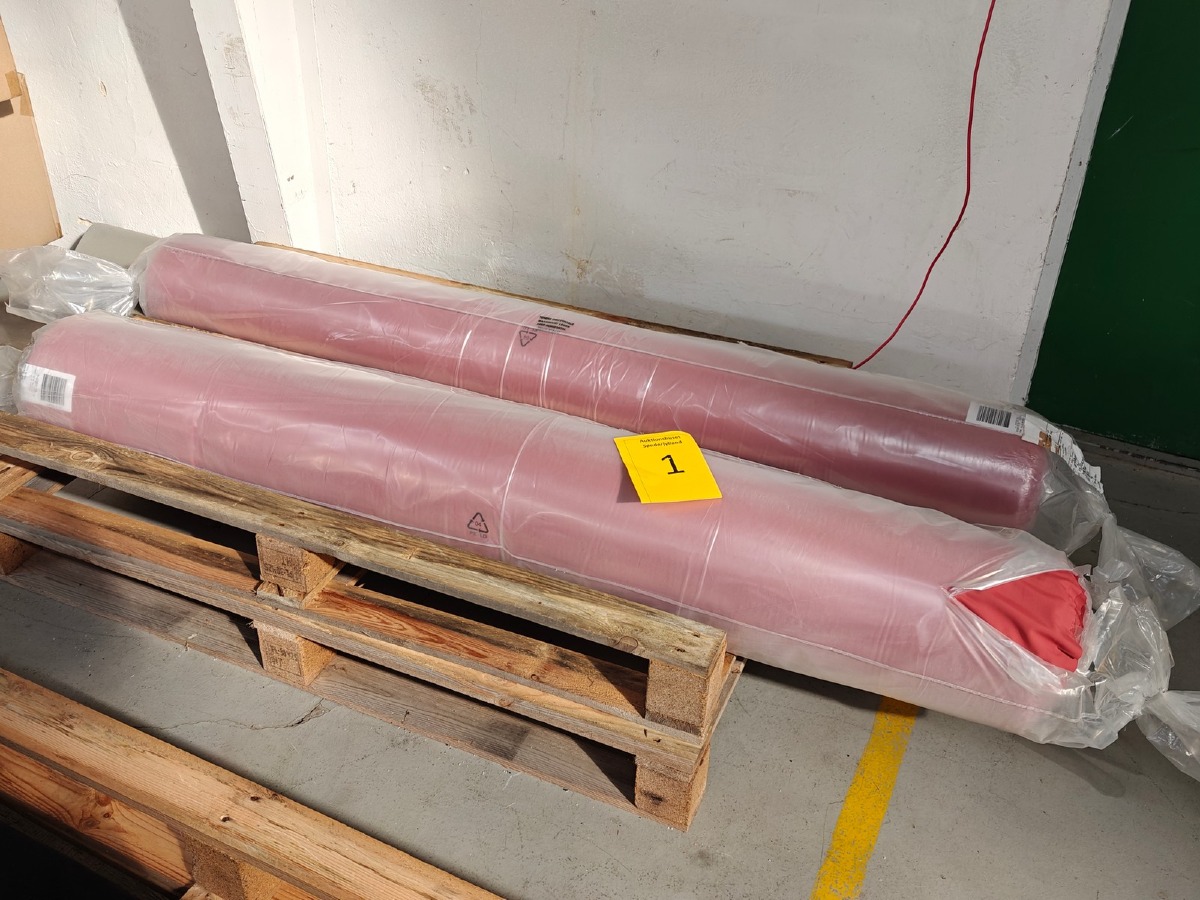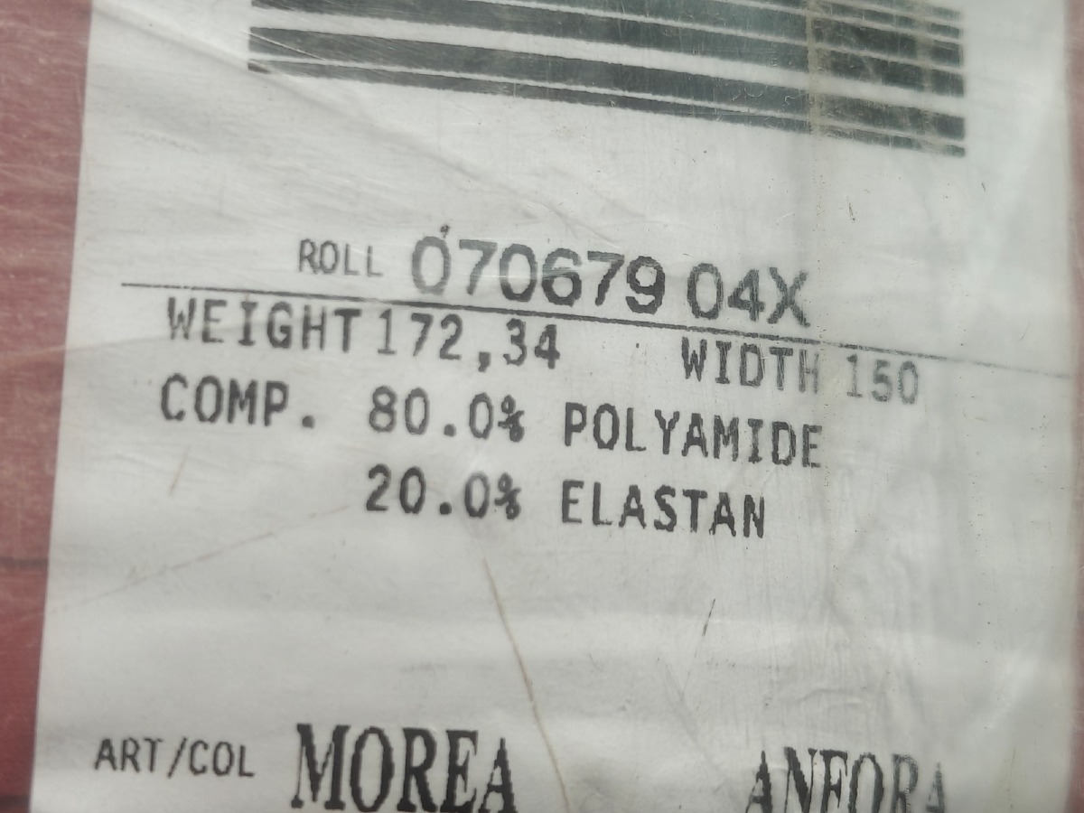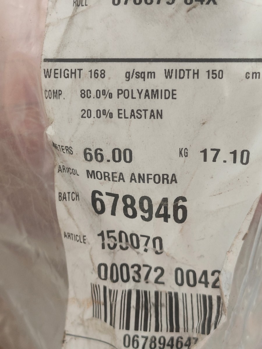 1 rl. Stof: Materiale: 80% Polyamide. 20% Elastan. Farve: Morea Anfora/koral. Mål: L: ca 66 m. B: 150 cm. Ubrugt og i org emballage.