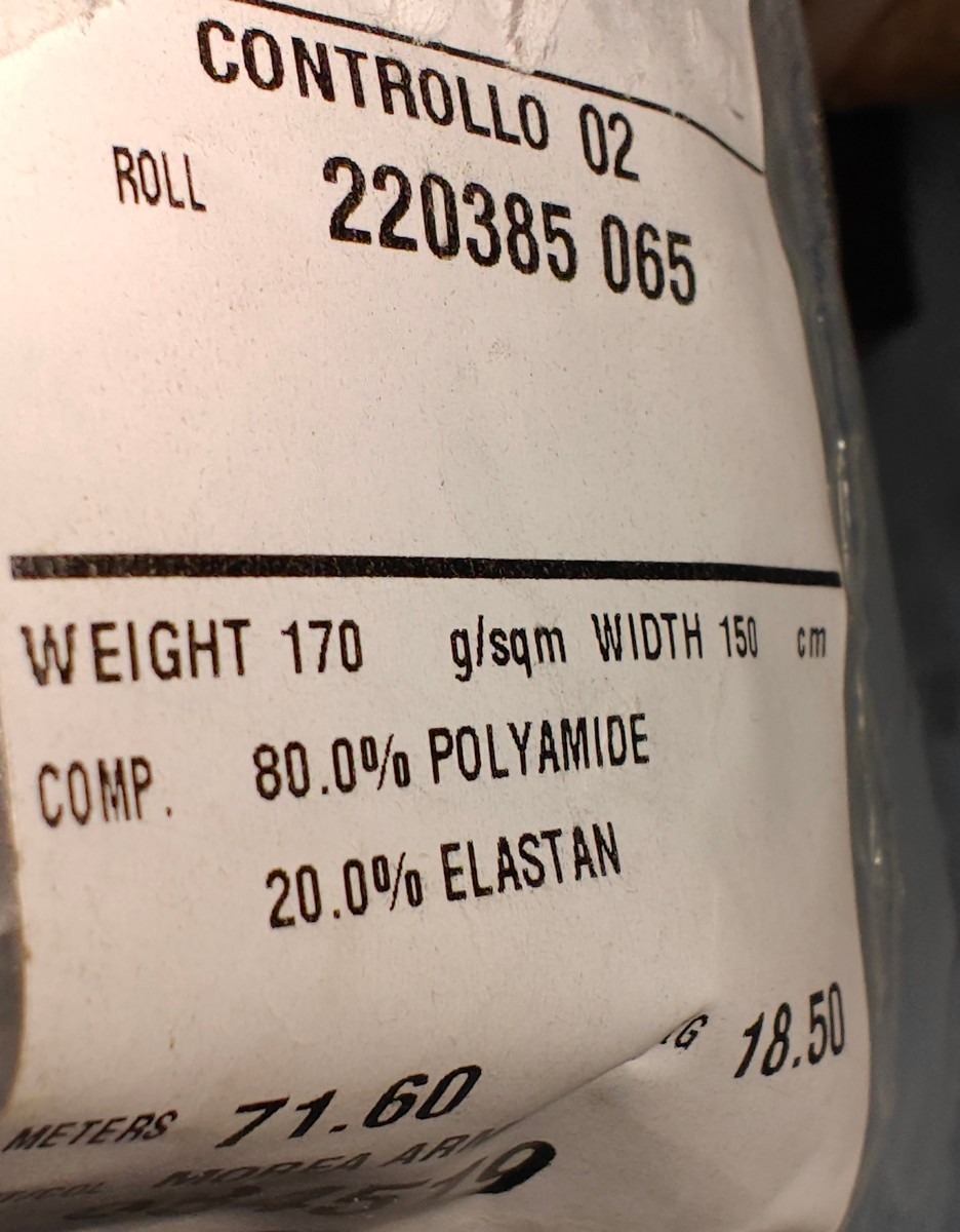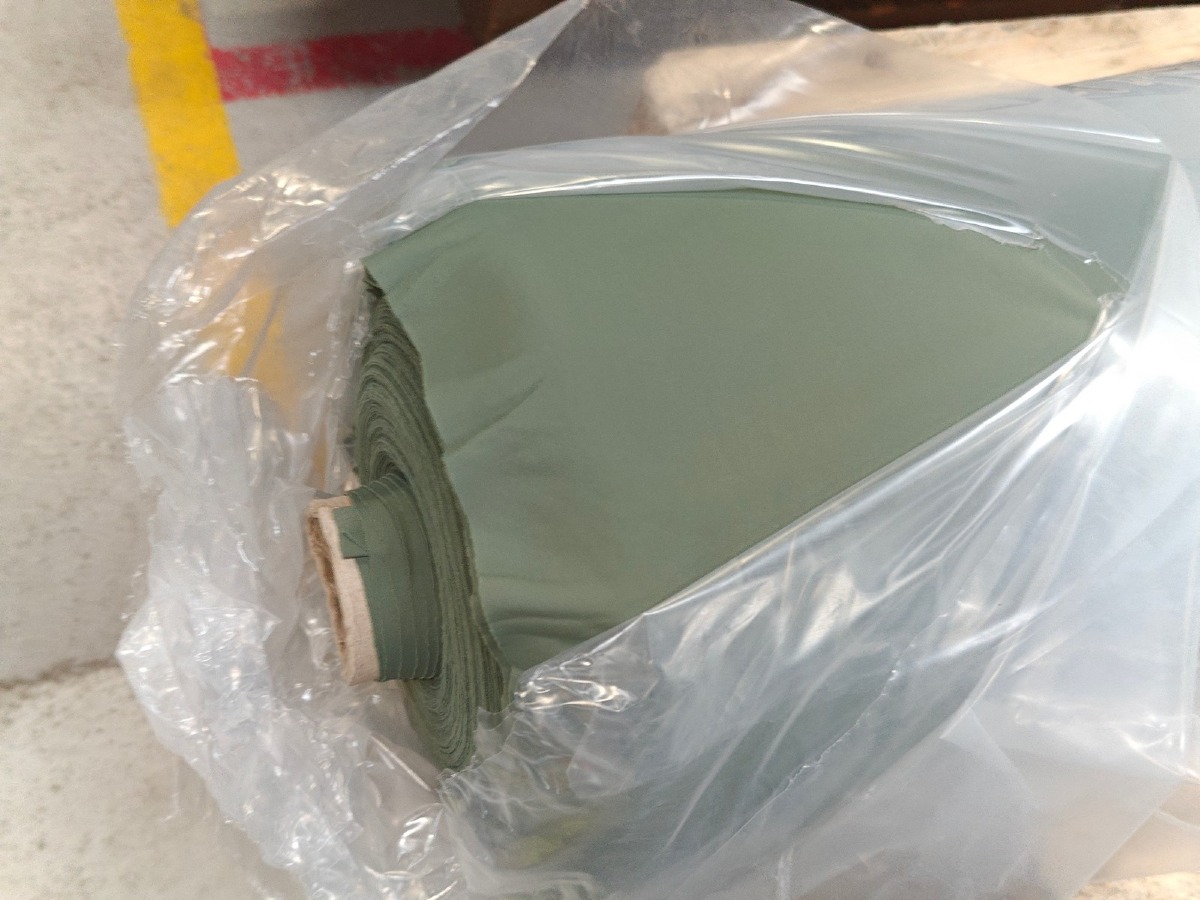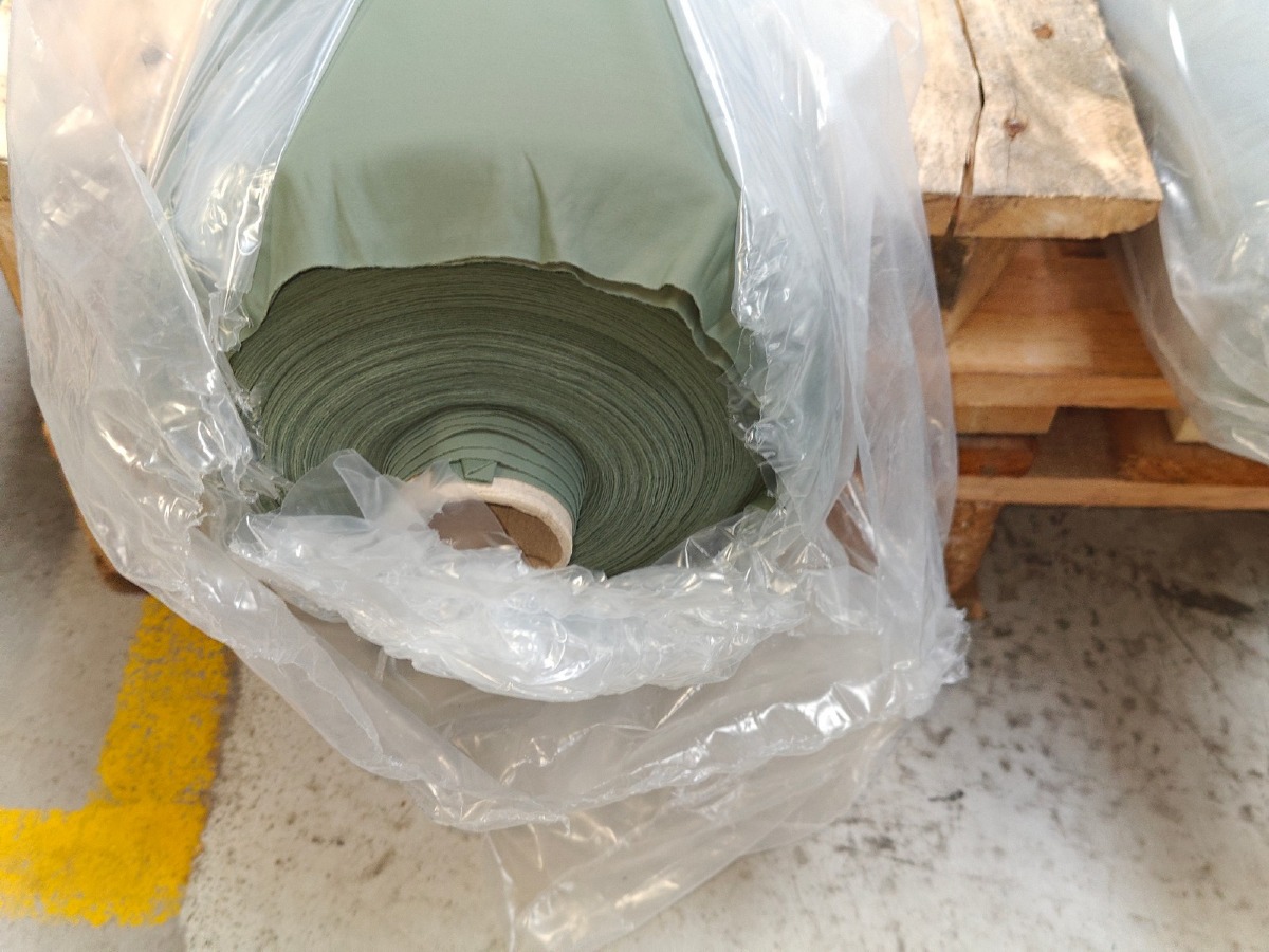 1 rl. Stof. Materiale: 80% Polyamide. 20% Elastan. Farve: Støvet/naturgrøn. Mål: L: ca. 71.6 m. B: ca 150 cm. Ubrugt & i emballage.
