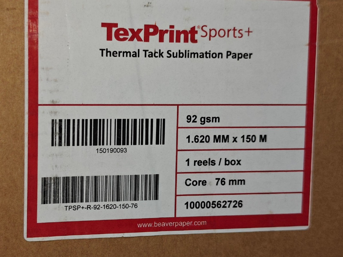 4 rl. Thermal Tack Sublimation Paper. 1.620 mm x 150 m./rl. Core: 76 mm. Fra TexPrint Sports+. I emballage.