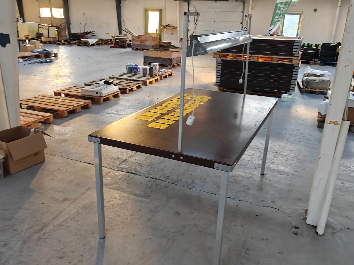 Arbejds-/sybord. Ståbord m lysarmatur. Mål: 190 x 110 cm. H: 94 cm (bord). H: 180 cm (incl lampe). Ben kan afmonteres. Brugt med brugsspor. OBS: Fotos viser et af de udbudte borde. Bordene udleveres som 'plukkevarer'.