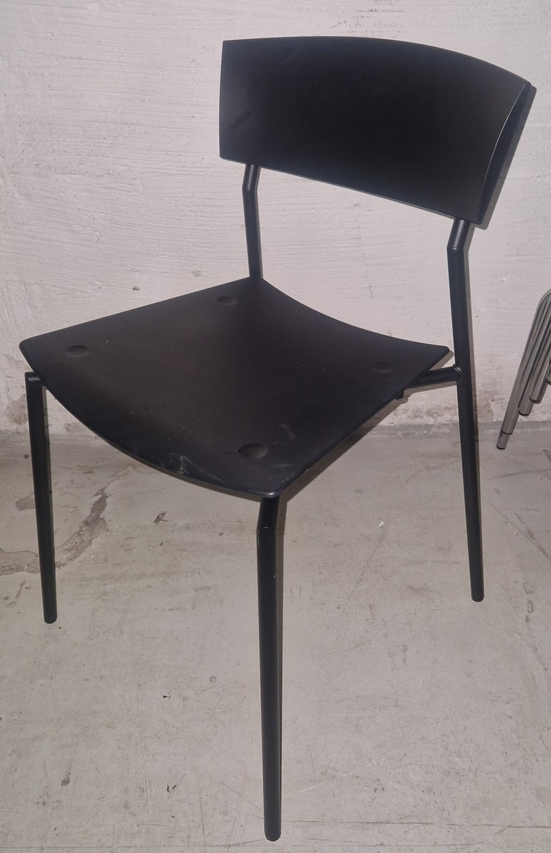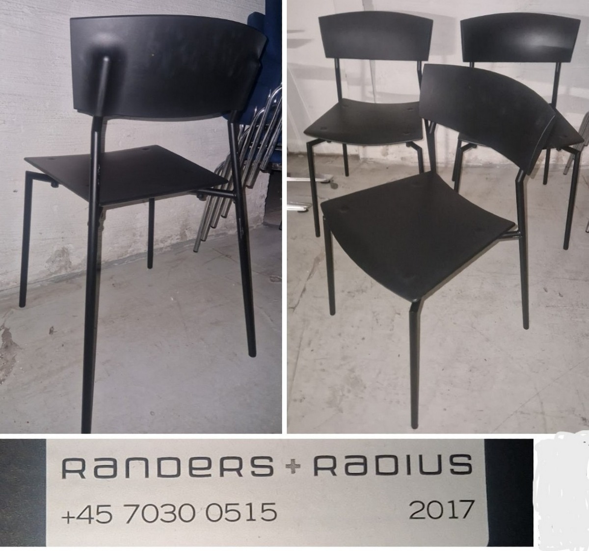 3 Møde-/kantinestole. Mrk: Randers + Radius. Sorte. Brugte..