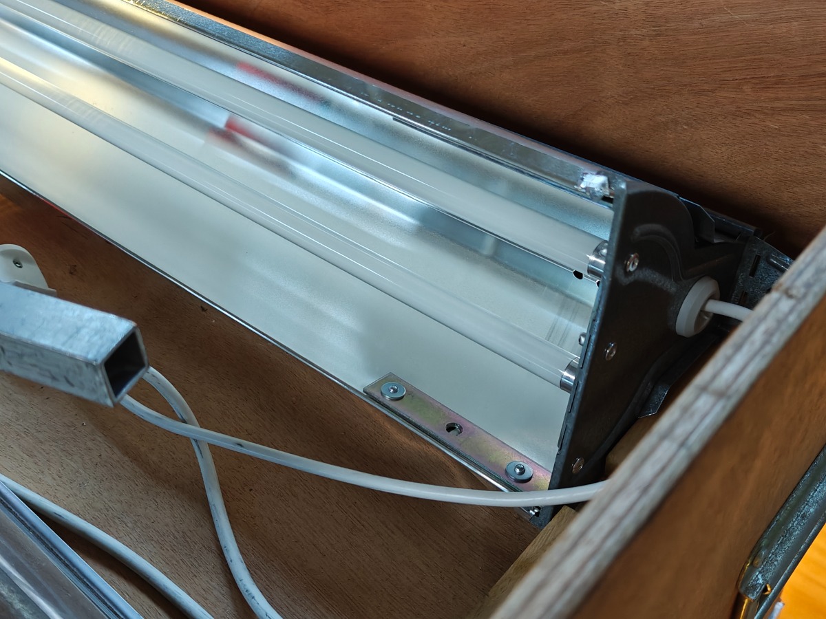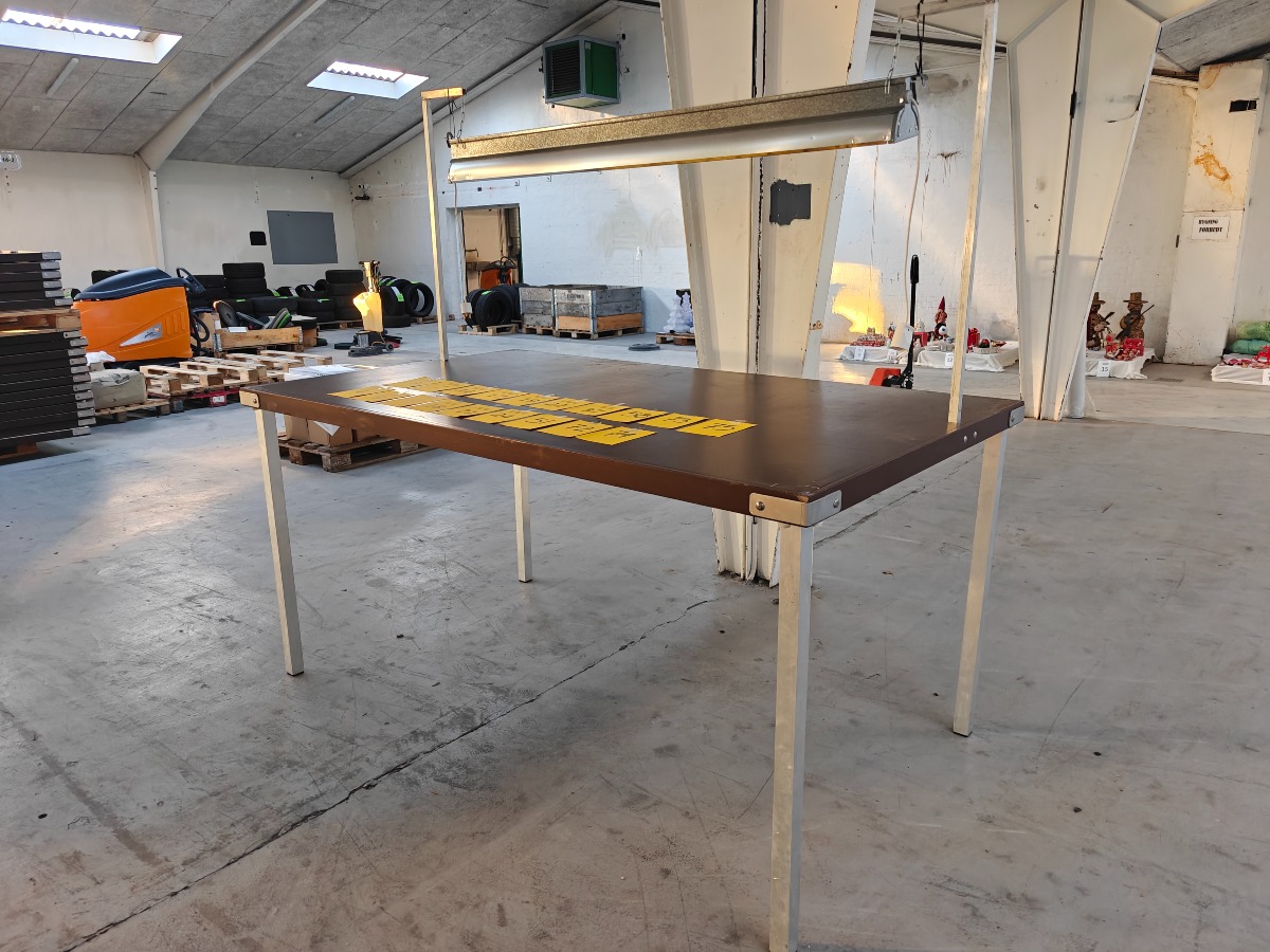 Arbejds-/sybord. Ståbord m lysarmatur. Mål: 190 x 110 cm. H: 94 cm (bord). H: 180 cm (incl lampe). Ben kan afmonteres. Brugt med brugsspor. OBS: Fotos viser et af de udbudte borde. Bordene udleveres som 'plukkevarer'.