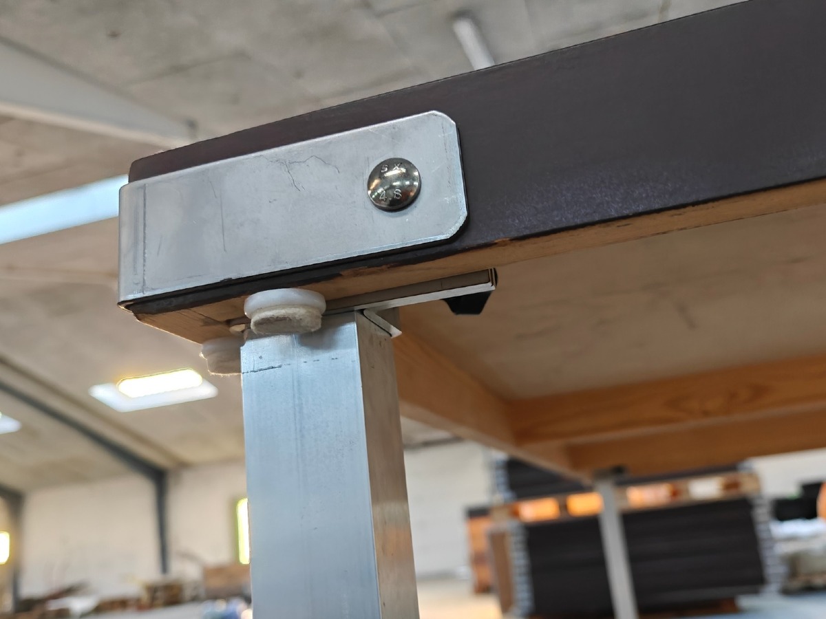 Arbejds-/sybord. Ståbord m lysarmatur. Mål: 190 x 110 cm. H: 94 cm (bord). H: 180 cm (incl lampe). Ben kan afmonteres. Brugt med brugsspor. OBS: Fotos viser et af de udbudte borde. Bordene udleveres som 'plukkevarer'.