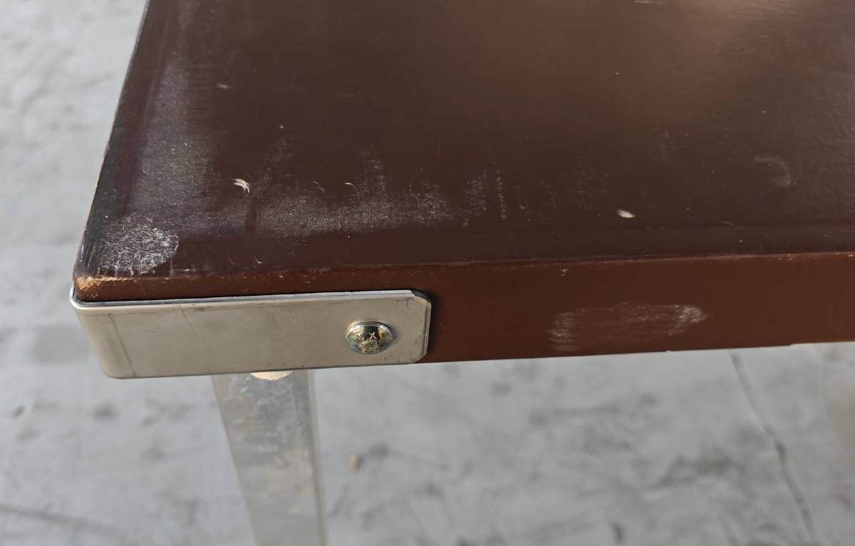 Arbejds-/sybord. Ståbord m lysarmatur. Mål: 190 x 110 cm. H: 94 cm (bord). H: 180 cm (incl lampe). Ben kan afmonteres. Brugt med brugsspor. OBS: Fotos viser et af de udbudte borde. Bordene udleveres som 'plukkevarer'.