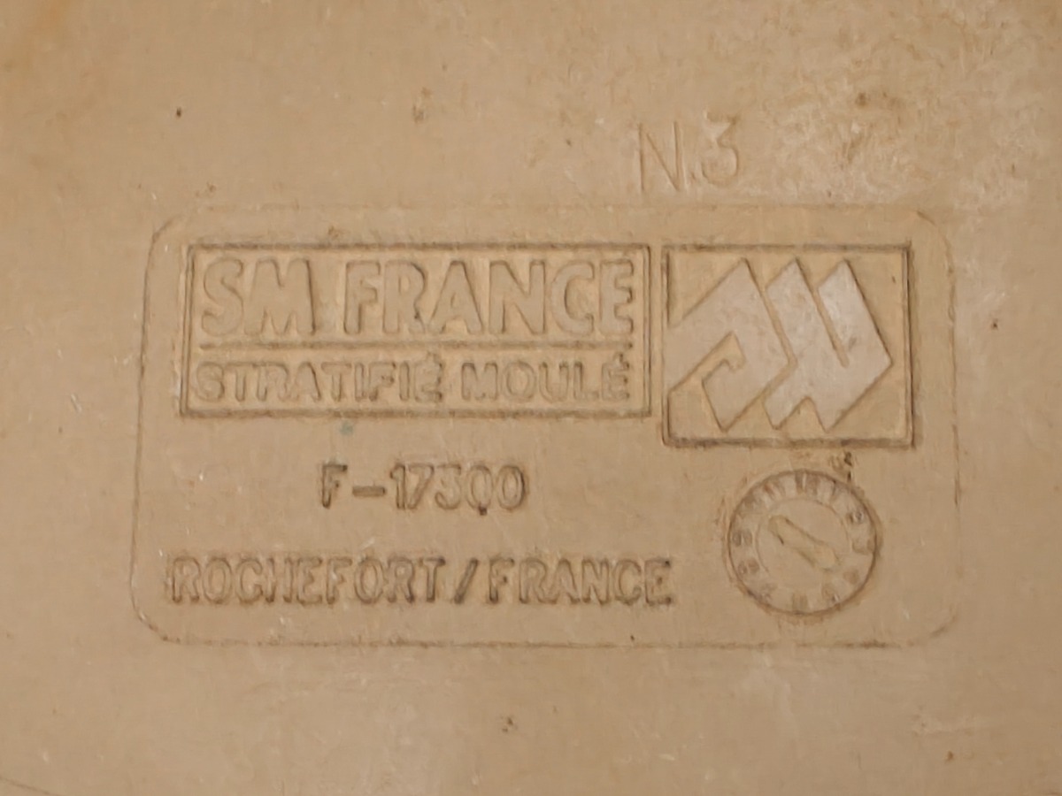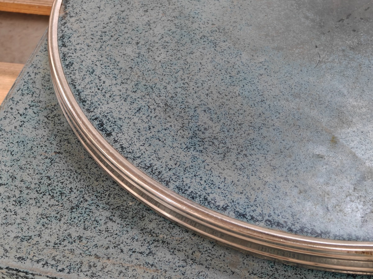 Fransk cafébordplade. SM France Stratifié Moulé. Rund m/aluskinne. Mål: Ø60 cm. Brugt.