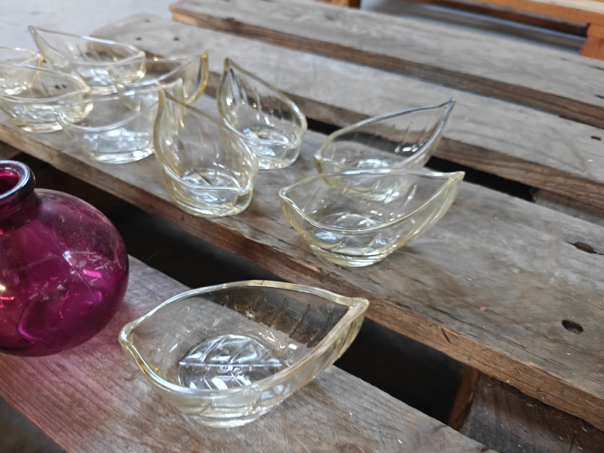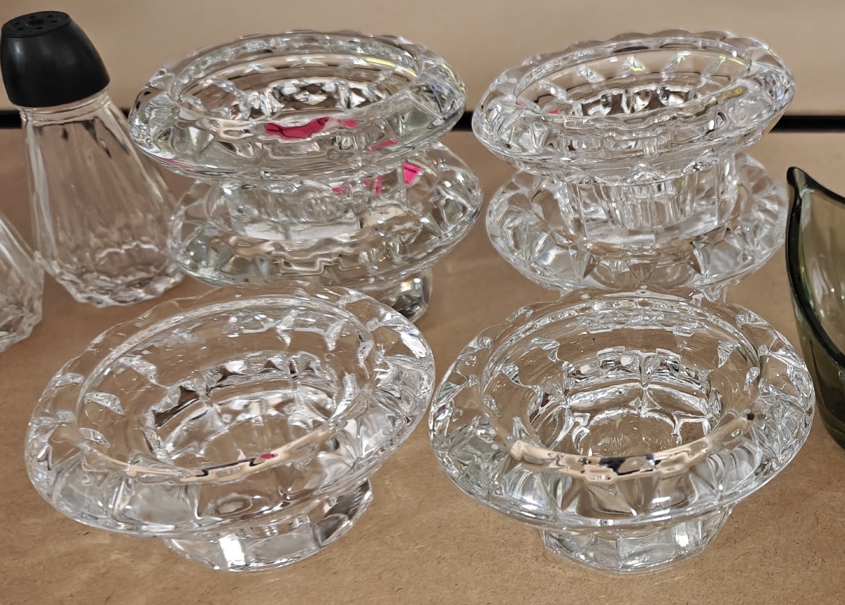 16 Fyrfadsstager i glas. 8 Runde: France. 8 Bladformede. Brugte.