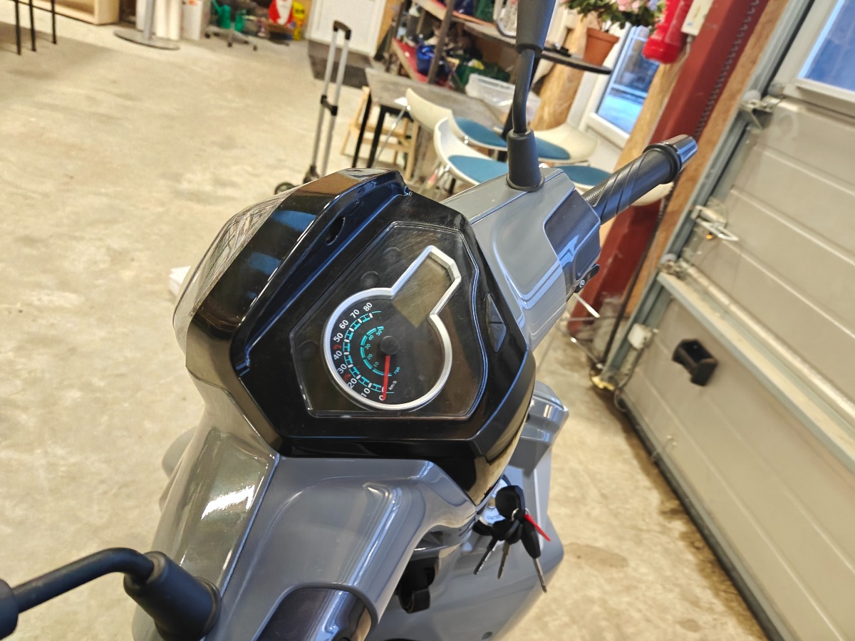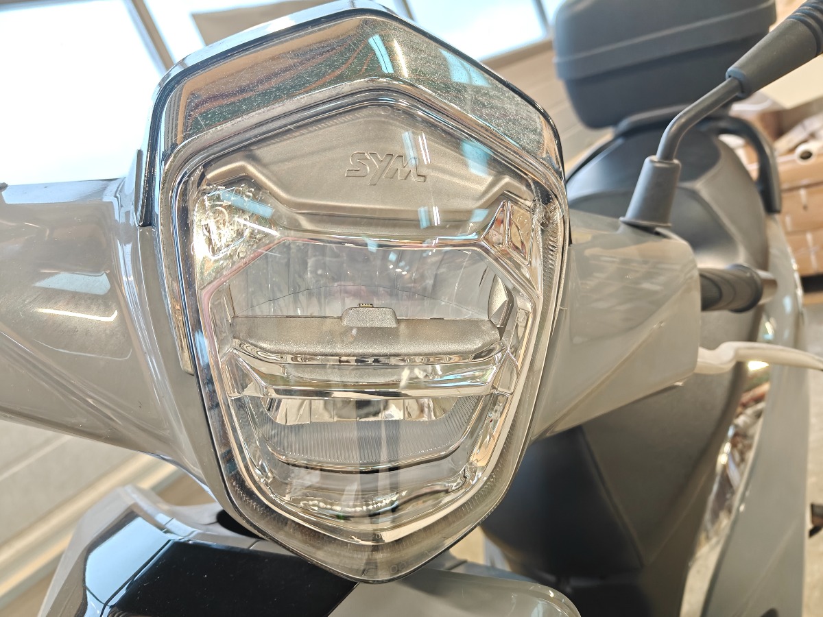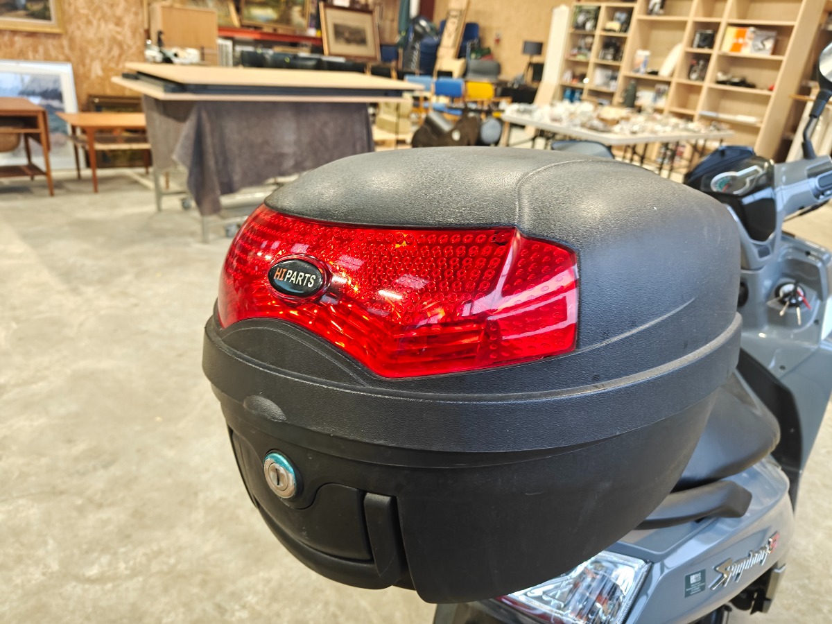 SYM Symphony ST scooter i opak grå farve. LED lys, LCD display på instrumentbord, USC udtag, stort bagagerum, justerbar affjedring bagtil. Monteret med 16" hjul. Km-stand 4394 km. Fremstår meget velholdt og med minimale brugsspor.