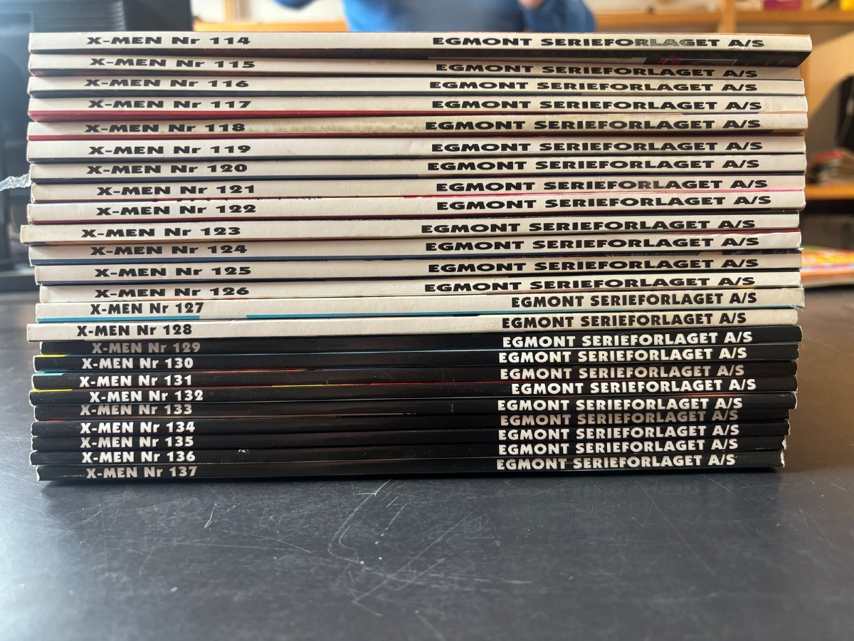 Marvel Comics – X-Men dansk udgave (114- 137). Fra samler og har diverse brugsspor, men nogenlunde stand. Der anbefales at komme til eftersyn og bese varerne. Fra dødsbo