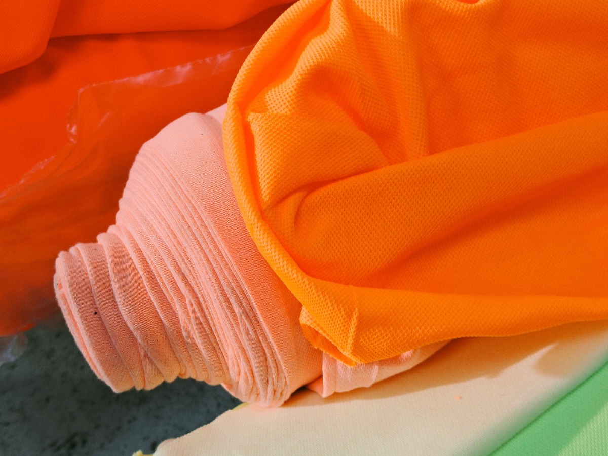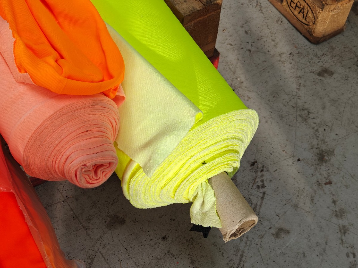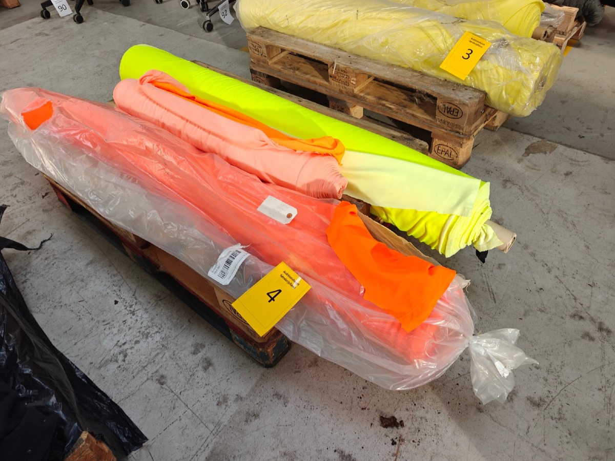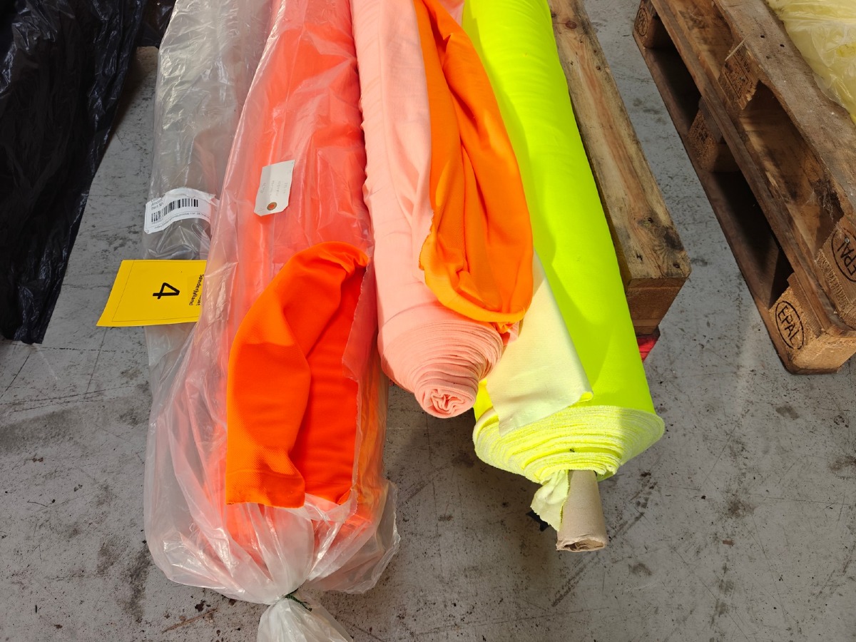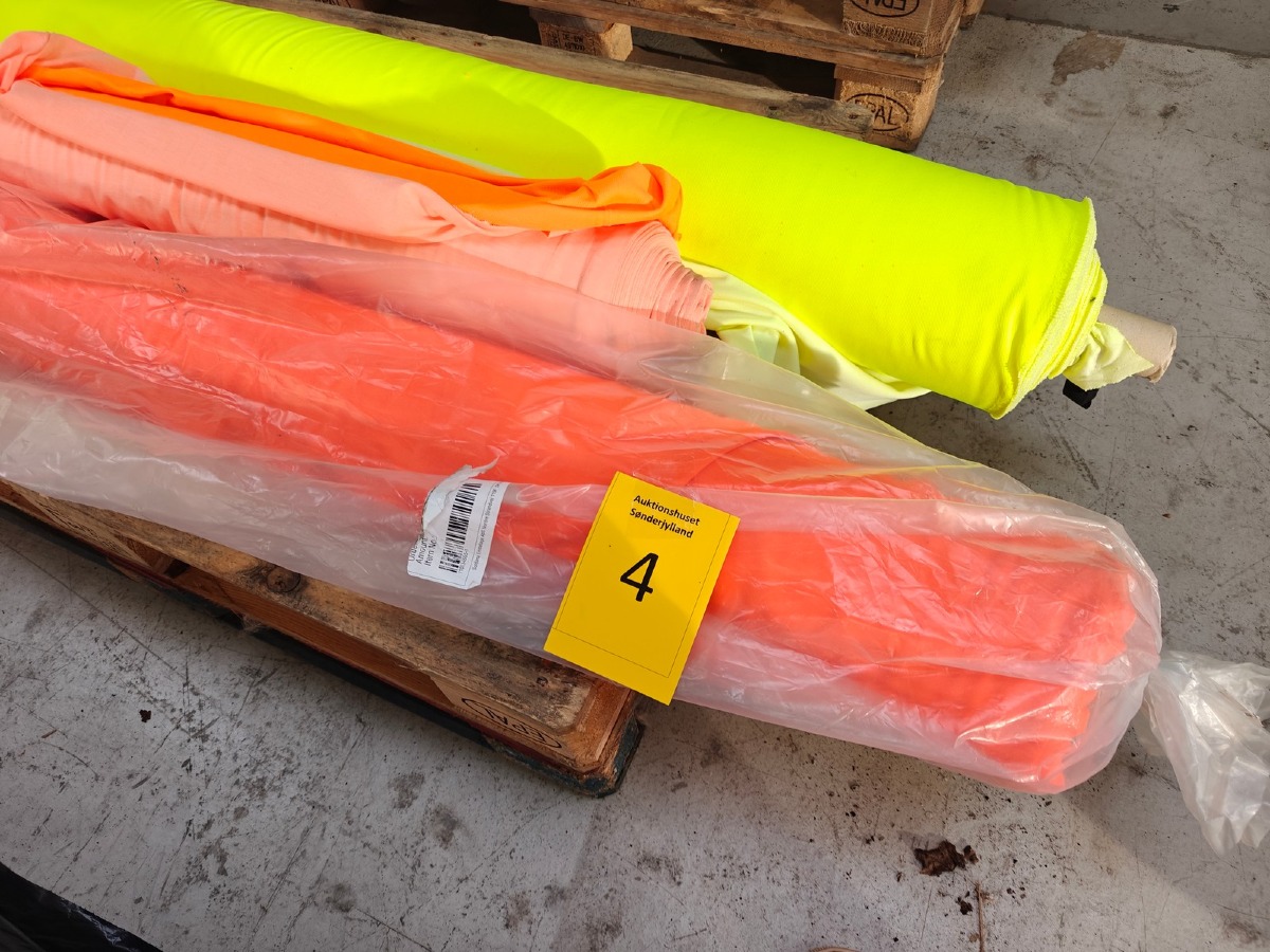 3 rl. Stof: Farve: 2 rl i neon orange og 1 rl i neon gul. Mål: Neon gul: L: ukendt. B: 150 cm. Neon orange: 1 rl: L: ukendt. B: 190 cm. 1 rl tunnel/rundsyet. B: 90 cm.
