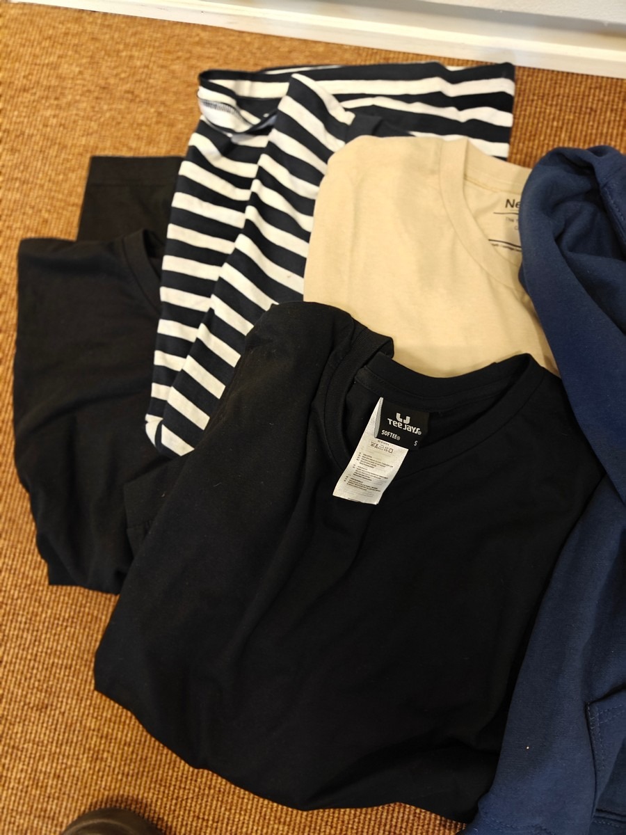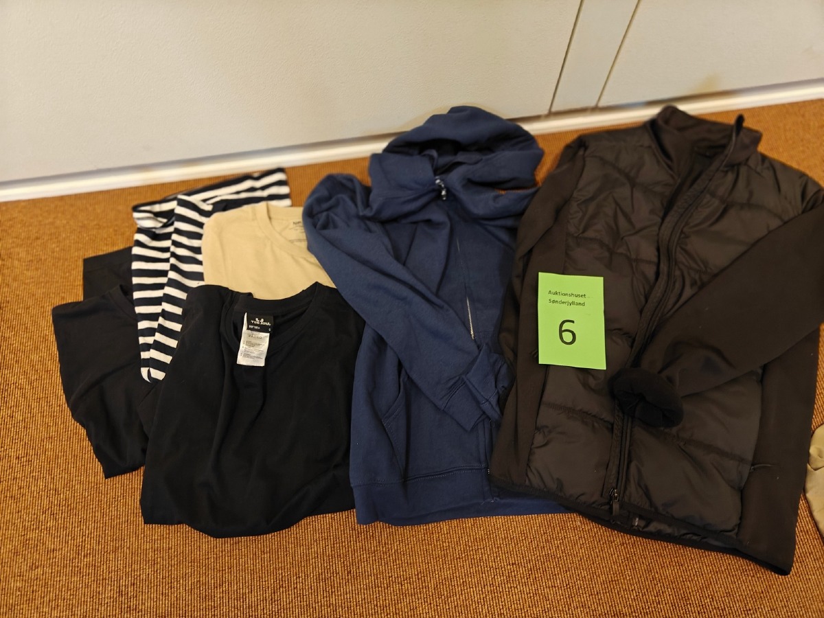 Herre basic tøj str. S. Tynd jakke, hoodie, 4 stk. t-shirts. Dansk kvalitet. Oprydning for virksomhed. Ubrugt.