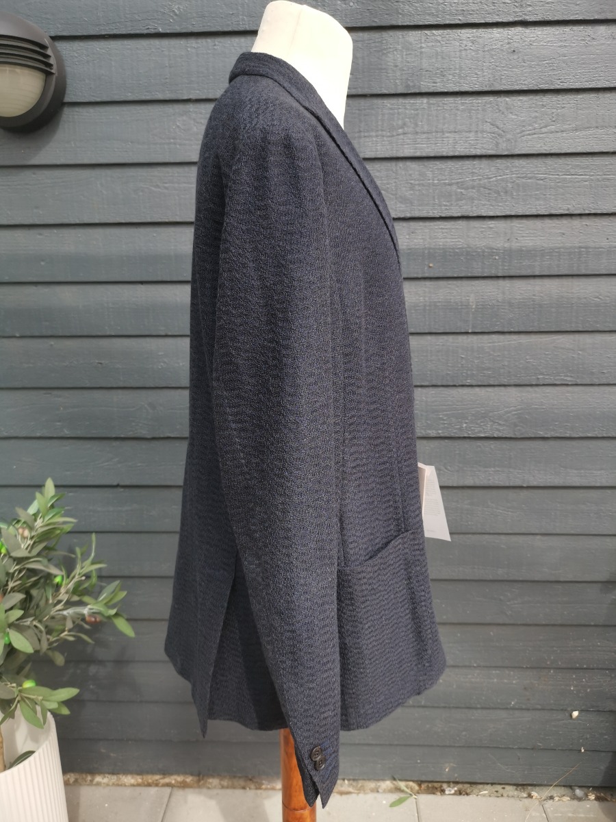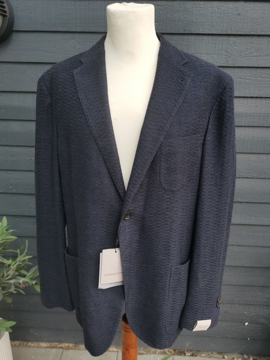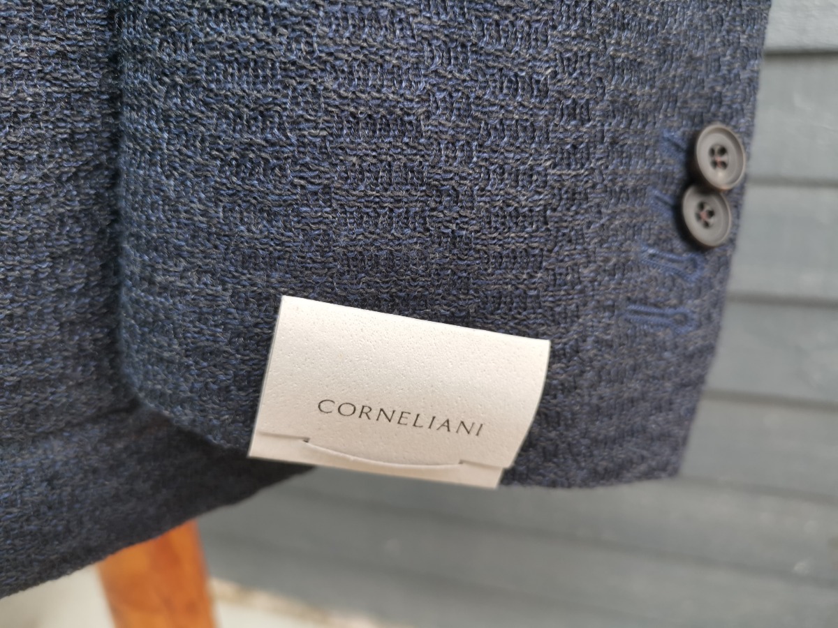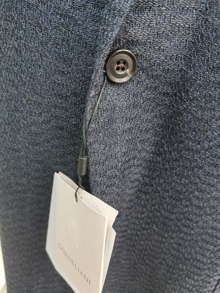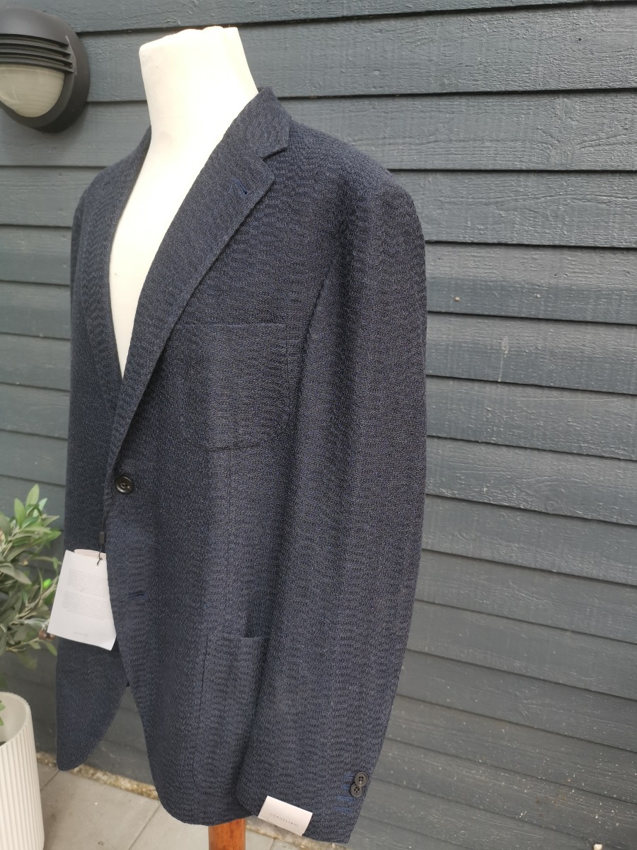 Sommer blazer jakke til herrer fra Corneliani, str. 50, mørkeblå meleret stof, uden for, men med mange fine detaljer. Ubrugt, og stadig med skiltning.