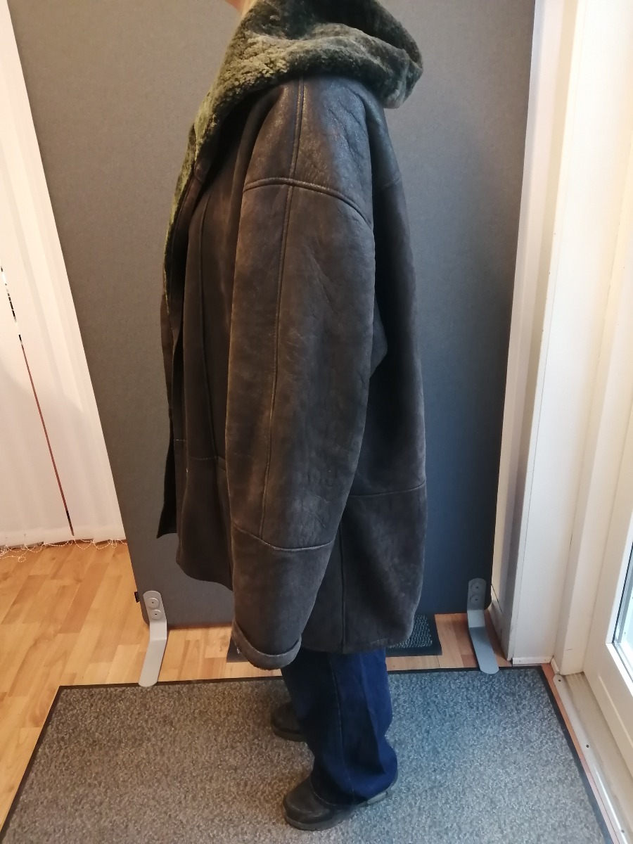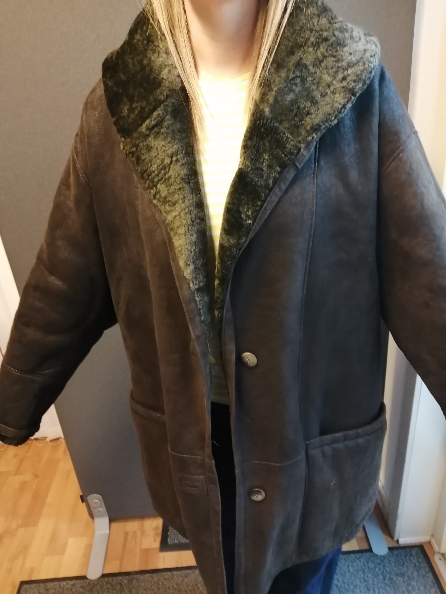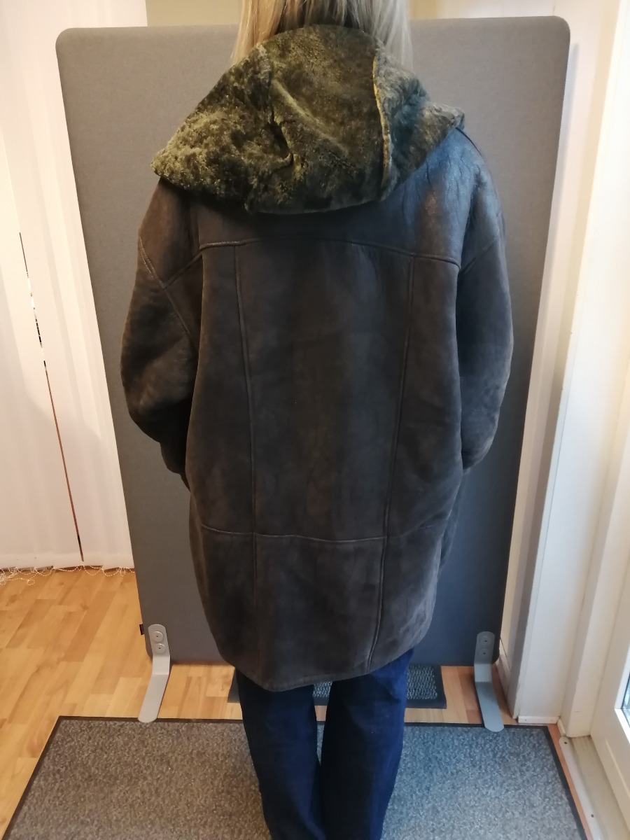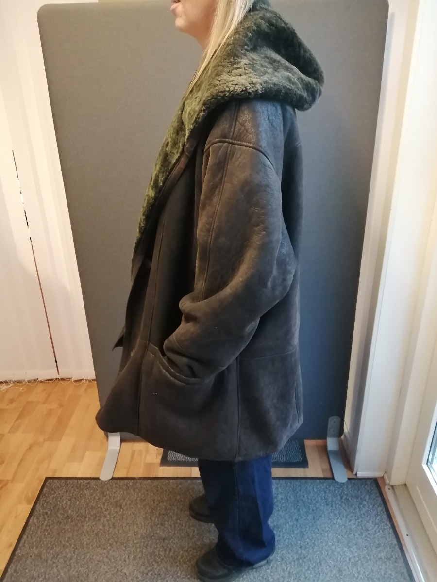 Rulamsfrakke i brun, med hætte samt pels på indersiden.