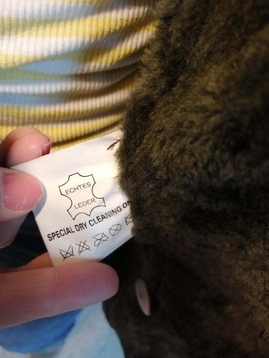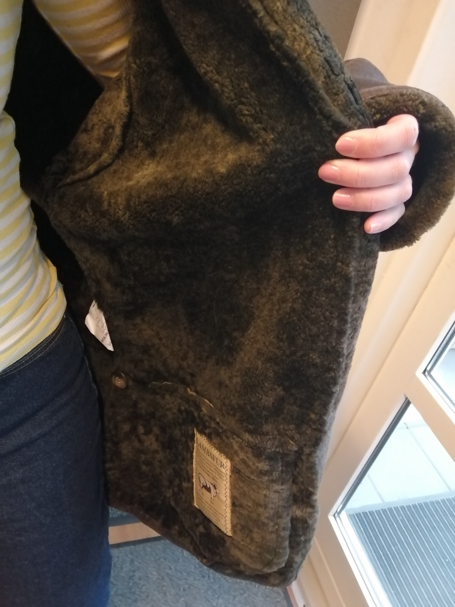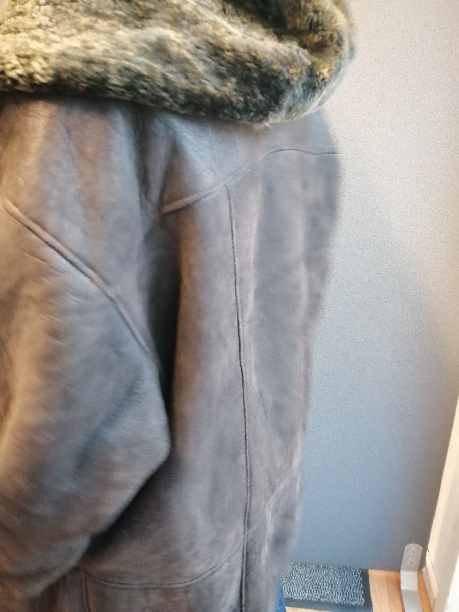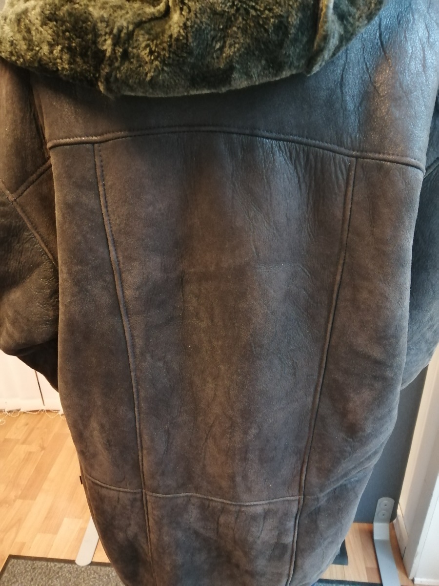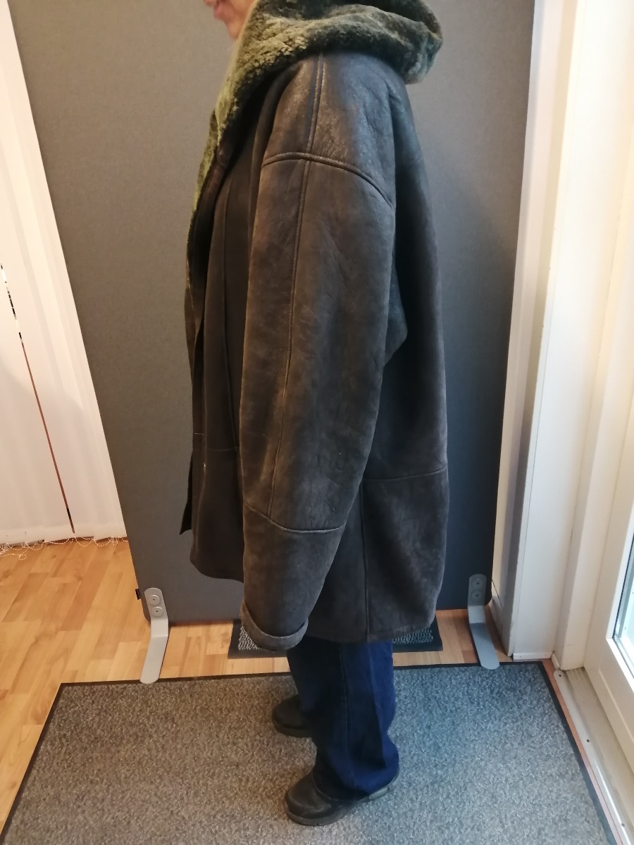 Rulamsfrakke i brun, med hætte samt pels på indersiden.