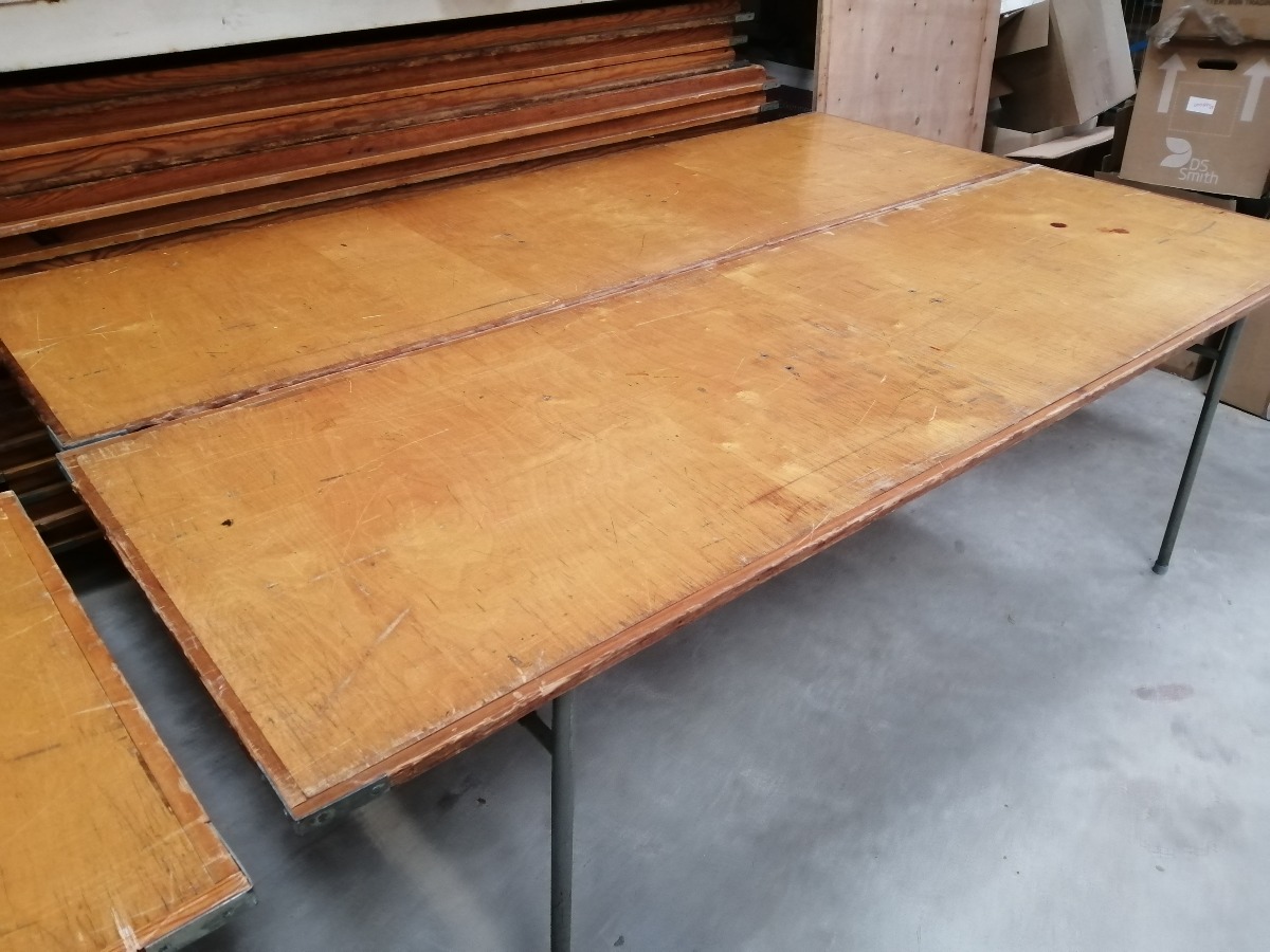 4 stk. træ klapborde - stabile borde med mange års historie. De har godt med patina, slid, brugsspor, som tilsammen giver dem et fedt look. De skal evt. lige slibes enkelte steder. Hjørne-kanter i jern kan mangle på nogle af bordene. De måler fra 201-202 cm i længden og 71-72 cm i bredden. H: 73,5 cm. Benene er med låse-funktion.