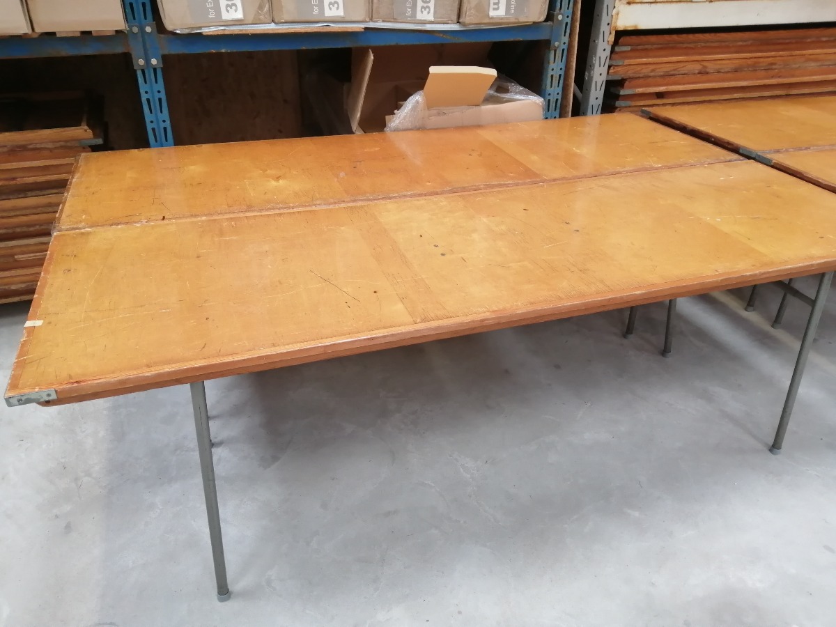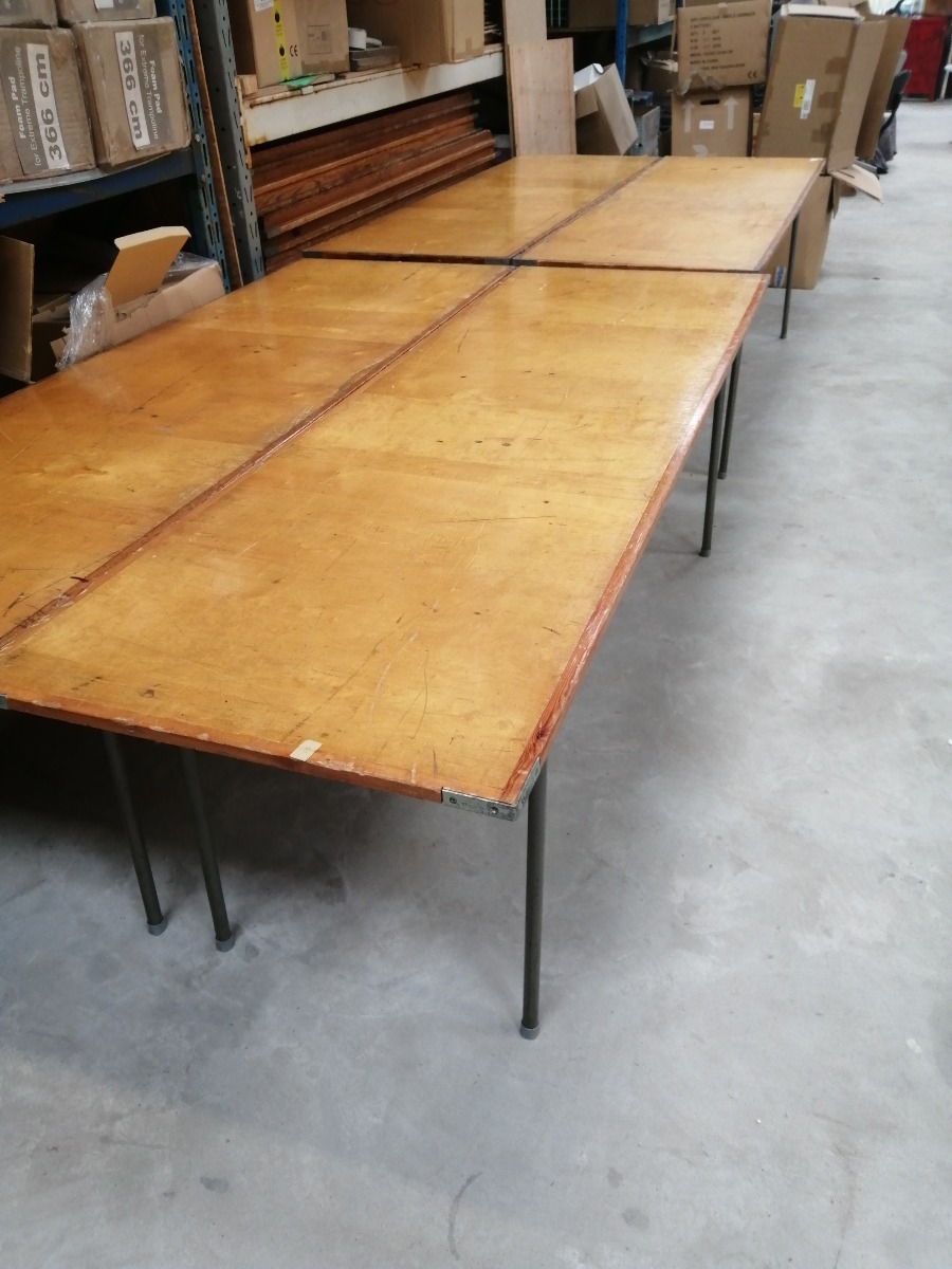 4 stk. træ klapborde - stabile borde med mange års historie. De har godt med patina, slid, brugsspor, som tilsammen giver dem et fedt look. De skal evt. lige slibes enkelte steder. Hjørne-kanter i jern kan mangle på nogle af bordene. De måler fra 201-202 cm i længden og 71-72 cm i bredden. H: 73,5 cm. Benene er med låse-funktion.