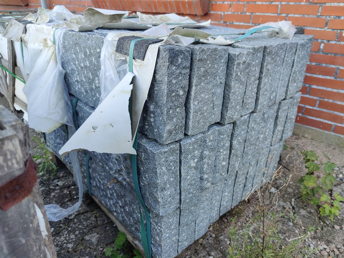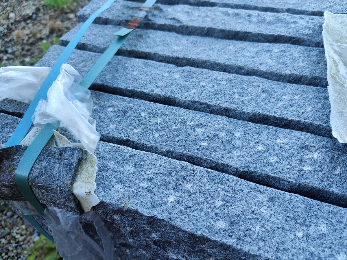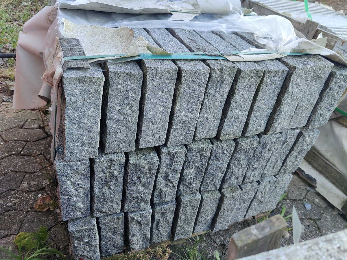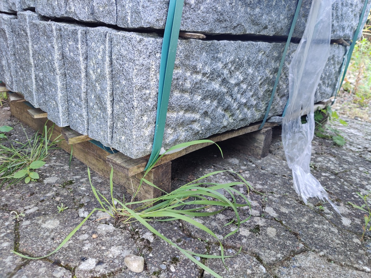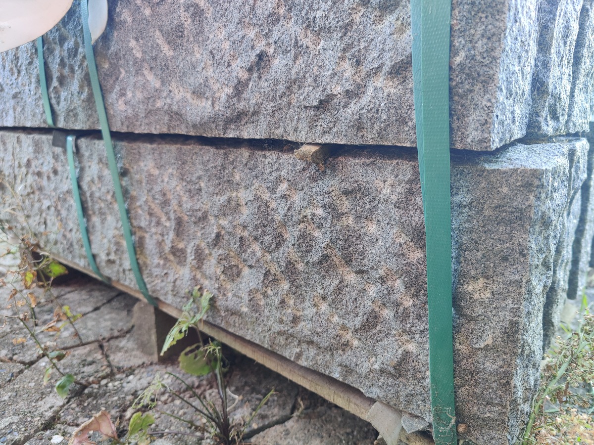 30 stk. granit natur kantsten med grov struktur. Grålig nuance, G 654 P. De måler 100 x 20 x 7 cm. De står på palle.