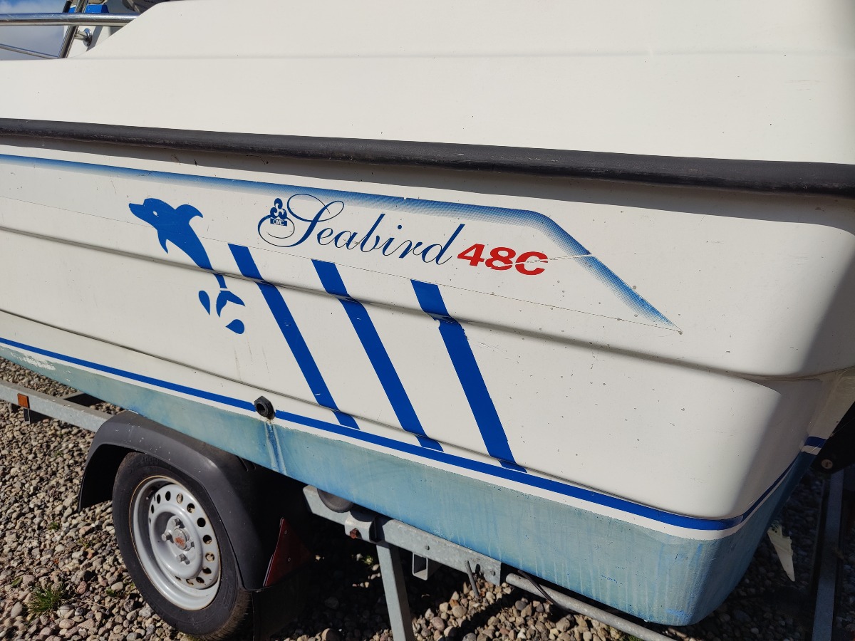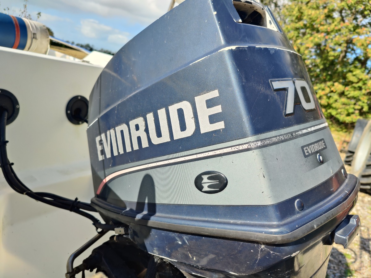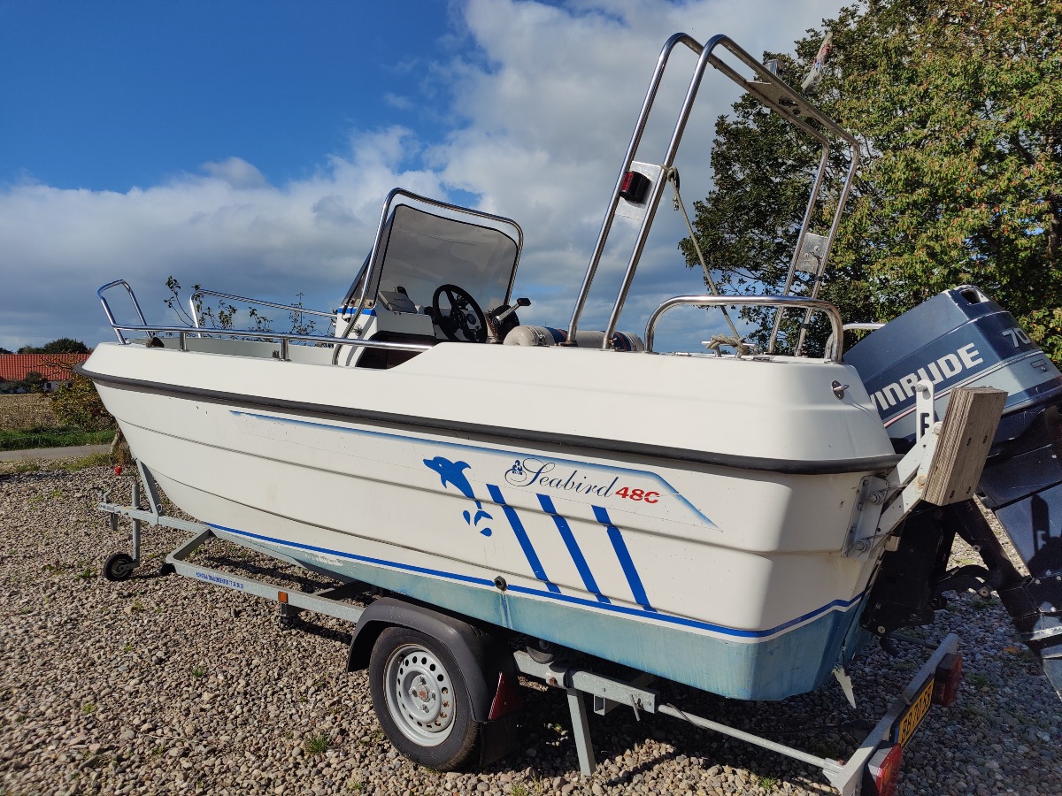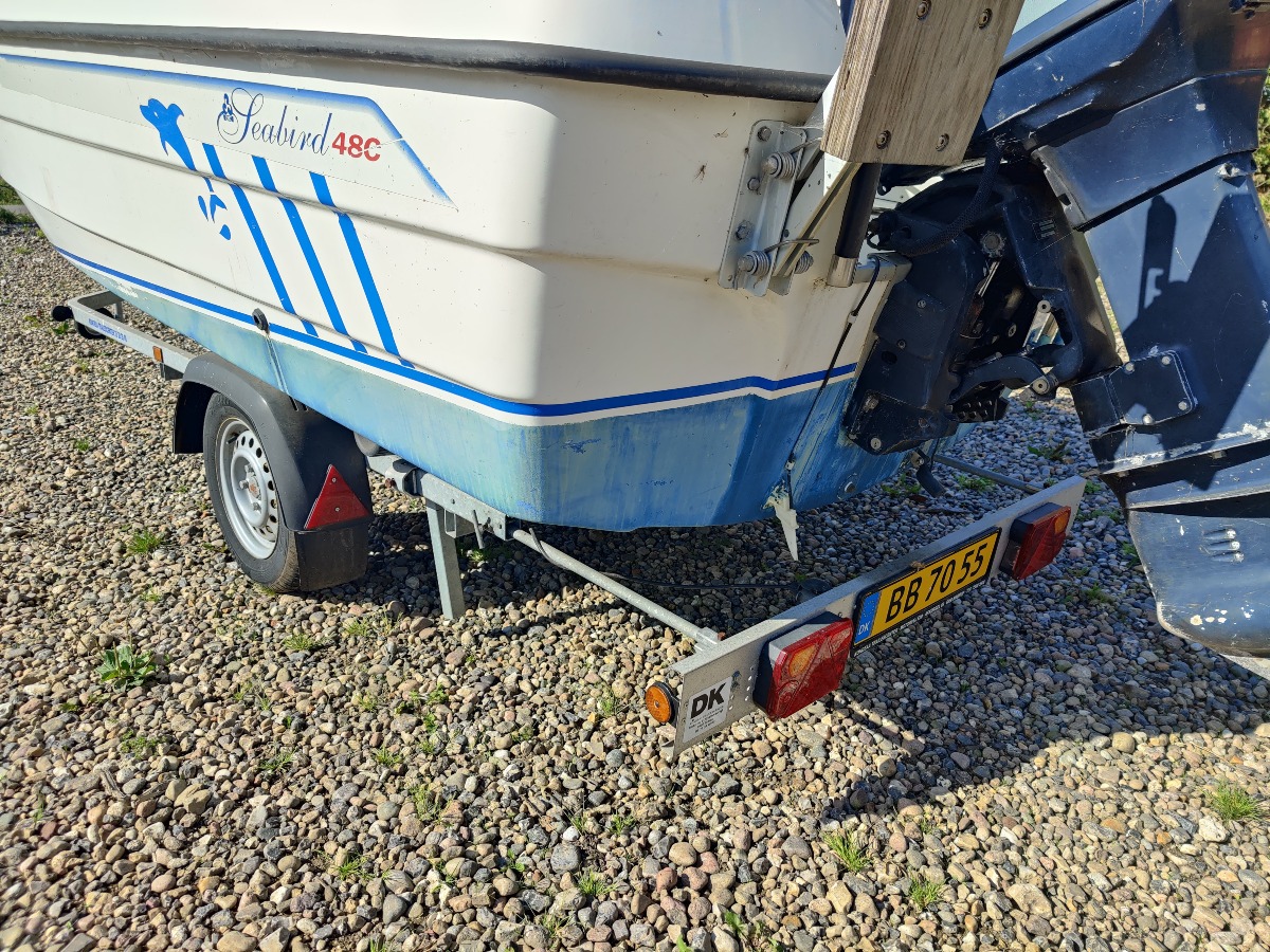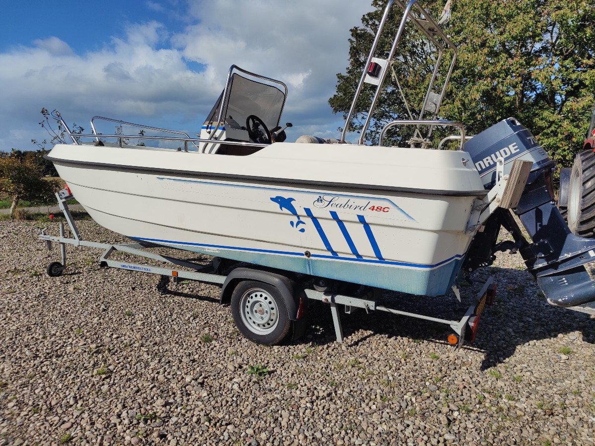 Ryds 485 DL - Seabird 48 C båd. Med EVINRUDE 70 HH, 2 takts motor. Båden er med Garmin kort plotter, kompas og diverse udstyr. Kongeaa variant bådtrailer medfølger - T: 750 kg, L: 600. Med spil. Båden har periodisk fejl på trim. Brugt.