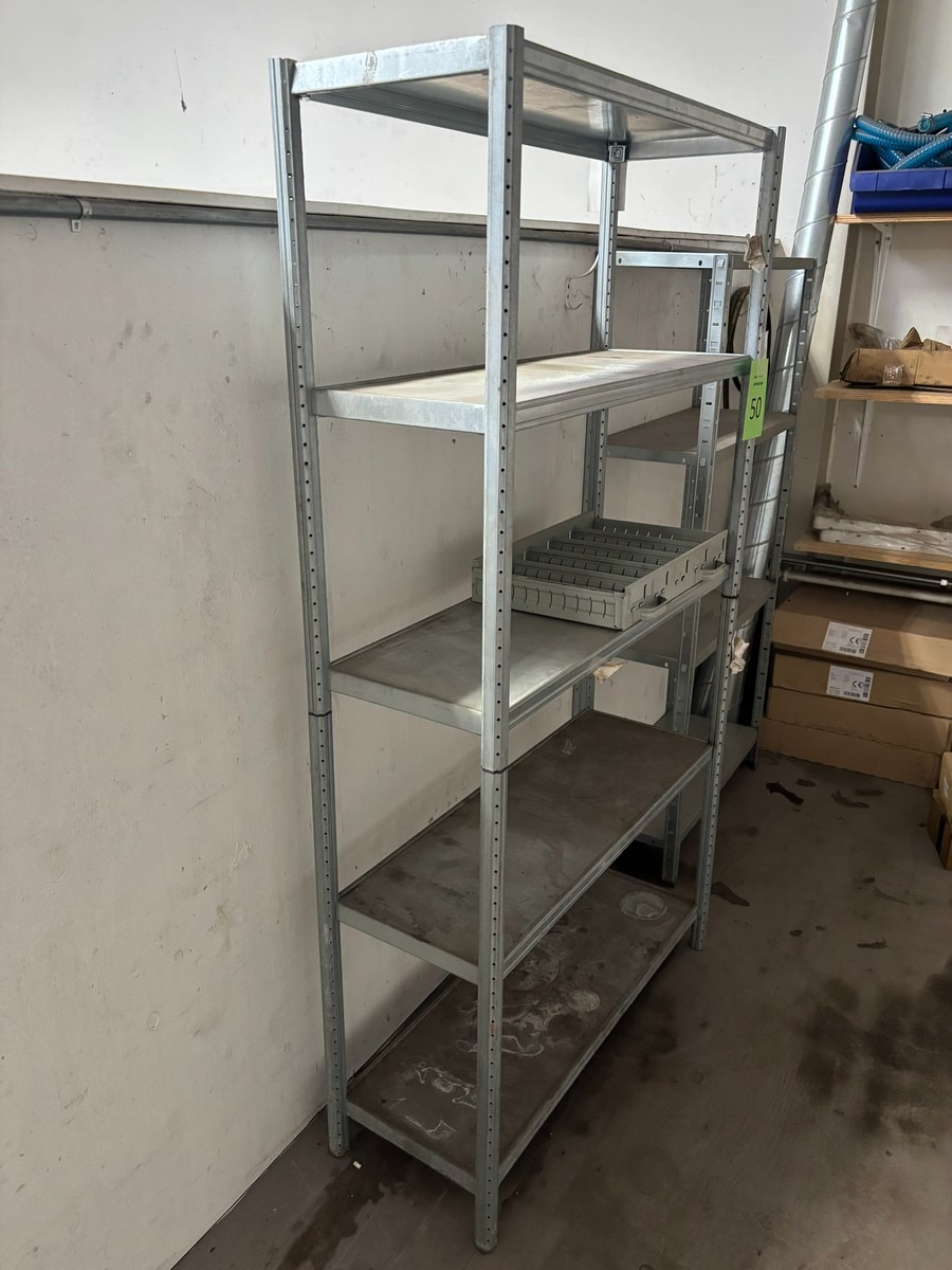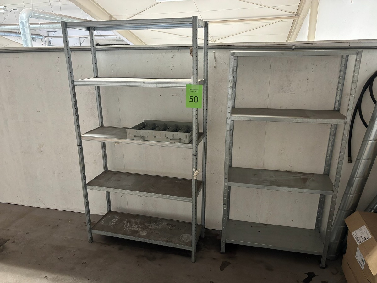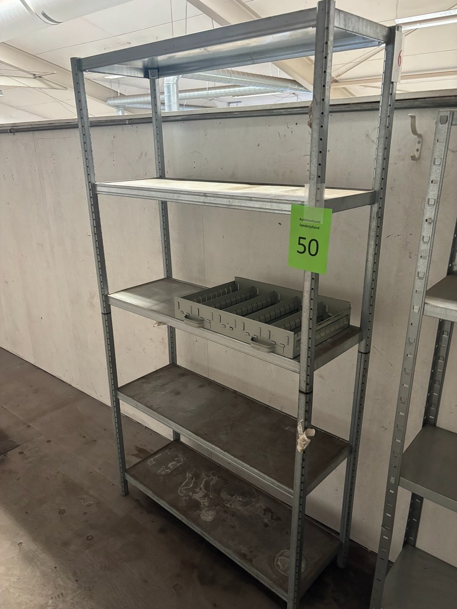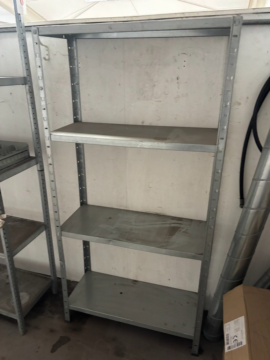 2 stk. metal / værkstedsreoler. Største måler: 92 x 31 x 170 cm. Den ene er skruet fast til væggen og køber skal selv afmontere.