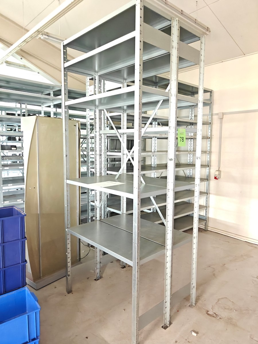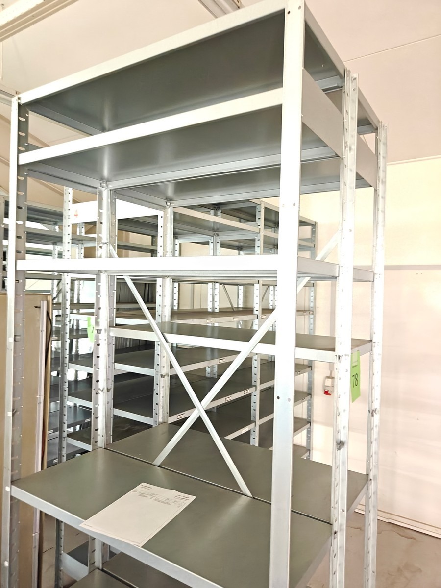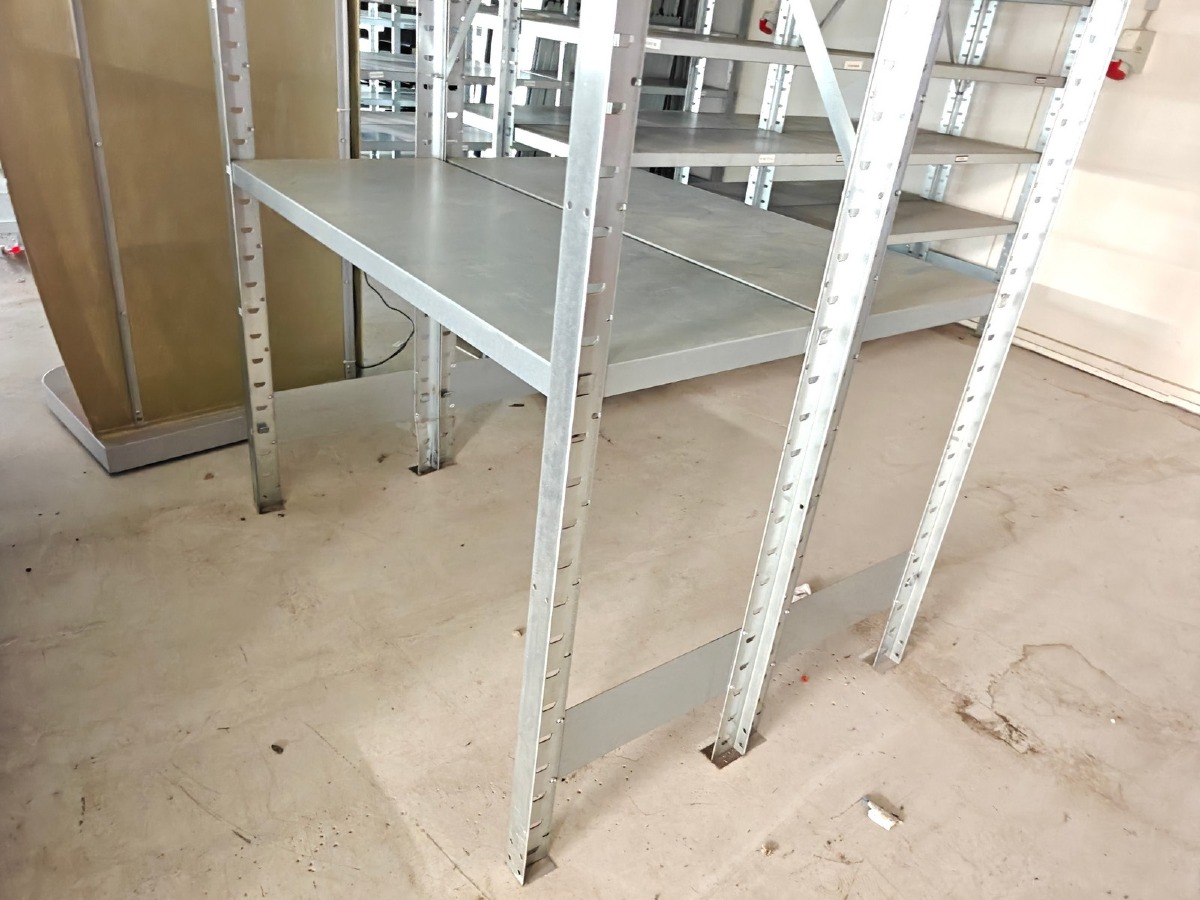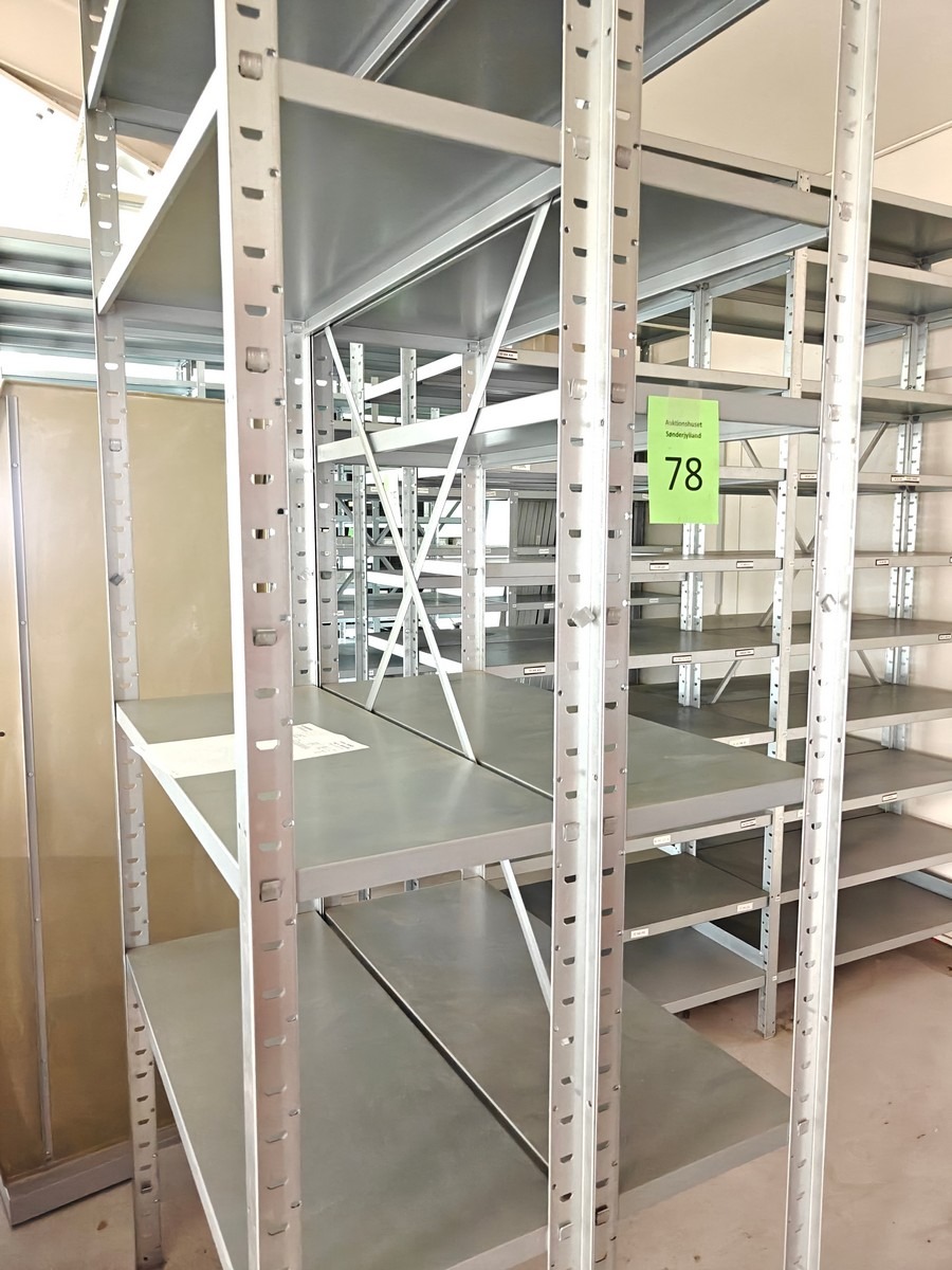 Værkstedsreoler med 2 fag. Hver fag måler ca: 104 x 40 x 250 cm. Uden indhold. Køber skal selv afmontere.