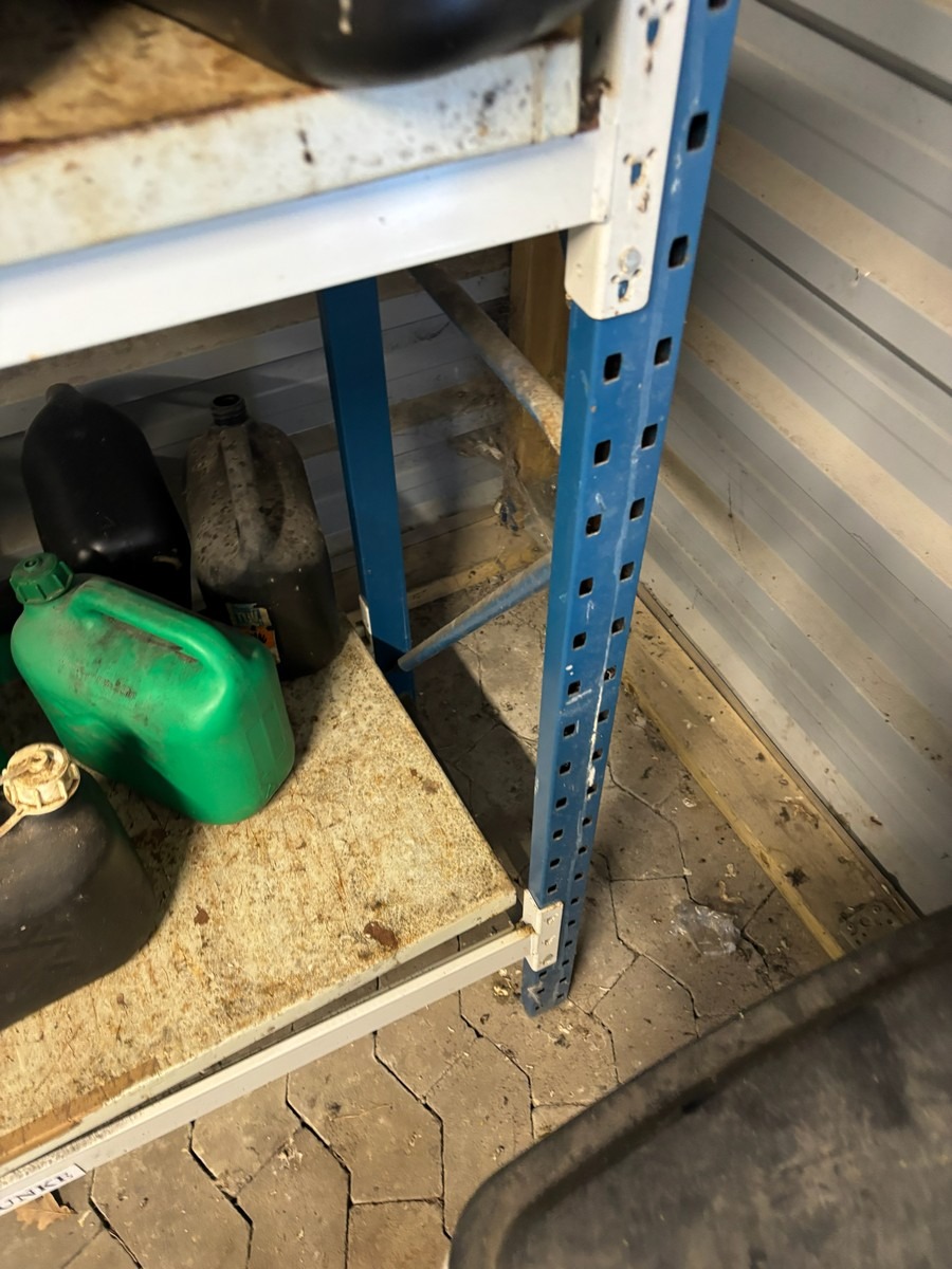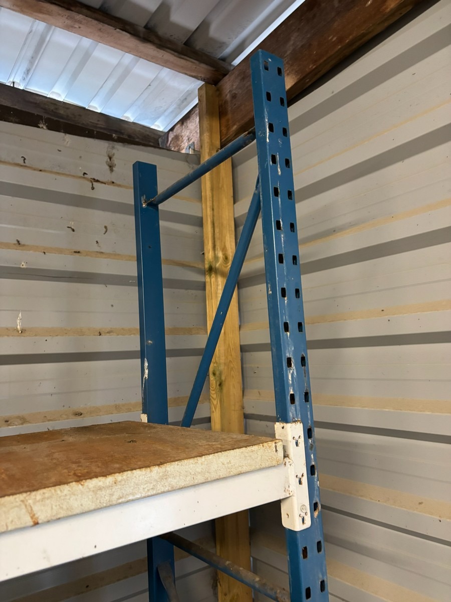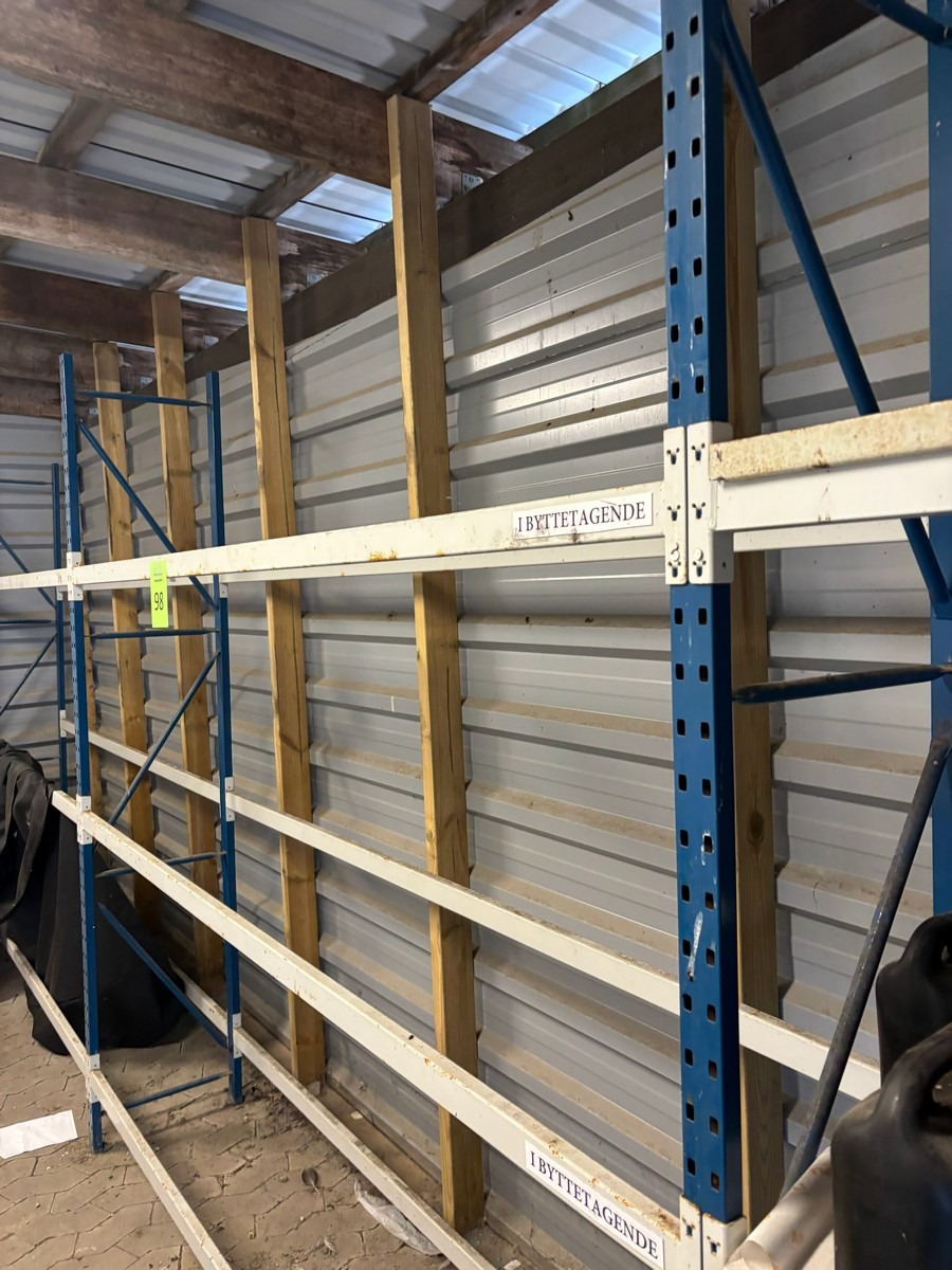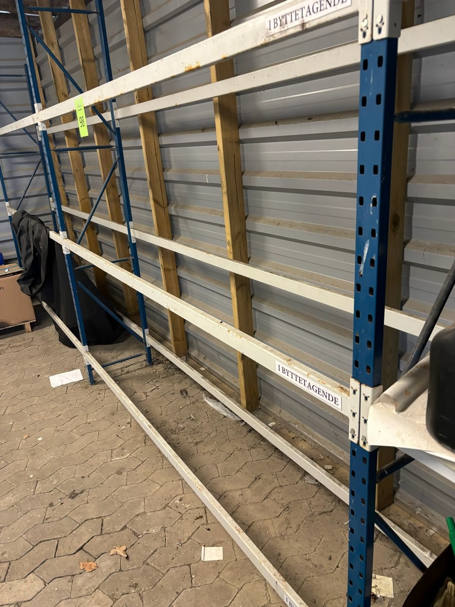 Værkstedsreoler med 3 fag. 45 cm dyb og ca. 230 cm høj. Uden indhold. Køber afmontere selv.