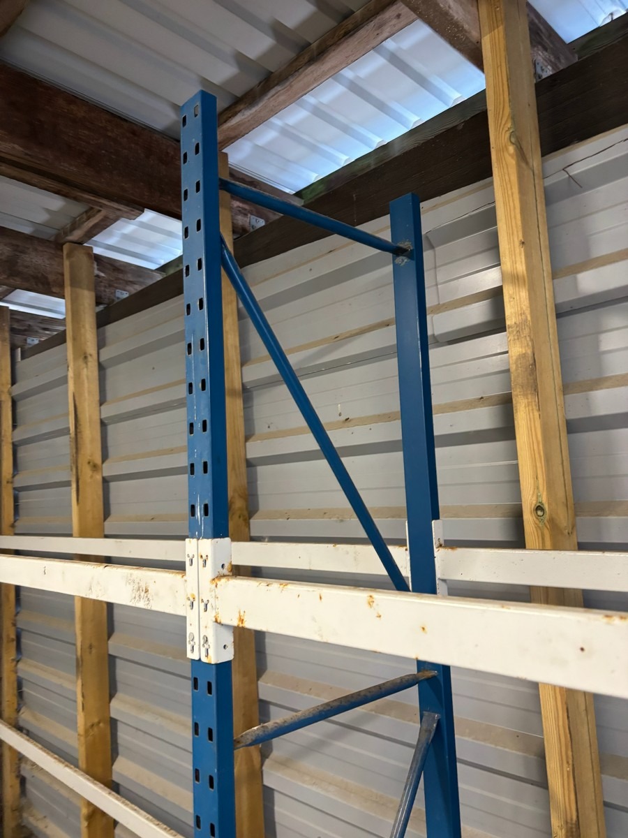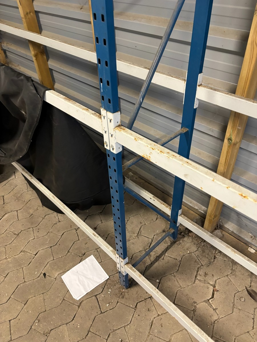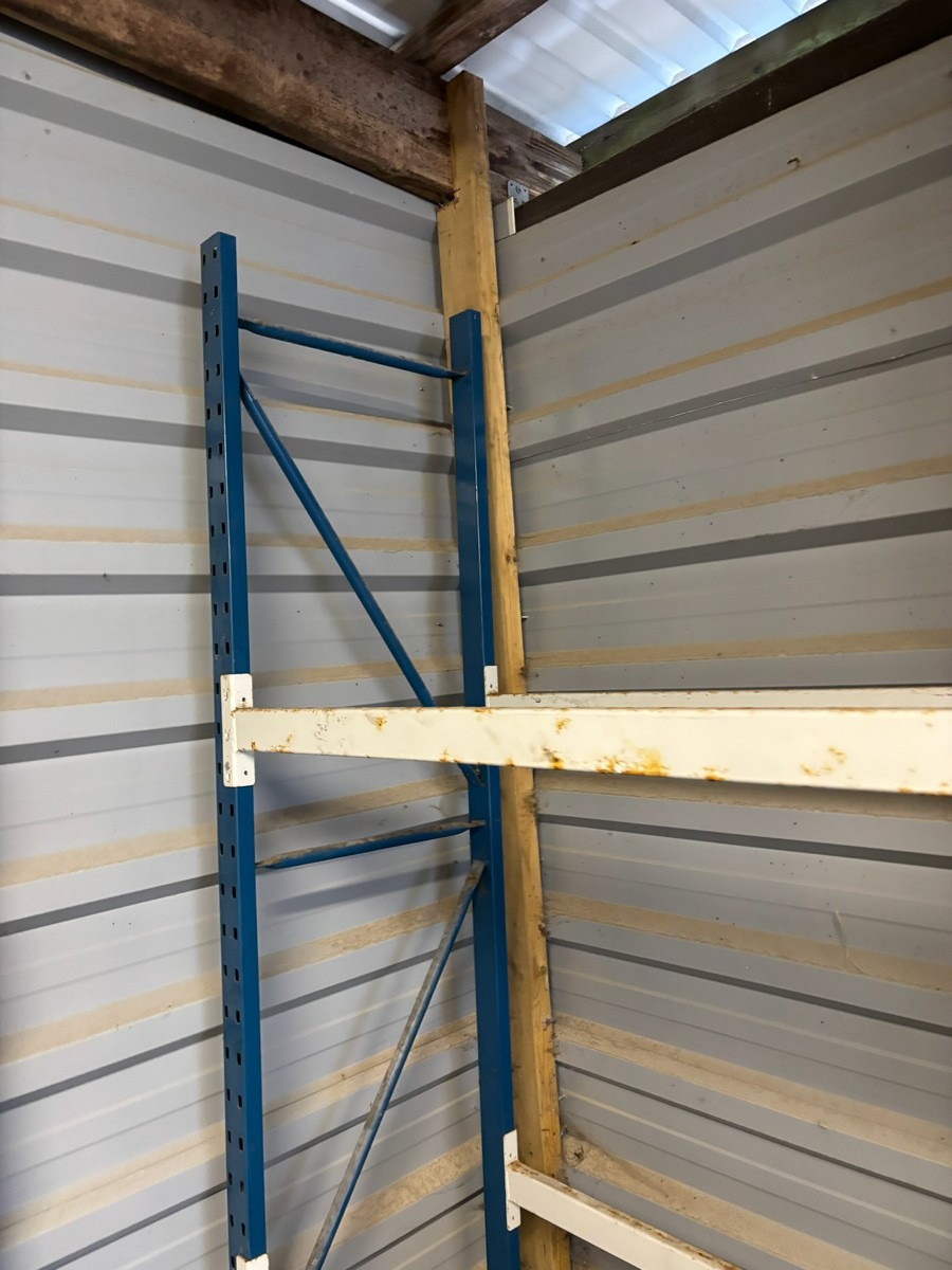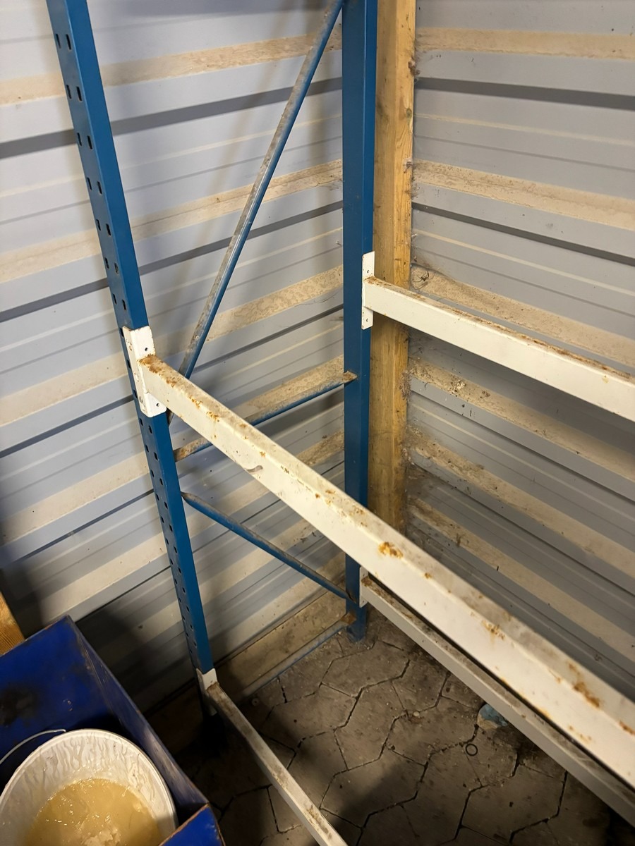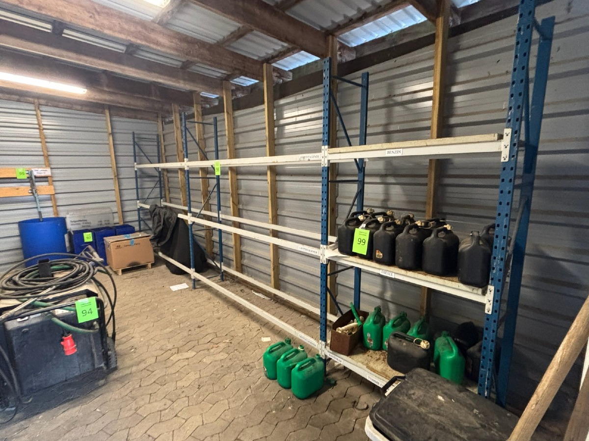 Værkstedsreoler med 3 fag. 45 cm dyb og ca. 230 cm høj. Uden indhold. Køber afmontere selv.