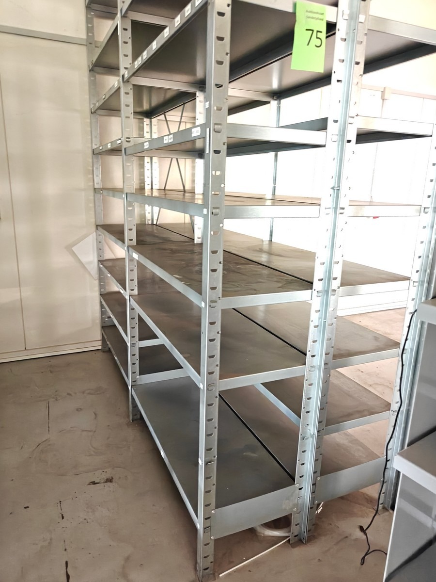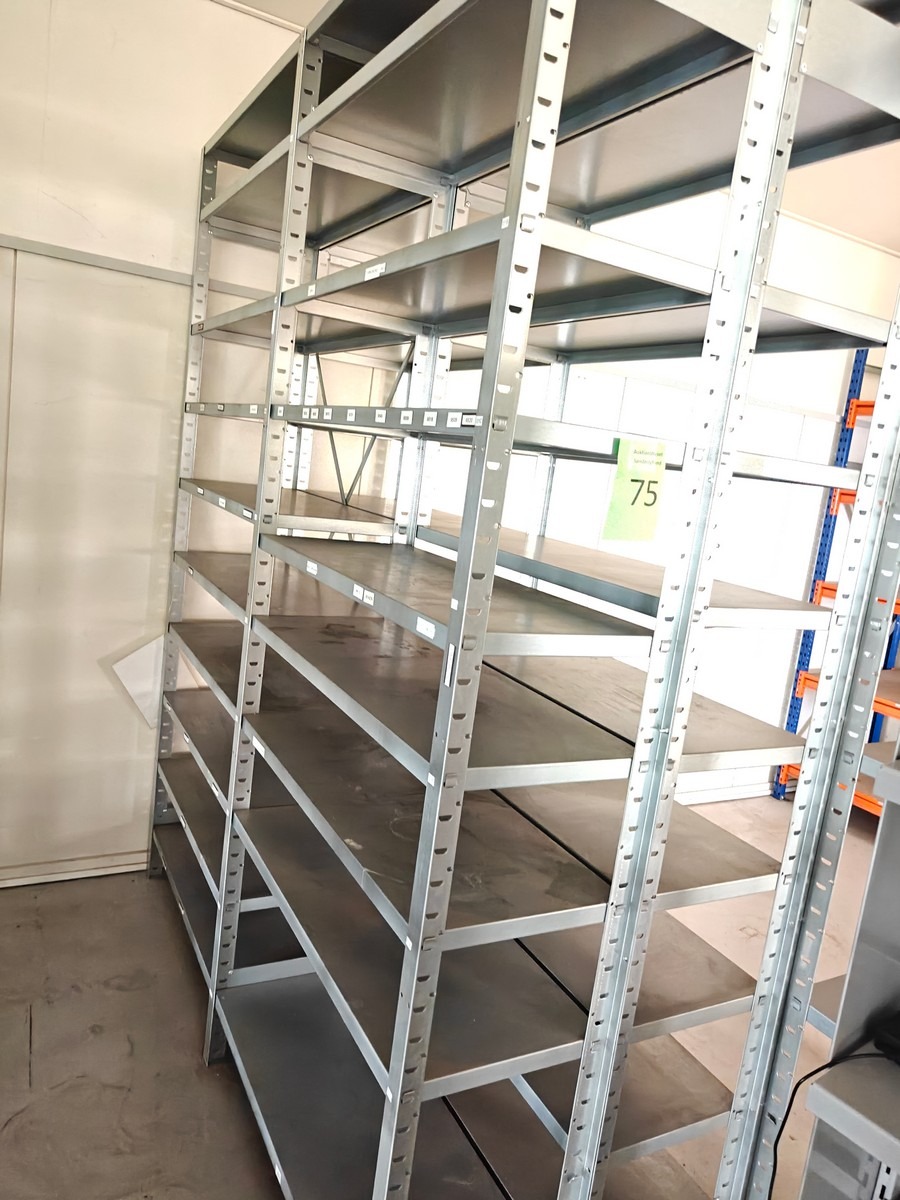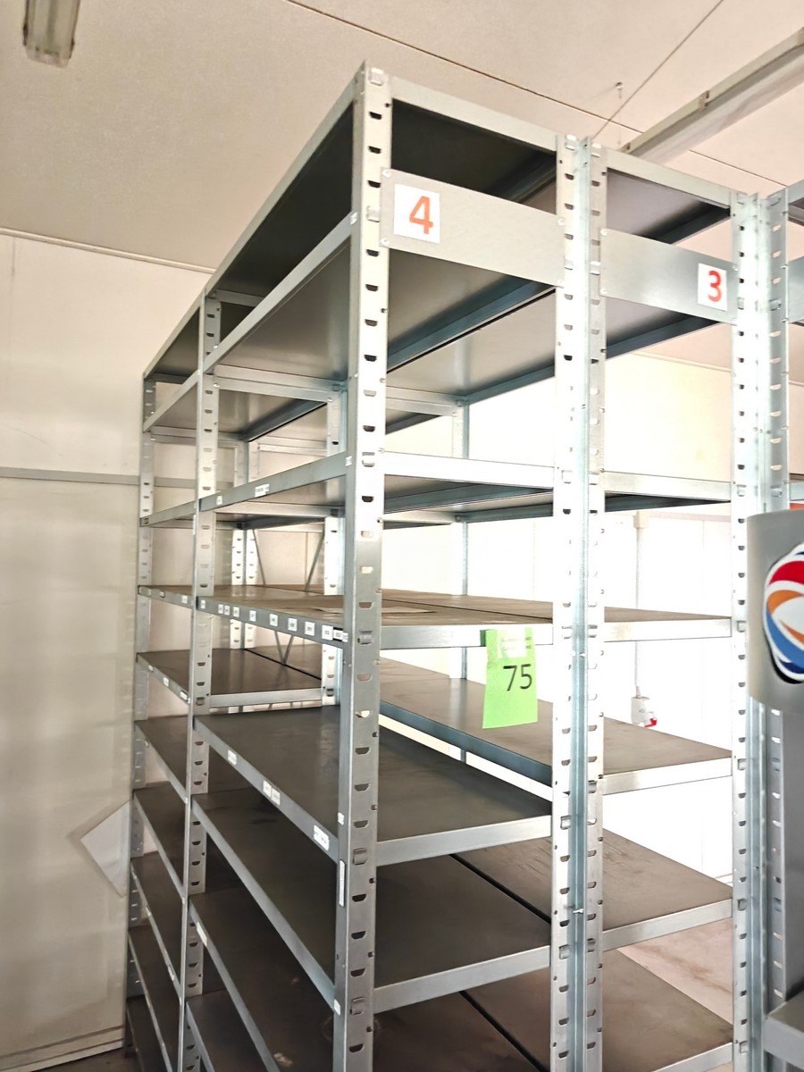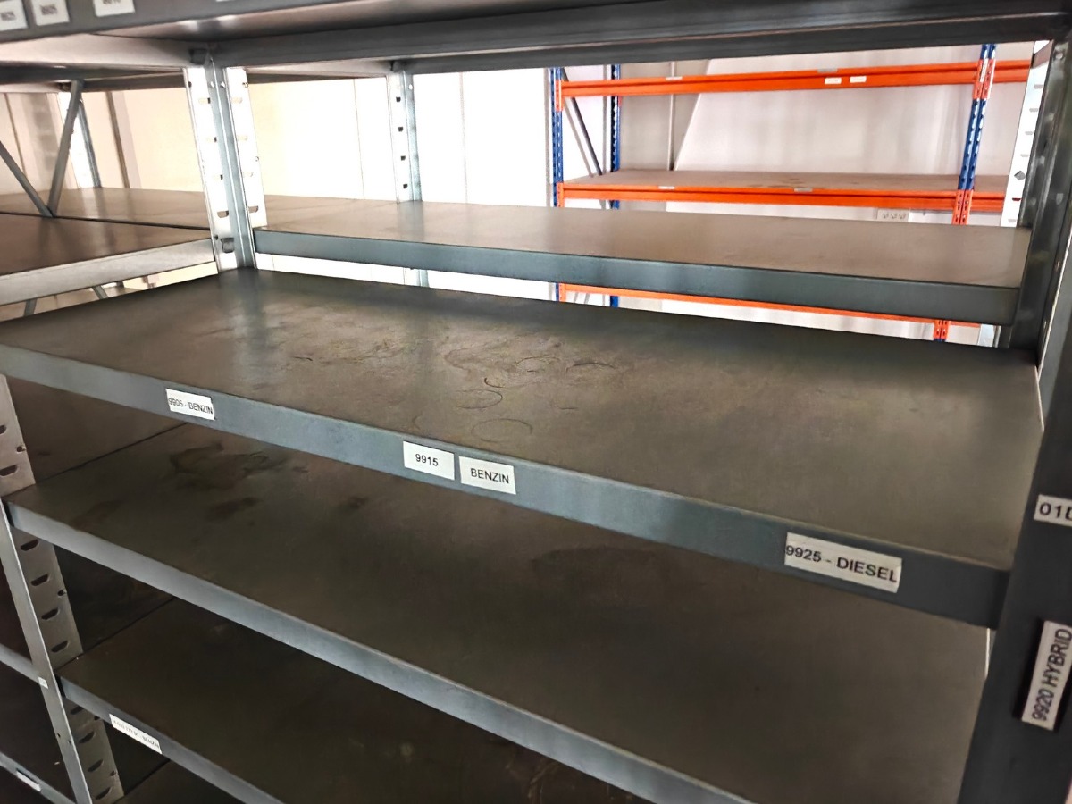 Værkstedsreoler med 4 fag. Hver fag måler ca: 104 x 40 x 250 cm. Uden indhold. Køber skal selv afmontere.