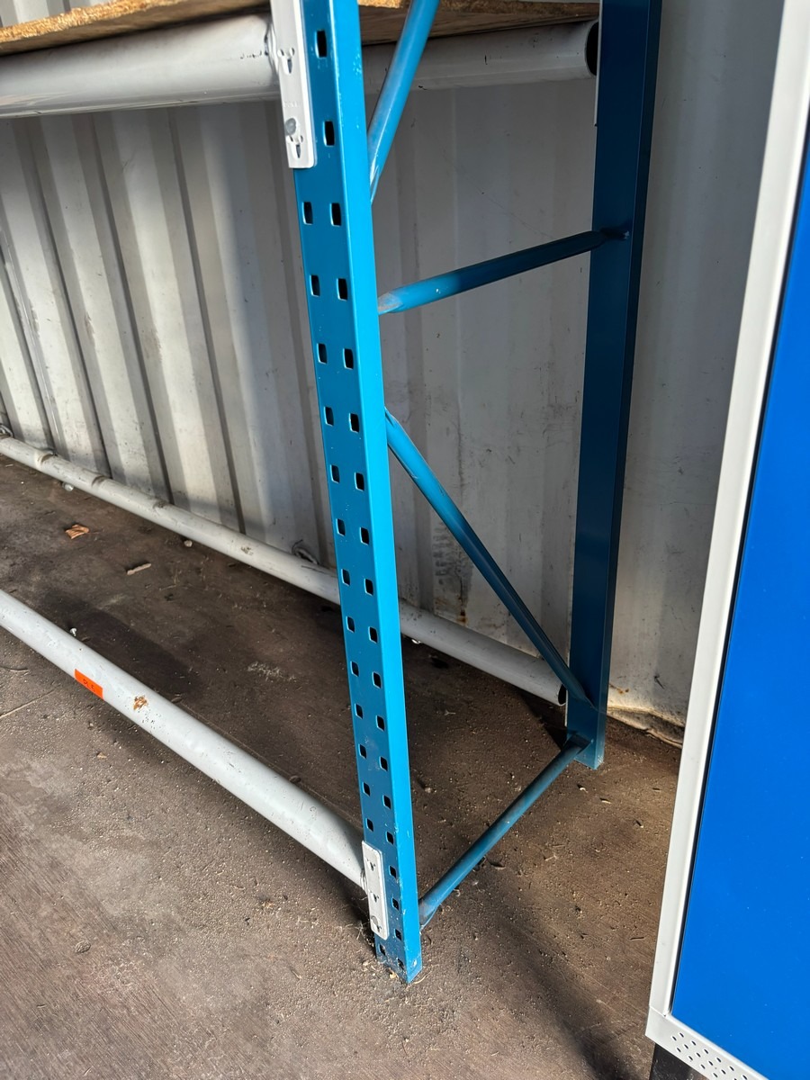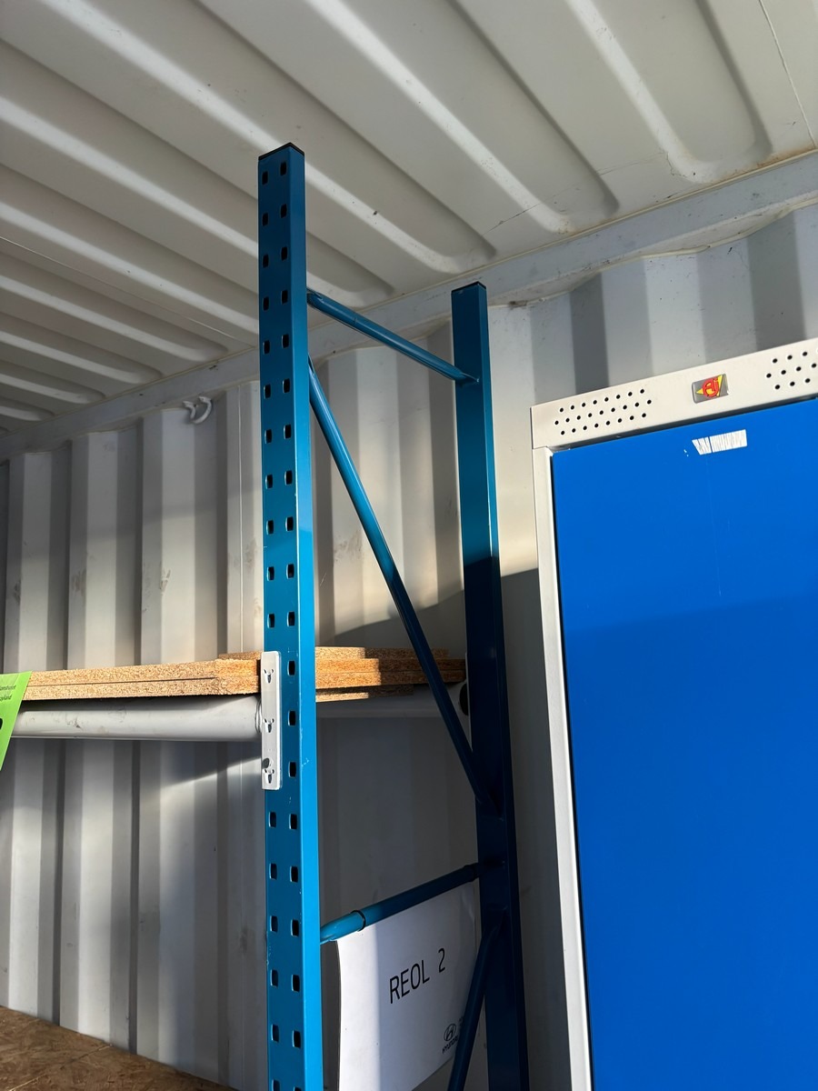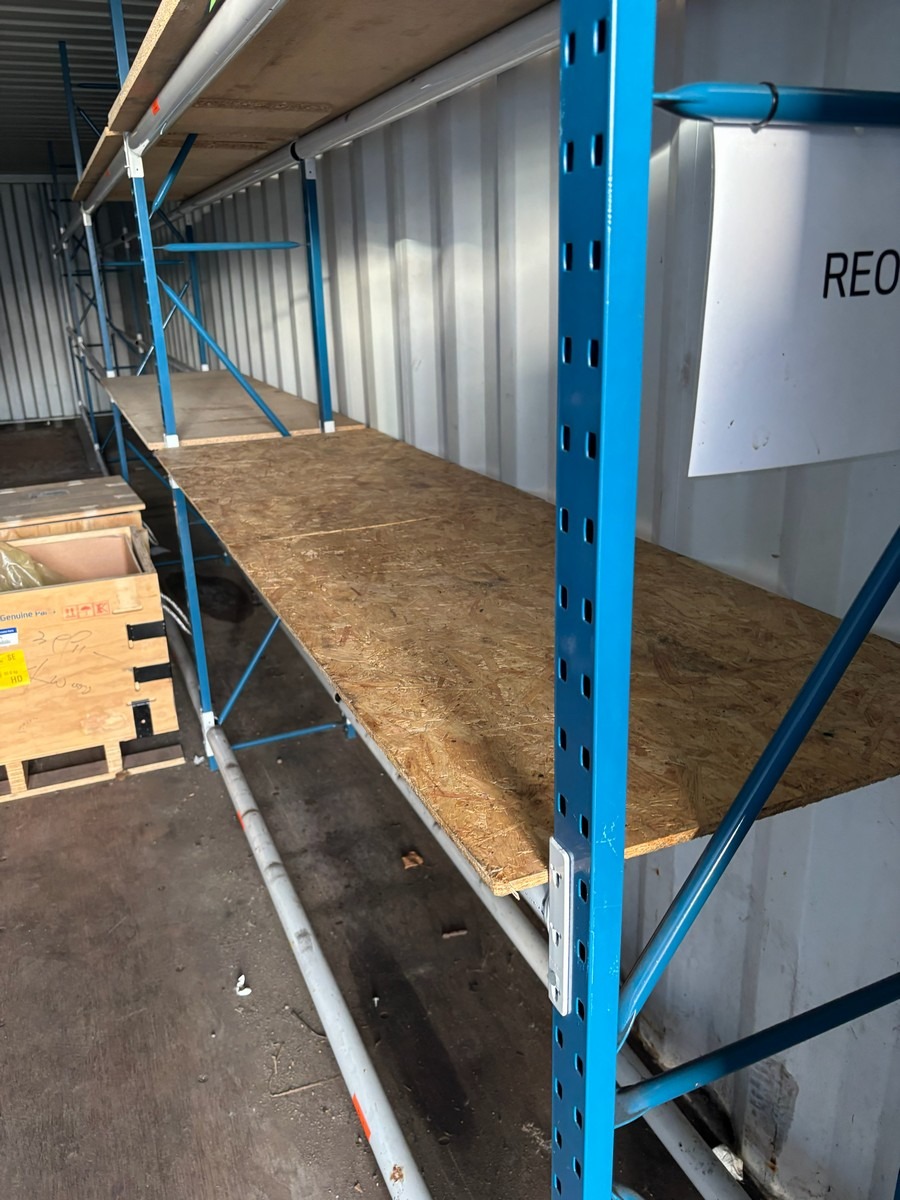Værkstedsreoler med 4 fag. Hver fag måler: 45 x 307 x 225 cm. Køber skal selv afmontere.