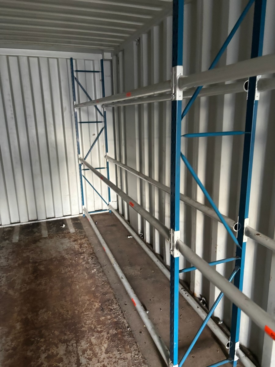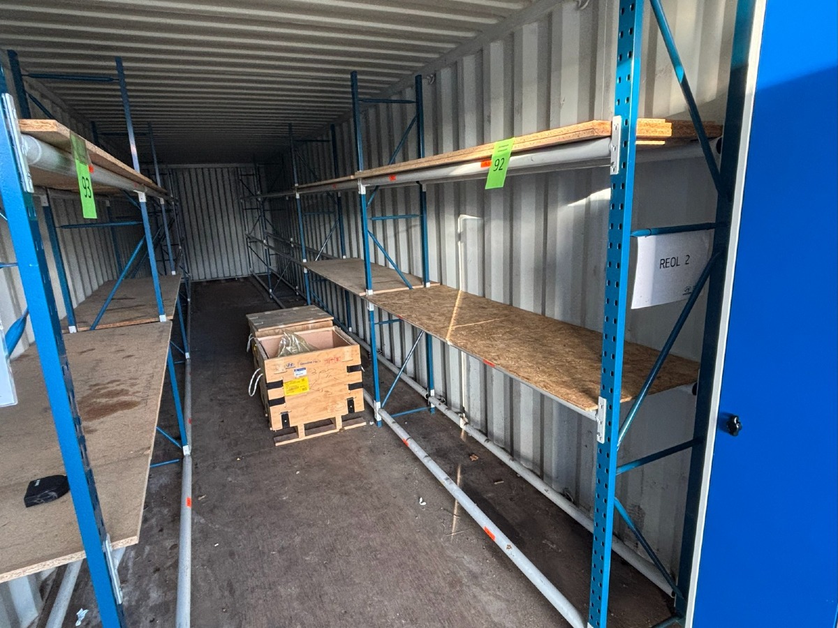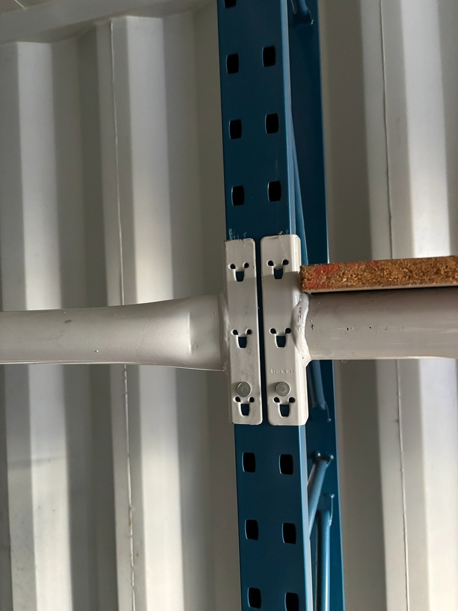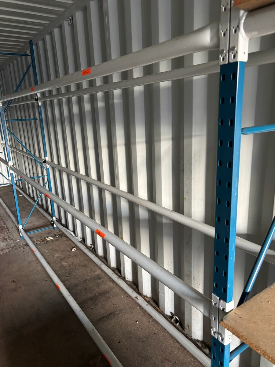 Værkstedsreoler med 4 fag. Hver fag måler: 45 x 307 x 225 cm. Køber skal selv afmontere.
