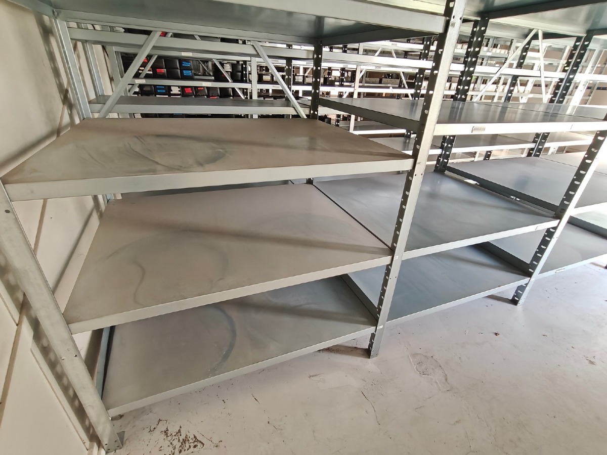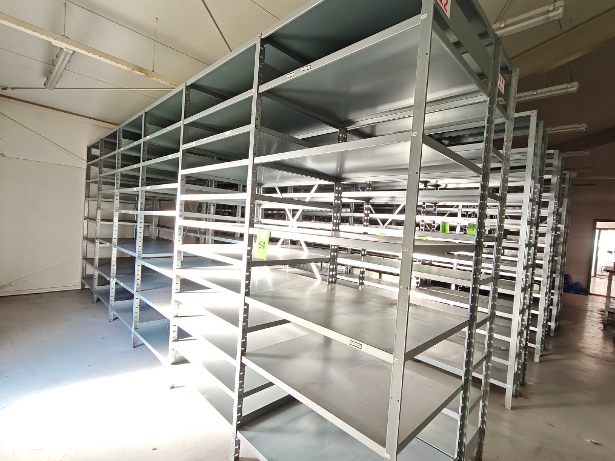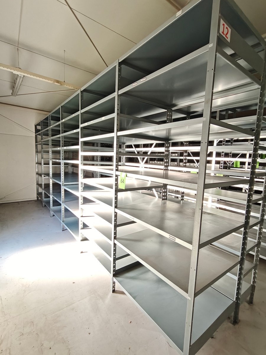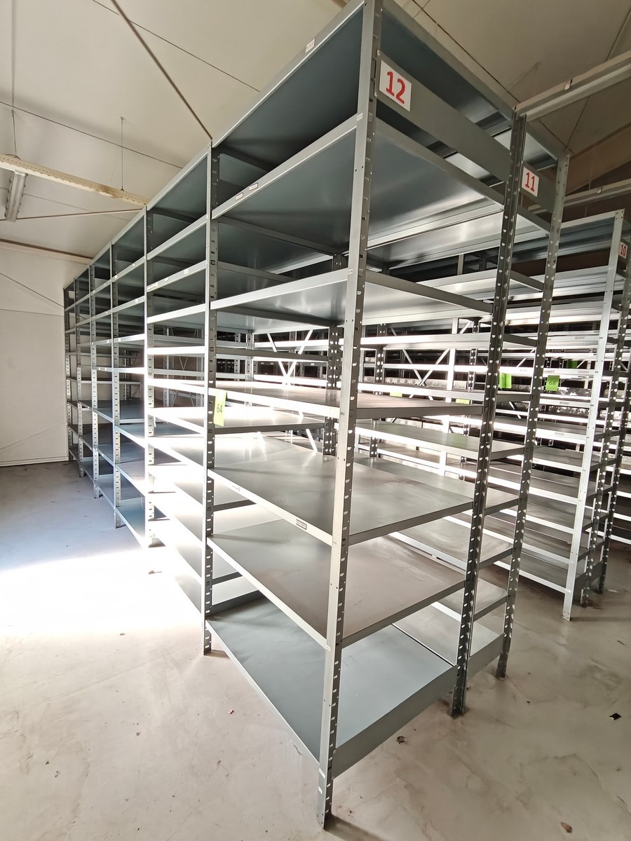 Værkstedsreoler med 6 fag. Hver fag måler ca: 104 x 80 x 250 cm. Køber skal selv afmontere.