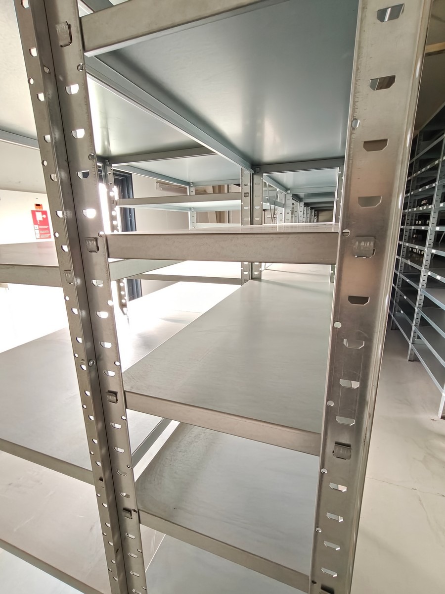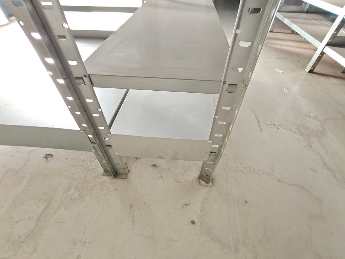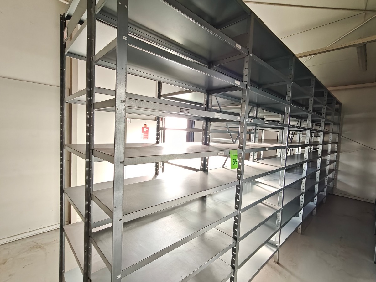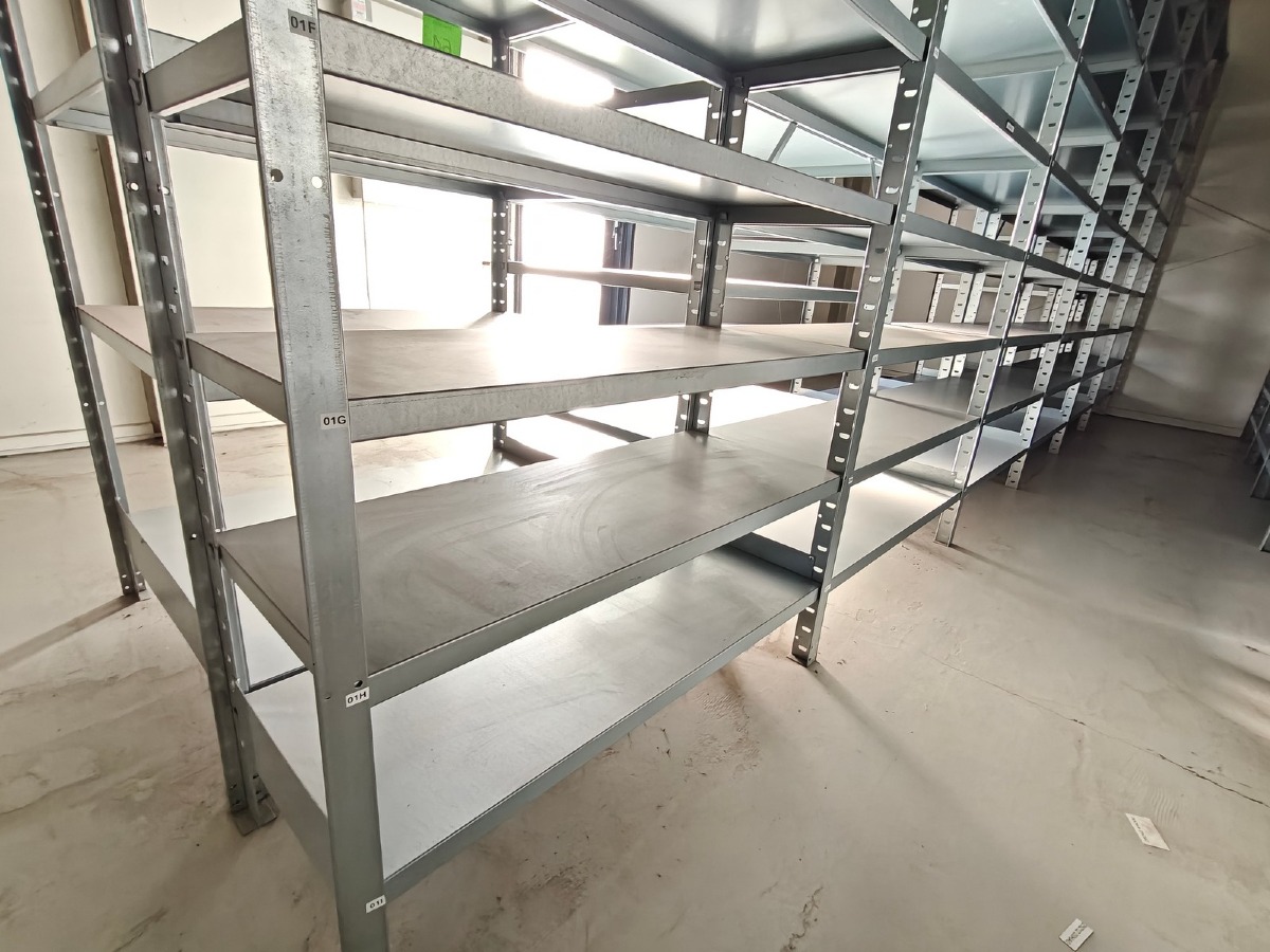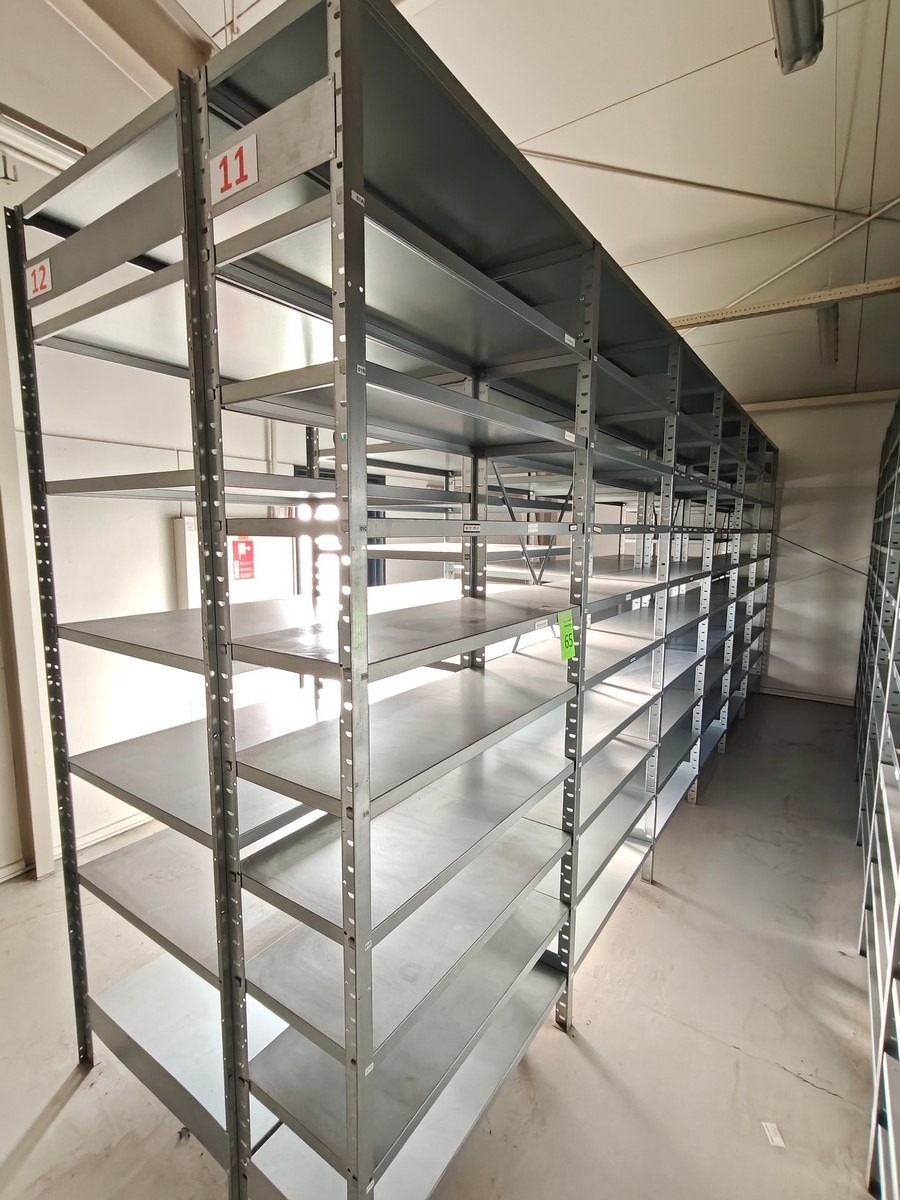 Værkstedsreoler med 6 fag. Hver fag måler ca: 104 x 40 x 250 cm. Køber skal selv afmontere.